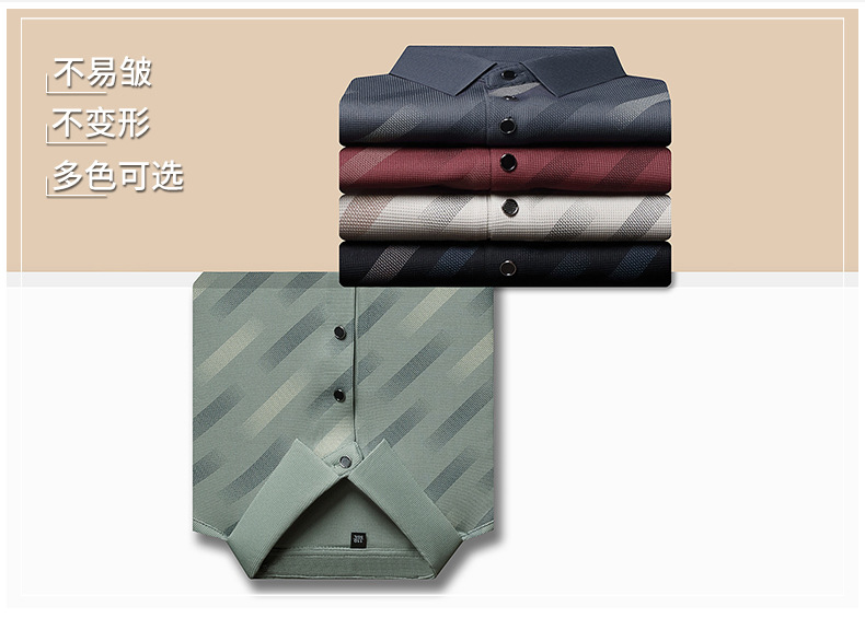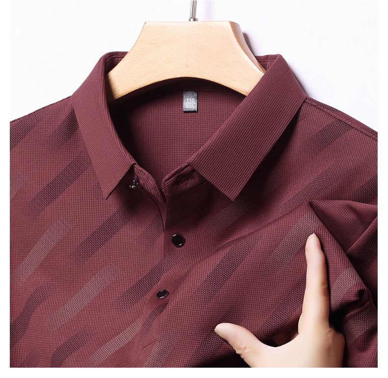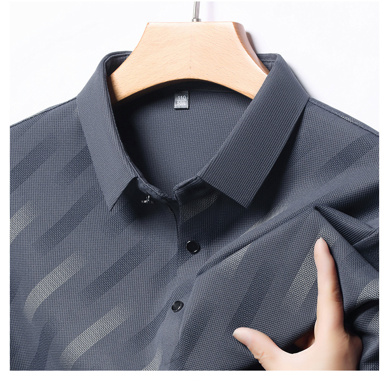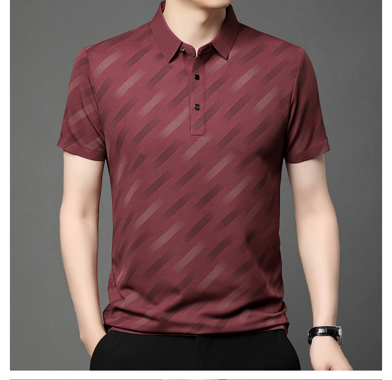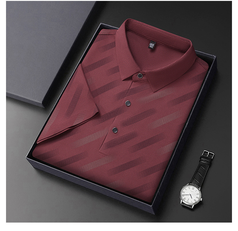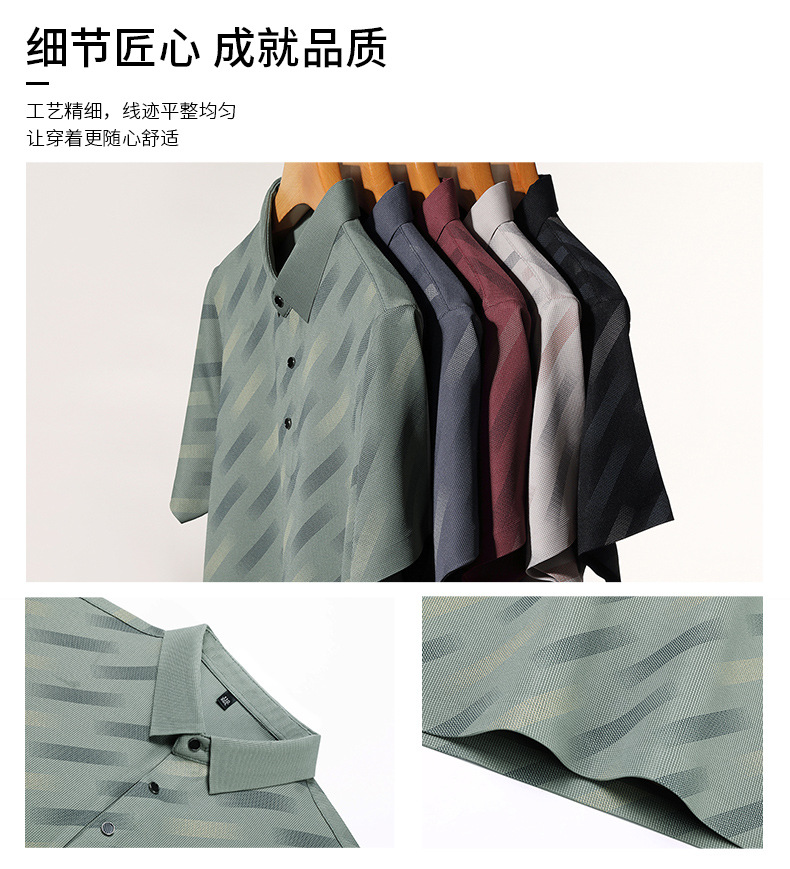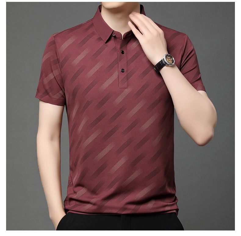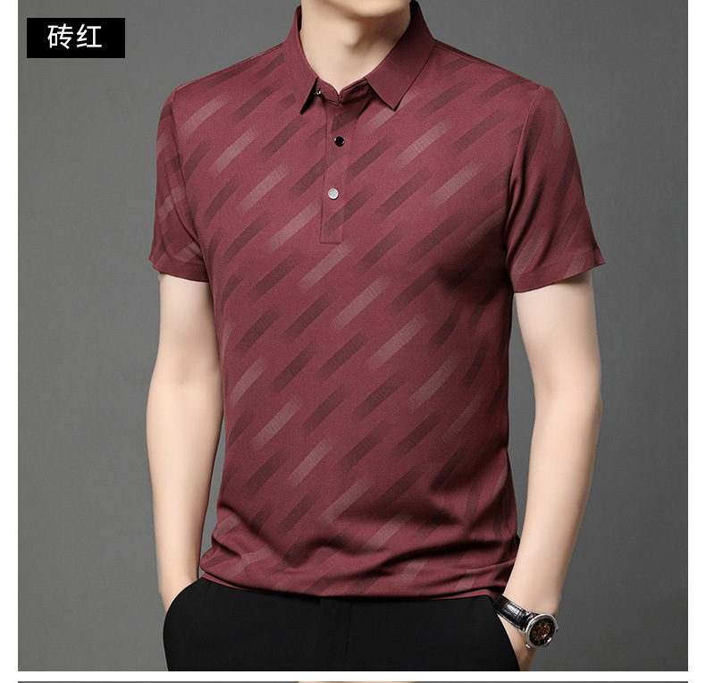 남성용 라이브 방송 인기 아이스 실크 반팔 티셔츠 남성용 여름 신작 캐주얼 스트라이프 프린트 라펠 반팔 폴로 셔츠