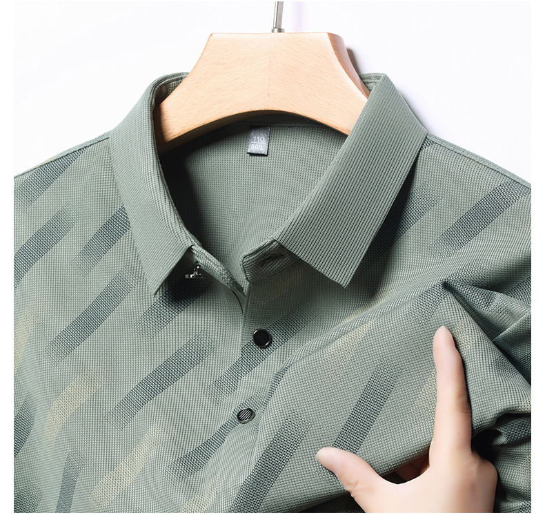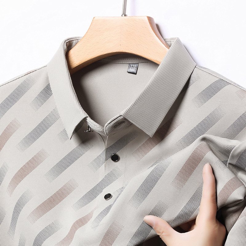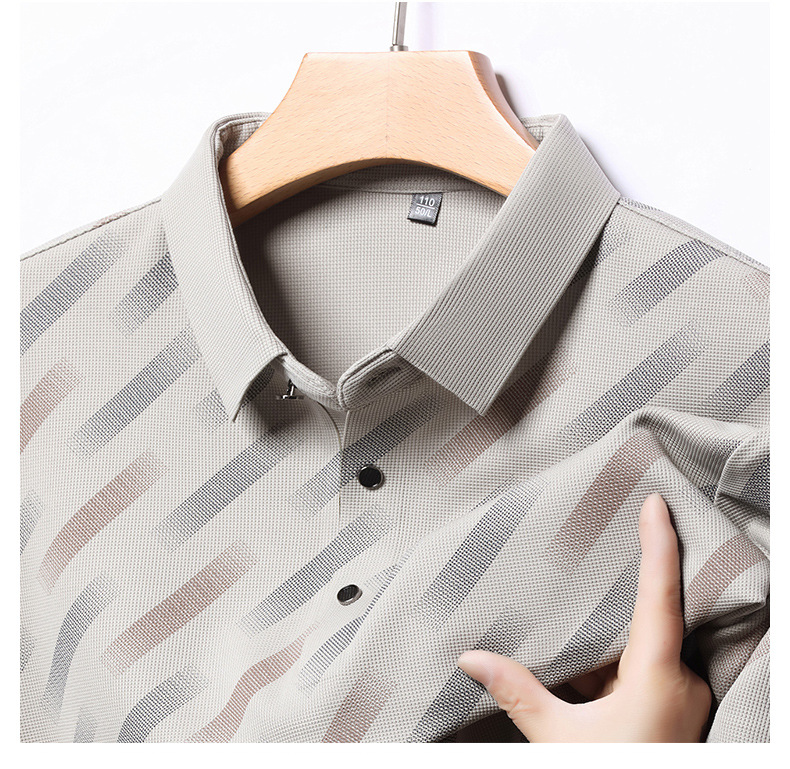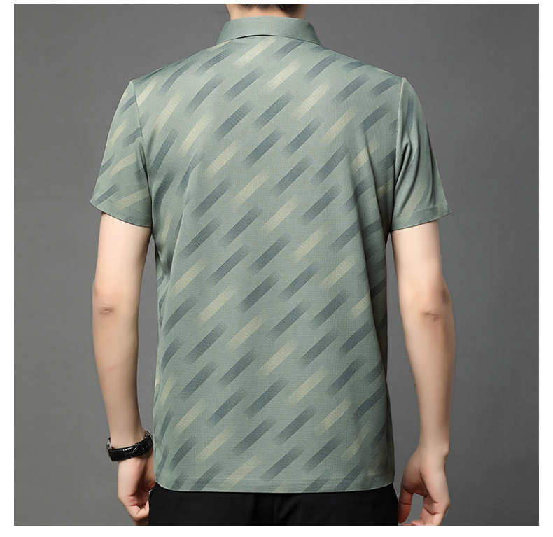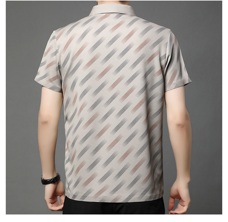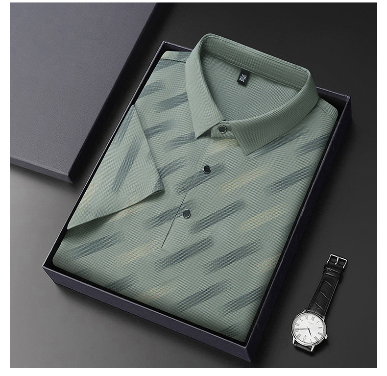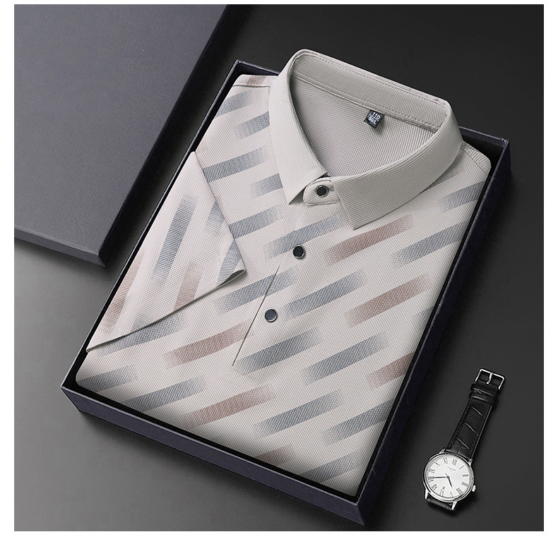 남성용 라이브 방송 인기 아이스 실크 반팔 티셔츠 남성용 여름 신작 캐주얼 스트라이프 프린트 라펠 반팔 폴로 셔츠스토어 가기