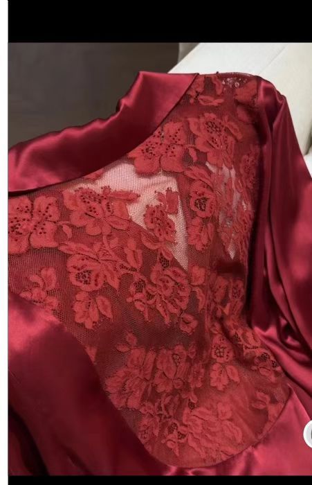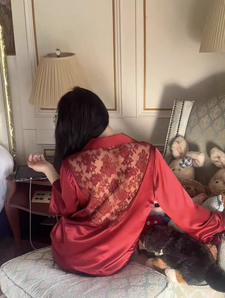 여성용 고급 패션 아이스 실크 잠옷, 화이트 문라이트 봄 홈웨어, 레이스 아름다운 등 디자인, 긴팔 긴바지 투피스 세트 도매