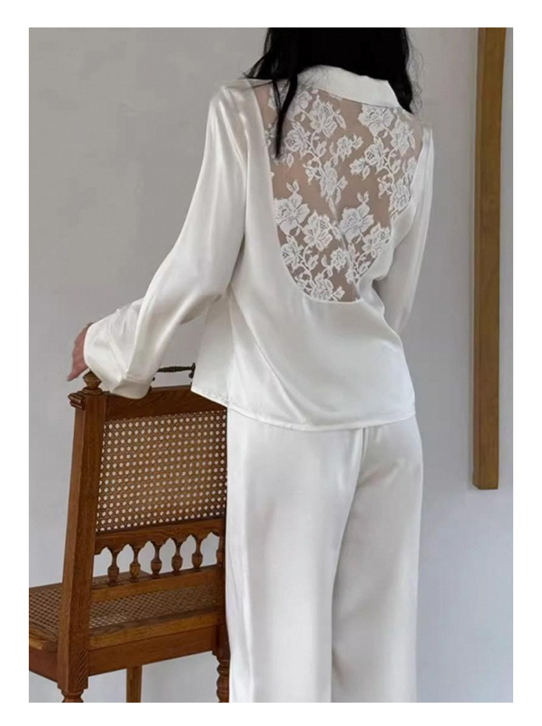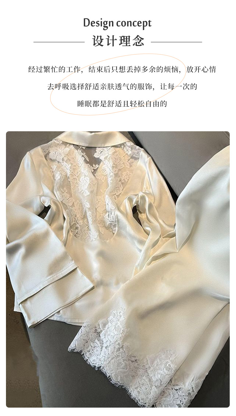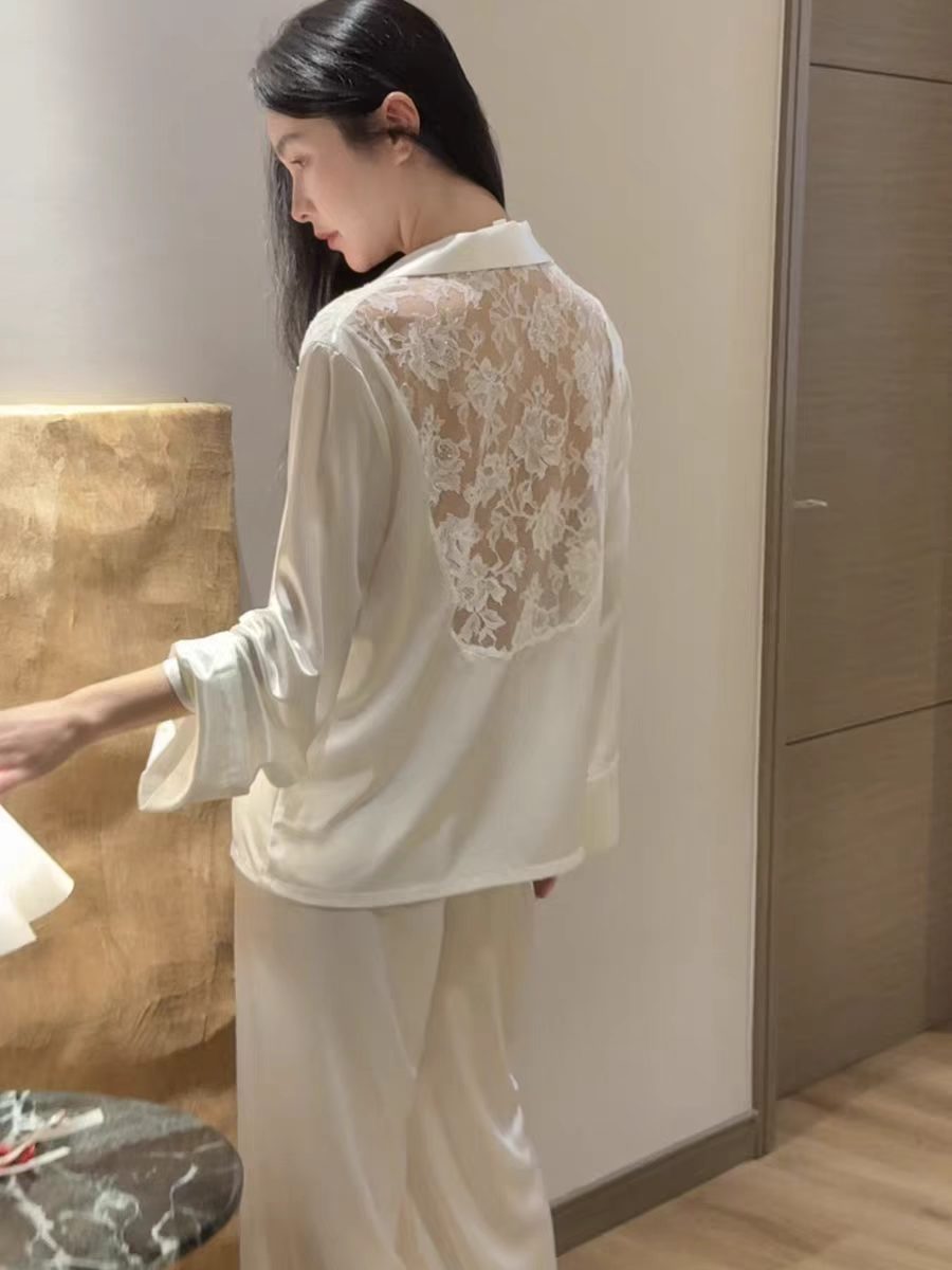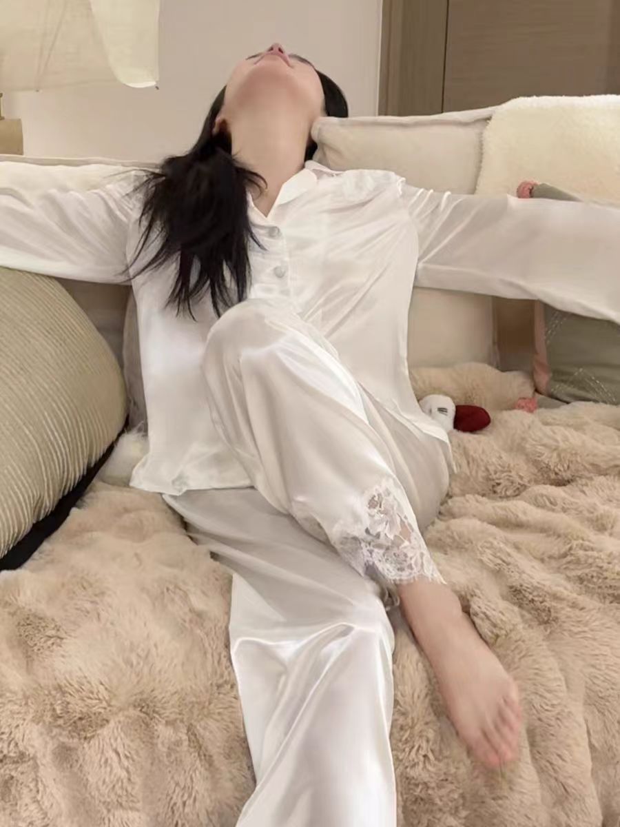 여성용 고급 패션 아이스 실크 잠옷, 화이트 문라이트 봄 홈웨어, 레이스 아름다운 등 디자인, 긴팔 긴바지 투피스 세트 도매스토어 가기