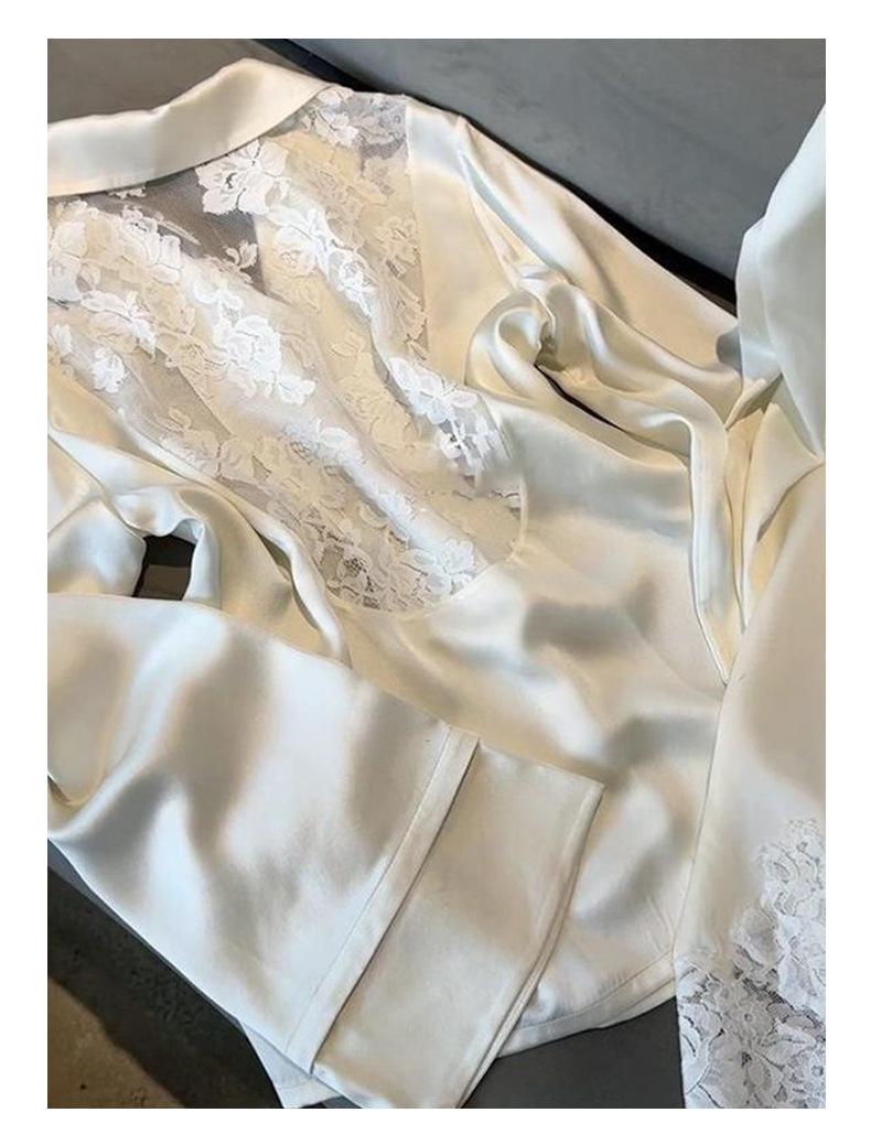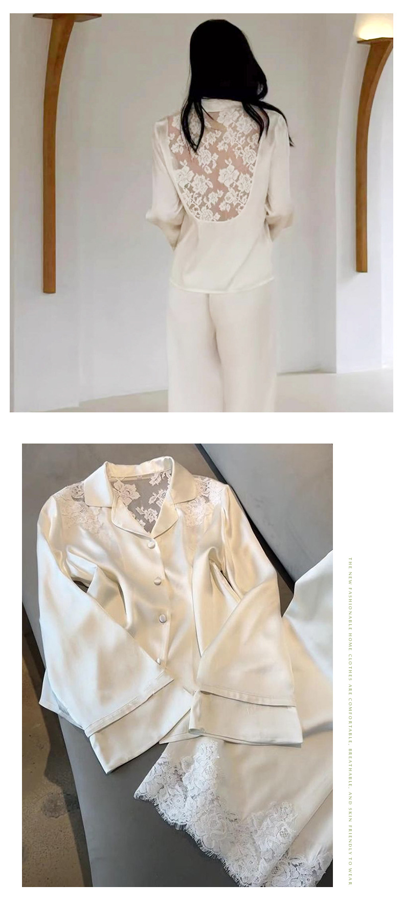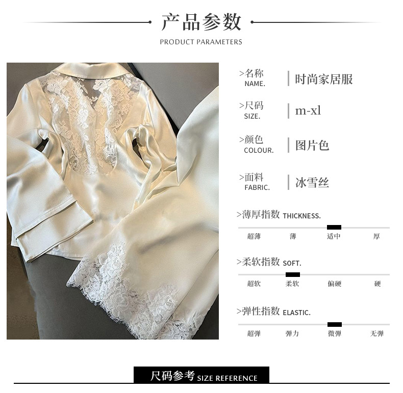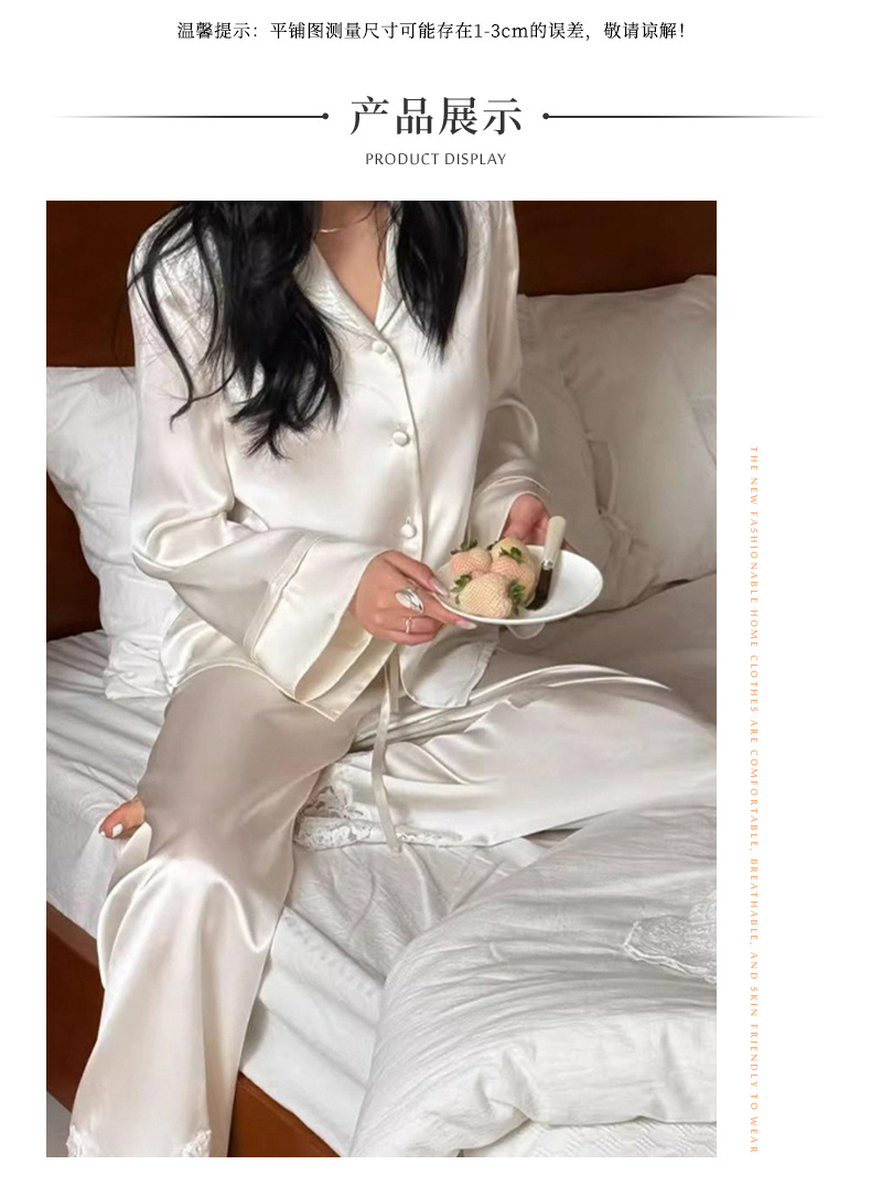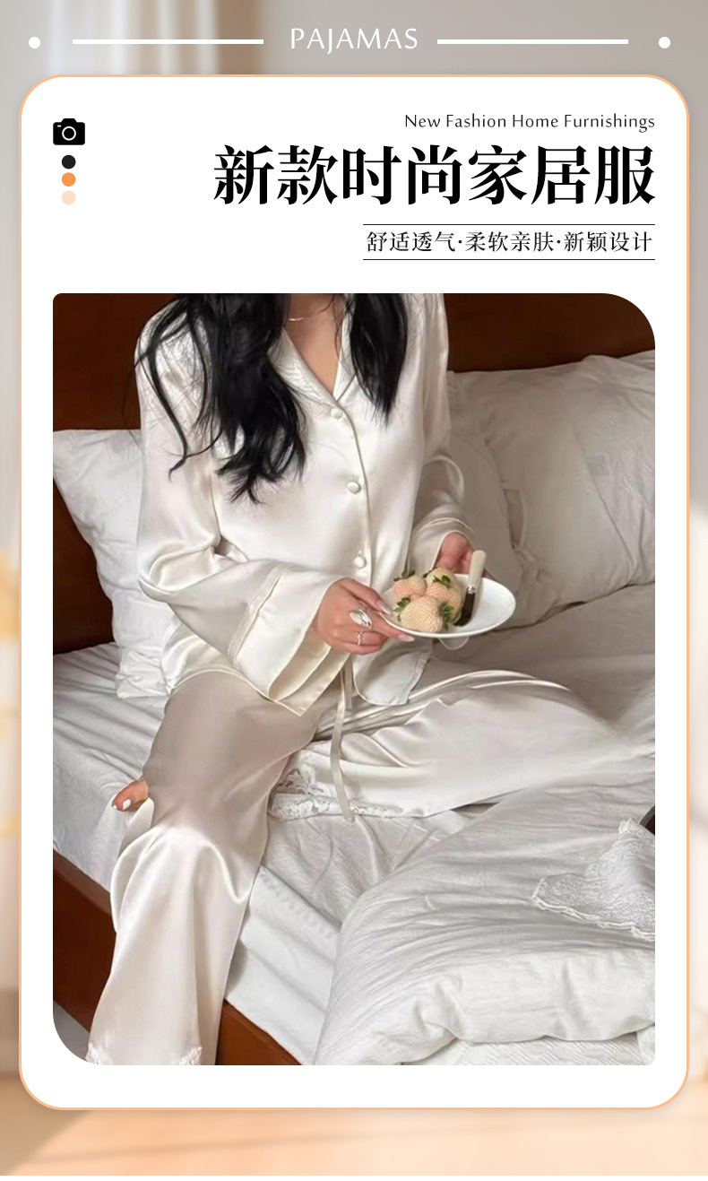 여성용 고급 패션 아이스 실크 잠옷, 화이트 문라이트 봄 홈웨어, 레이스 아름다운 등 디자인, 긴팔 긴바지 투피스 세트 도매스토어 가기