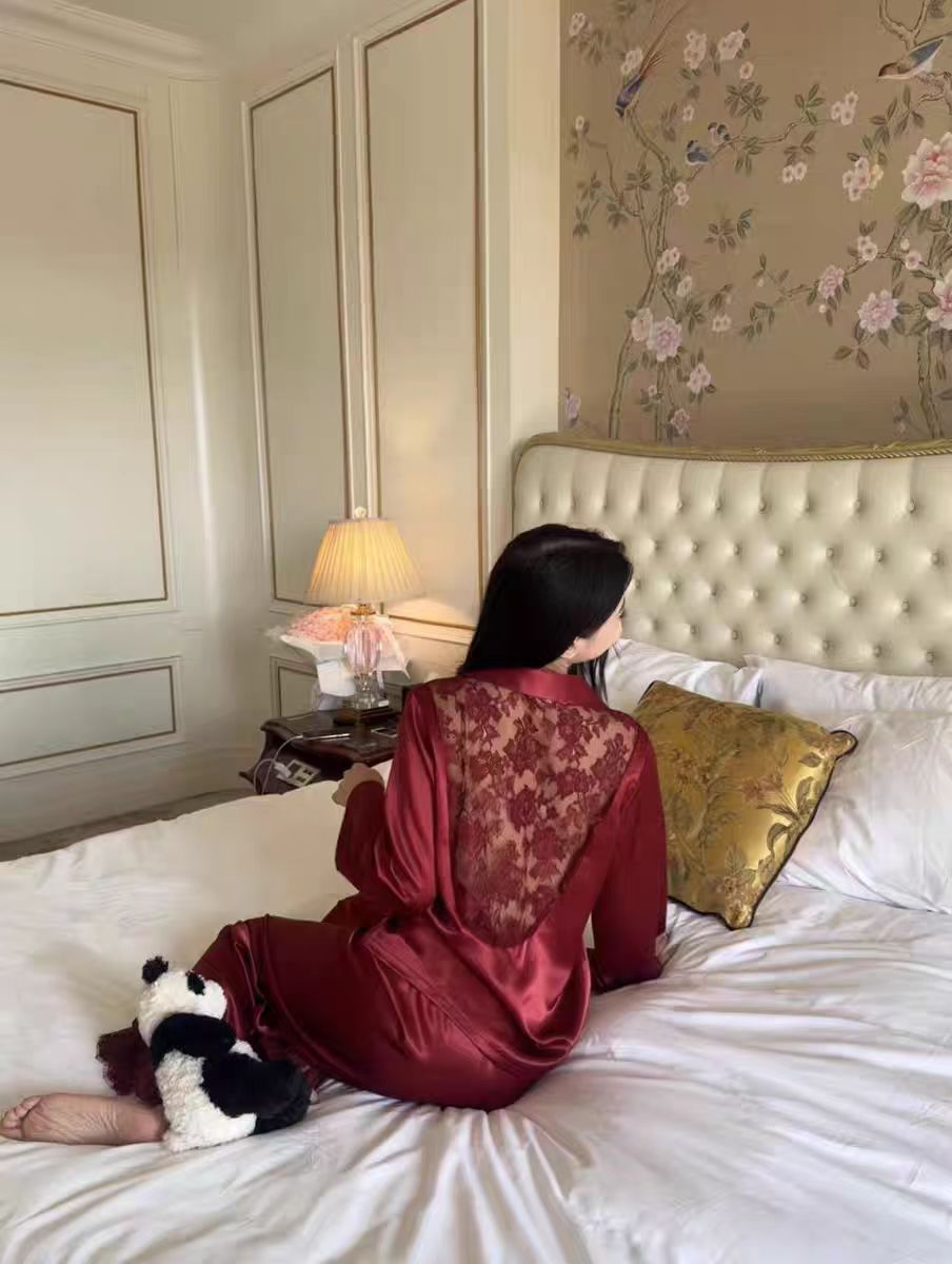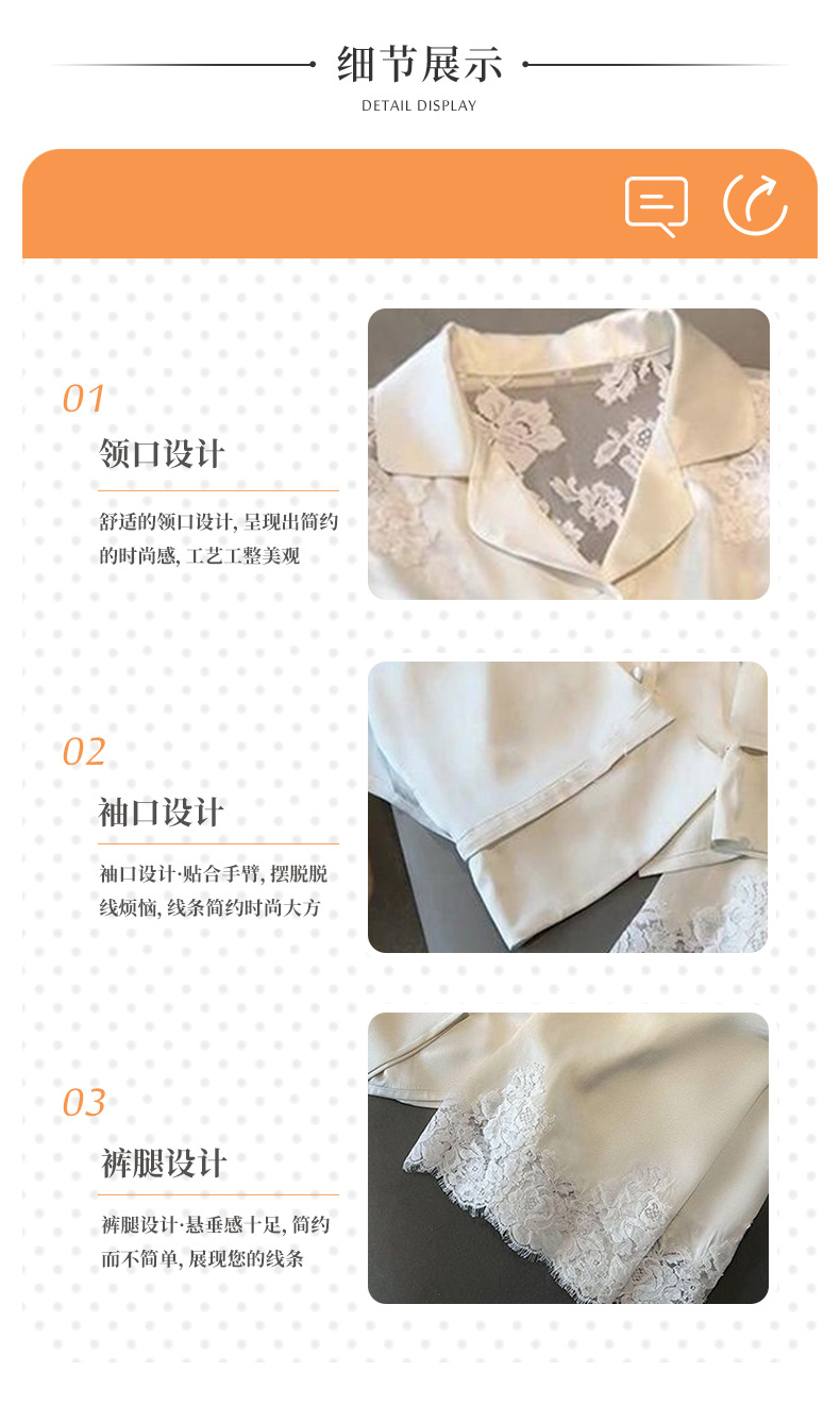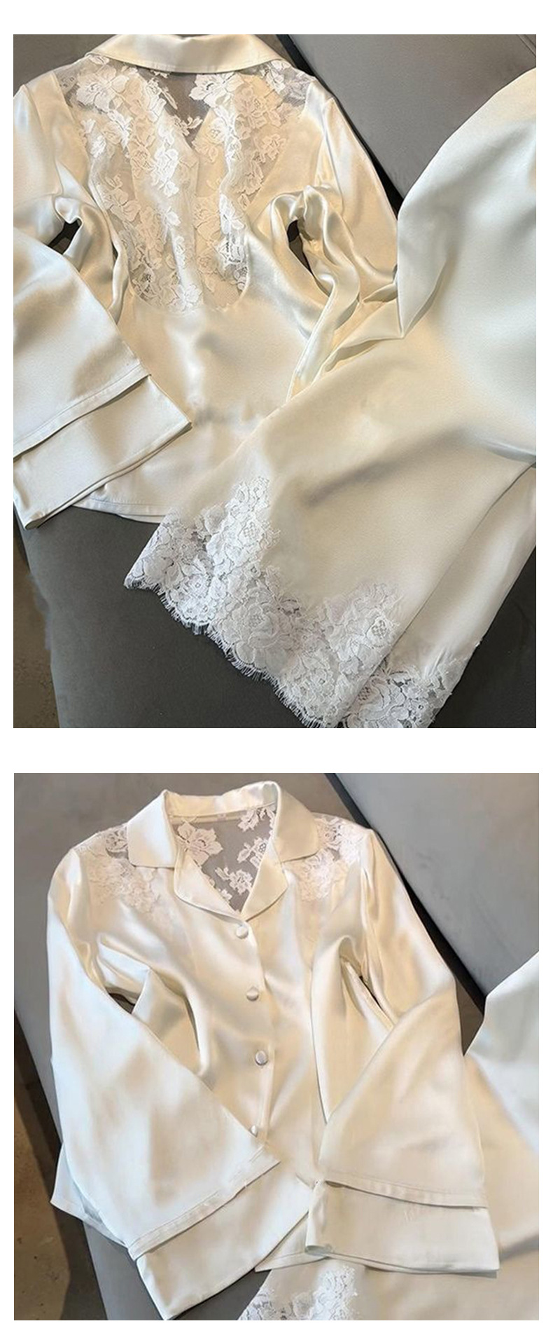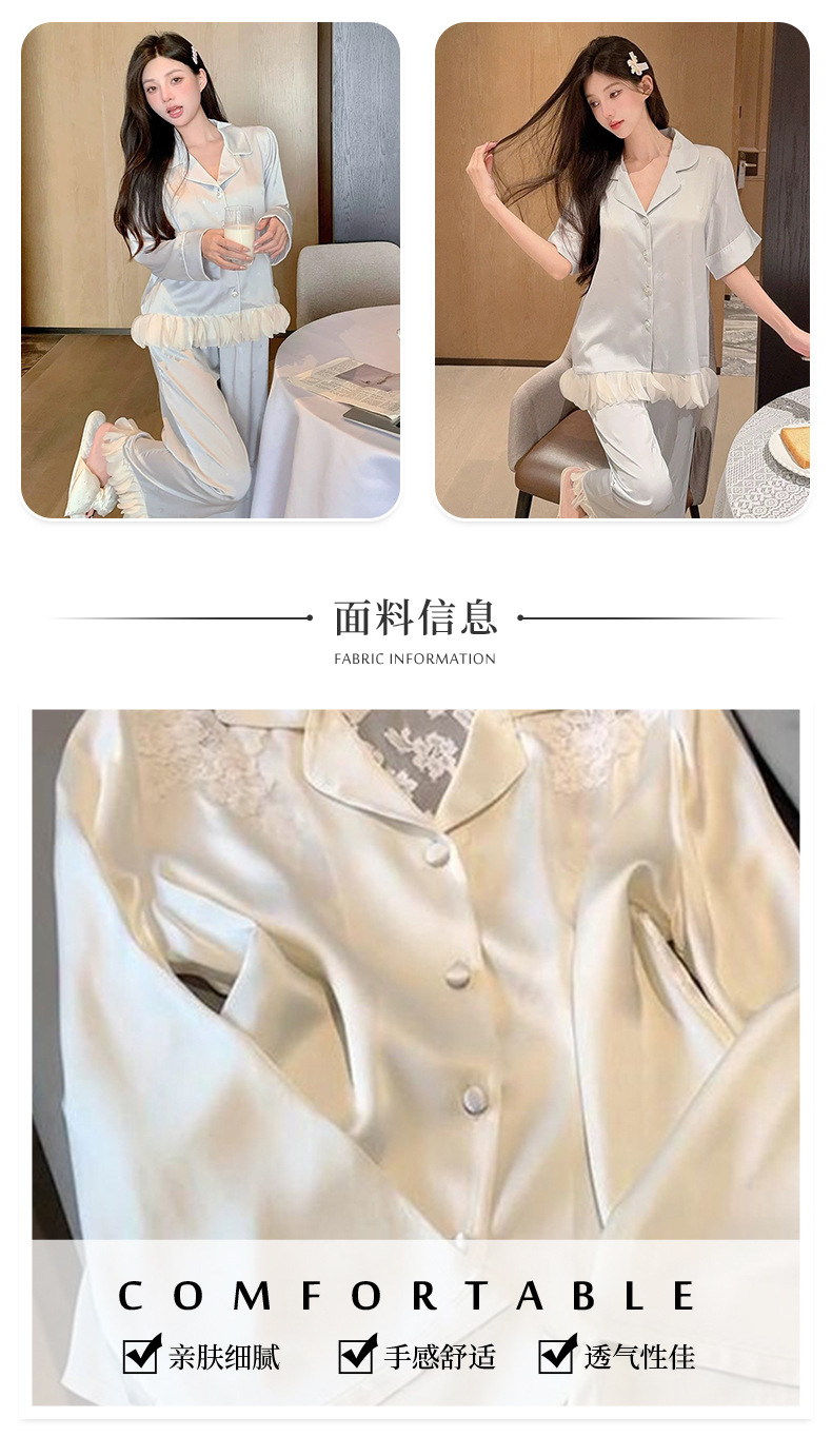 여성용 고급 패션 아이스 실크 잠옷, 화이트 문라이트 봄 홈웨어, 레이스 아름다운 등 디자인, 긴팔 긴바지 투피스 세트 도매스토어 가기