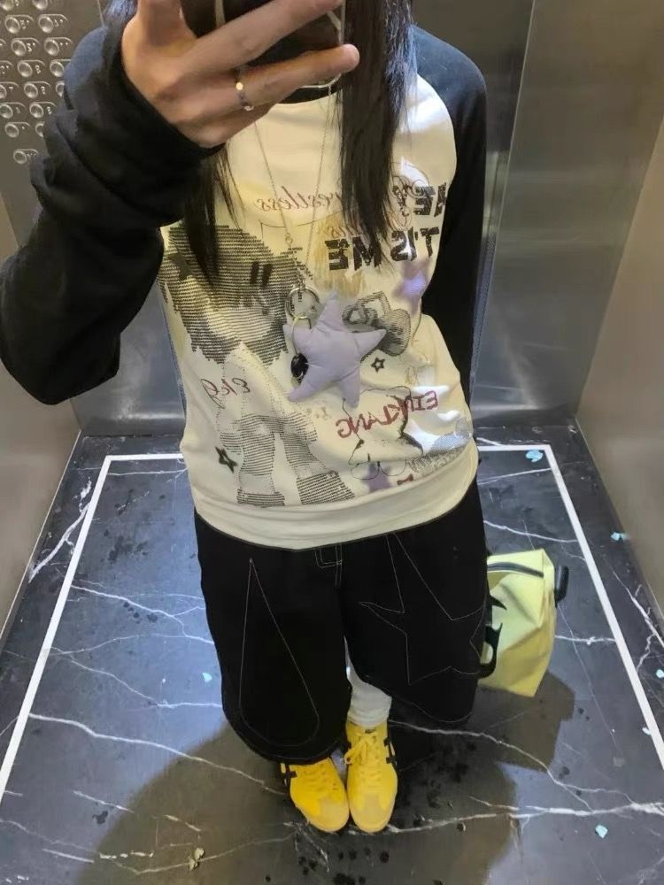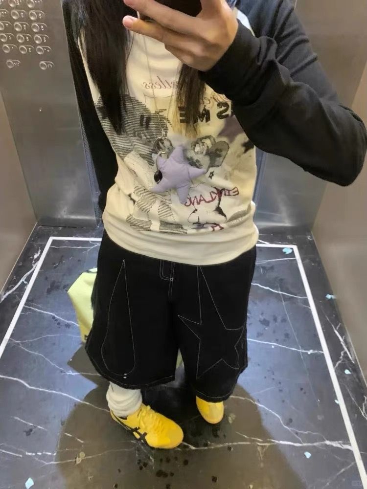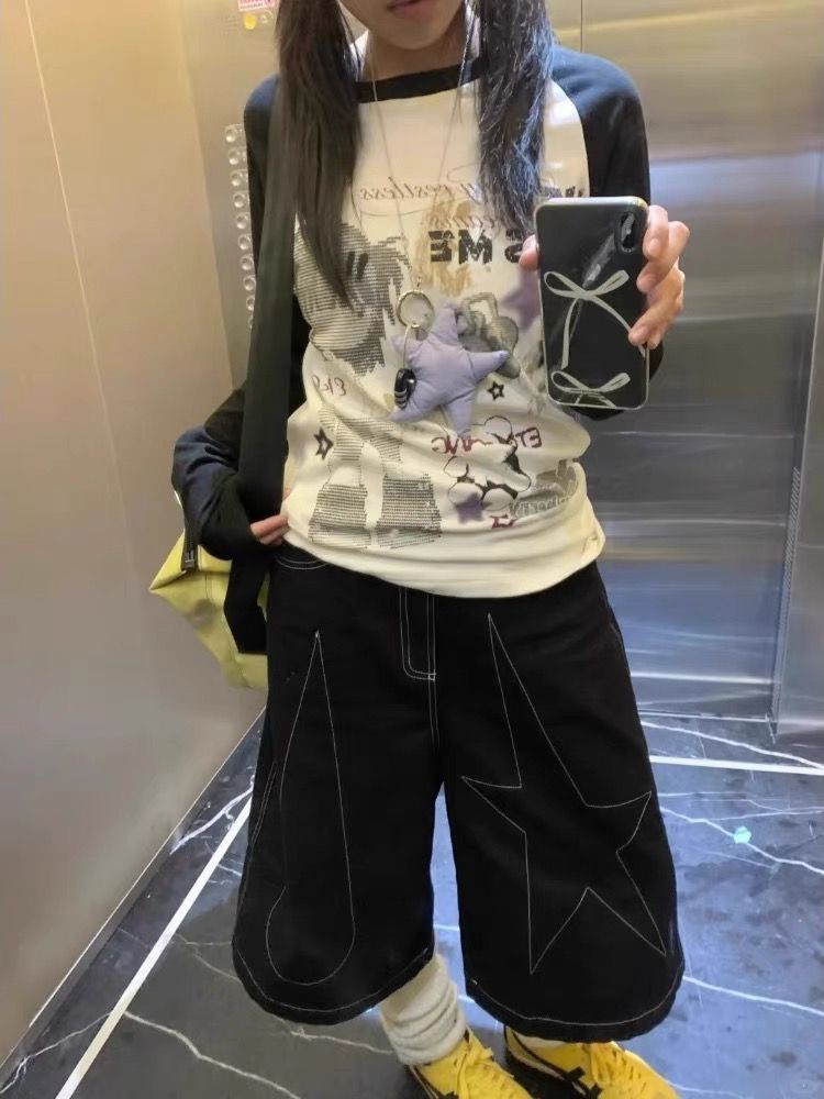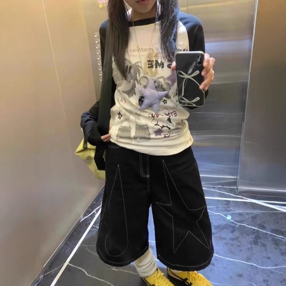 미국식 레트로 컬러 대비 밝은 라인 스타 자른 청바지 여성 2025 년 여름 거리 딥 루즈 와이드 레그 팬츠 중간 길이 바지스토어 가기