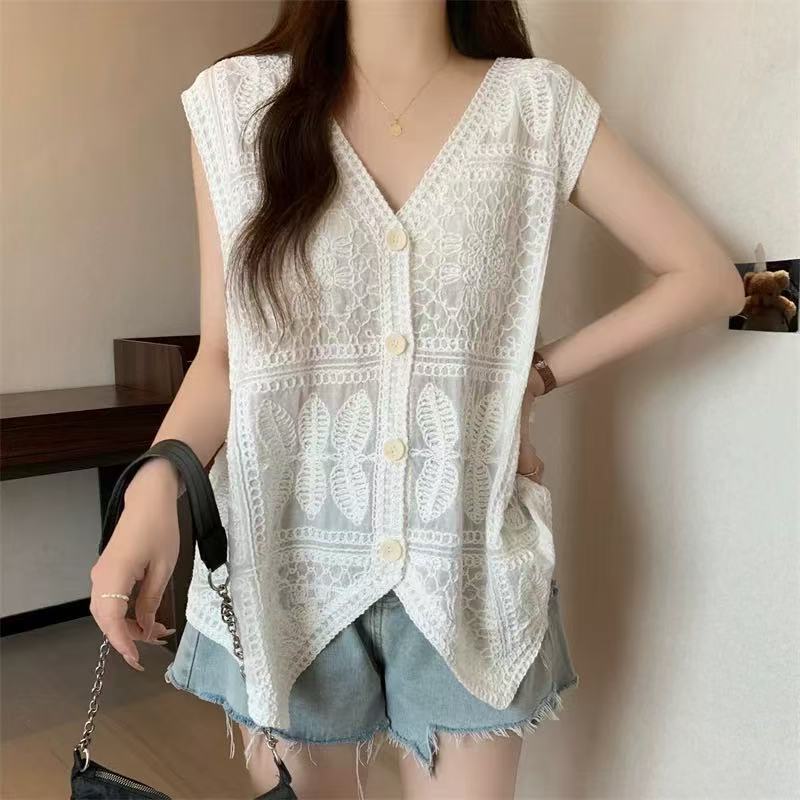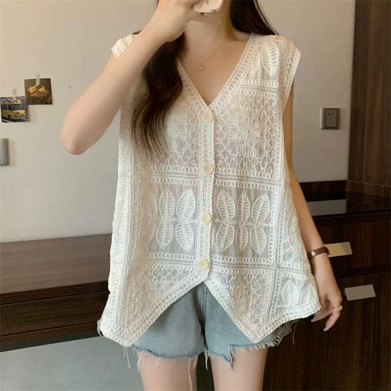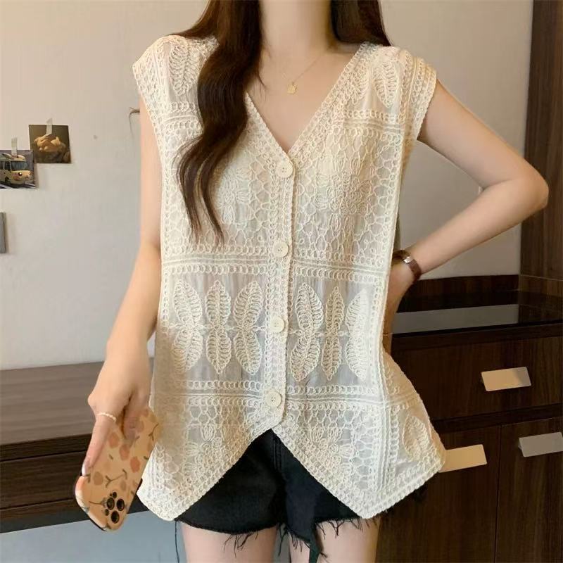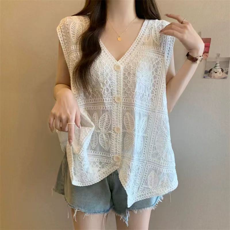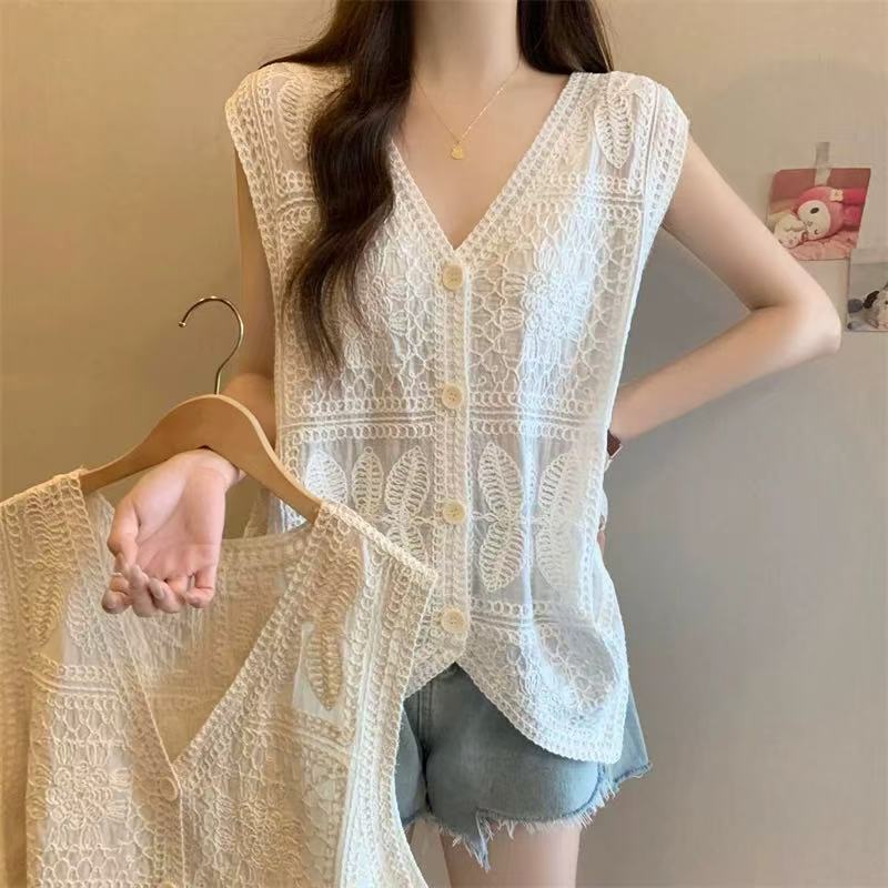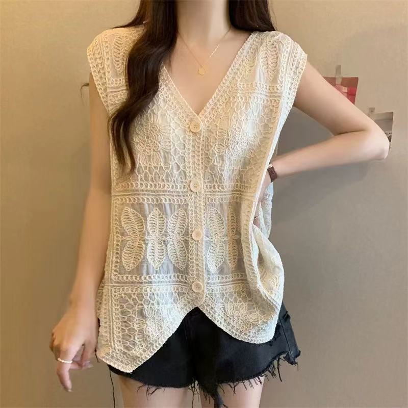 샤넬 스타일 크로 셰 뜨개질 할로우 민소매 조끼 여자 여름 새로운 얇은 카디건 달콤한 올 매치 작은 재킷 조끼스토어 가기