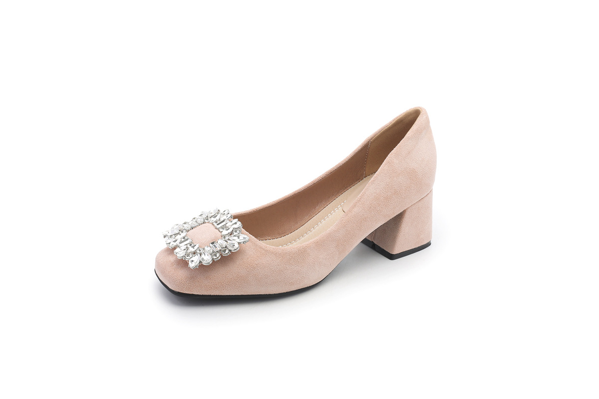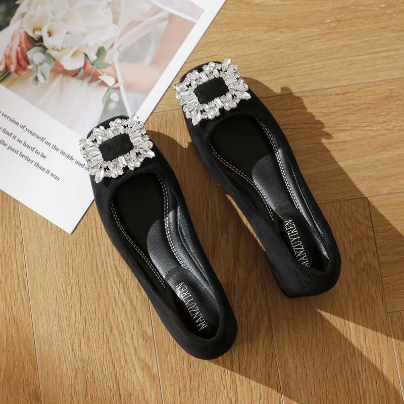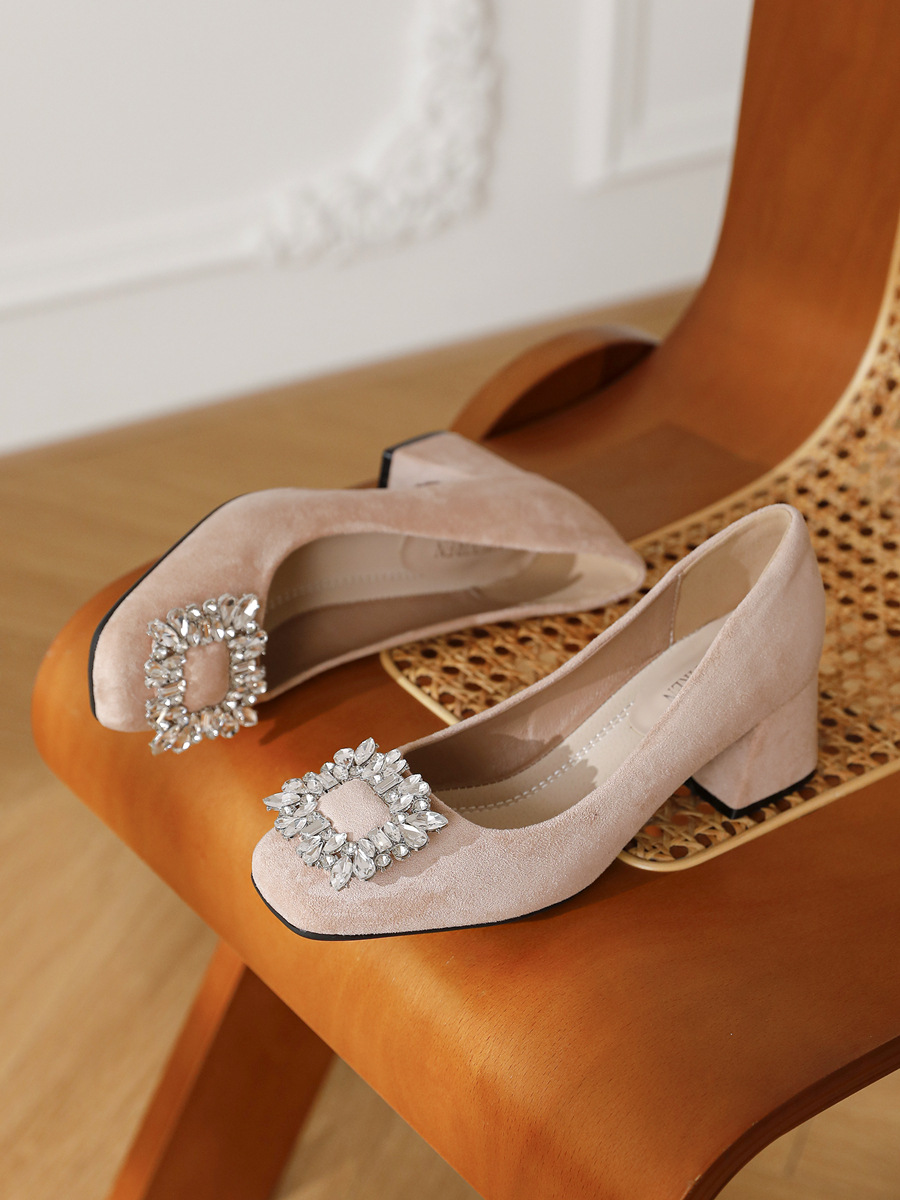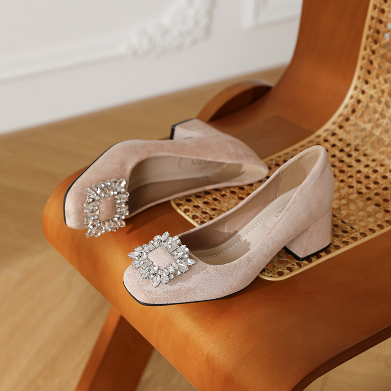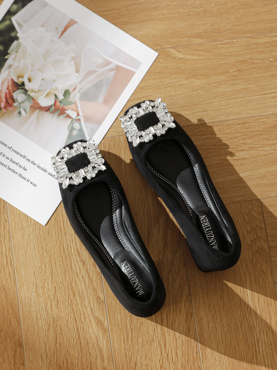 두꺼운 굽이 있는 여성용 검은색 전문 하이힐, 2025 봄 여름 신상 프렌치 스퀘어 토 라인스톤 로우힐 슈즈스토어 가기