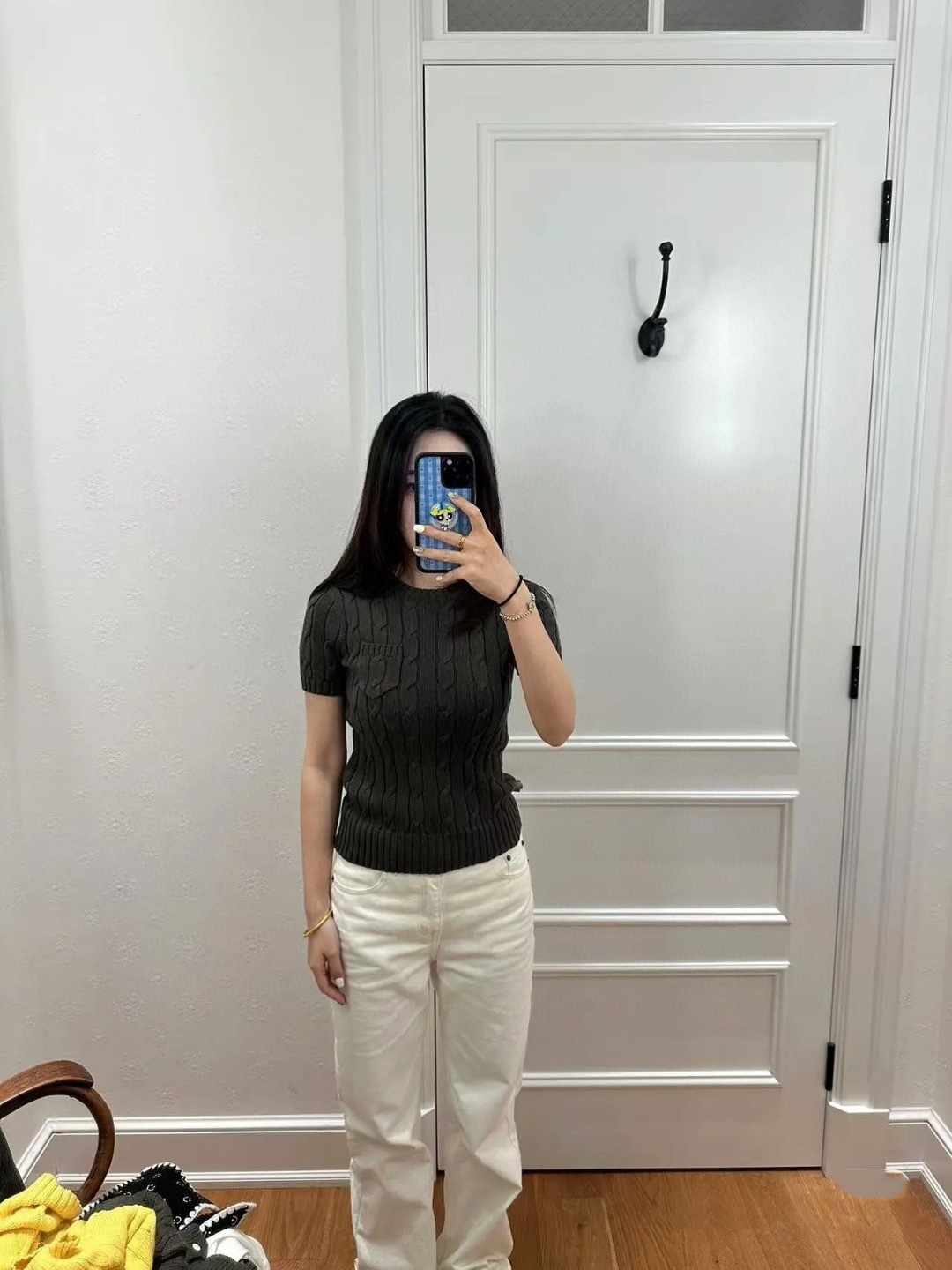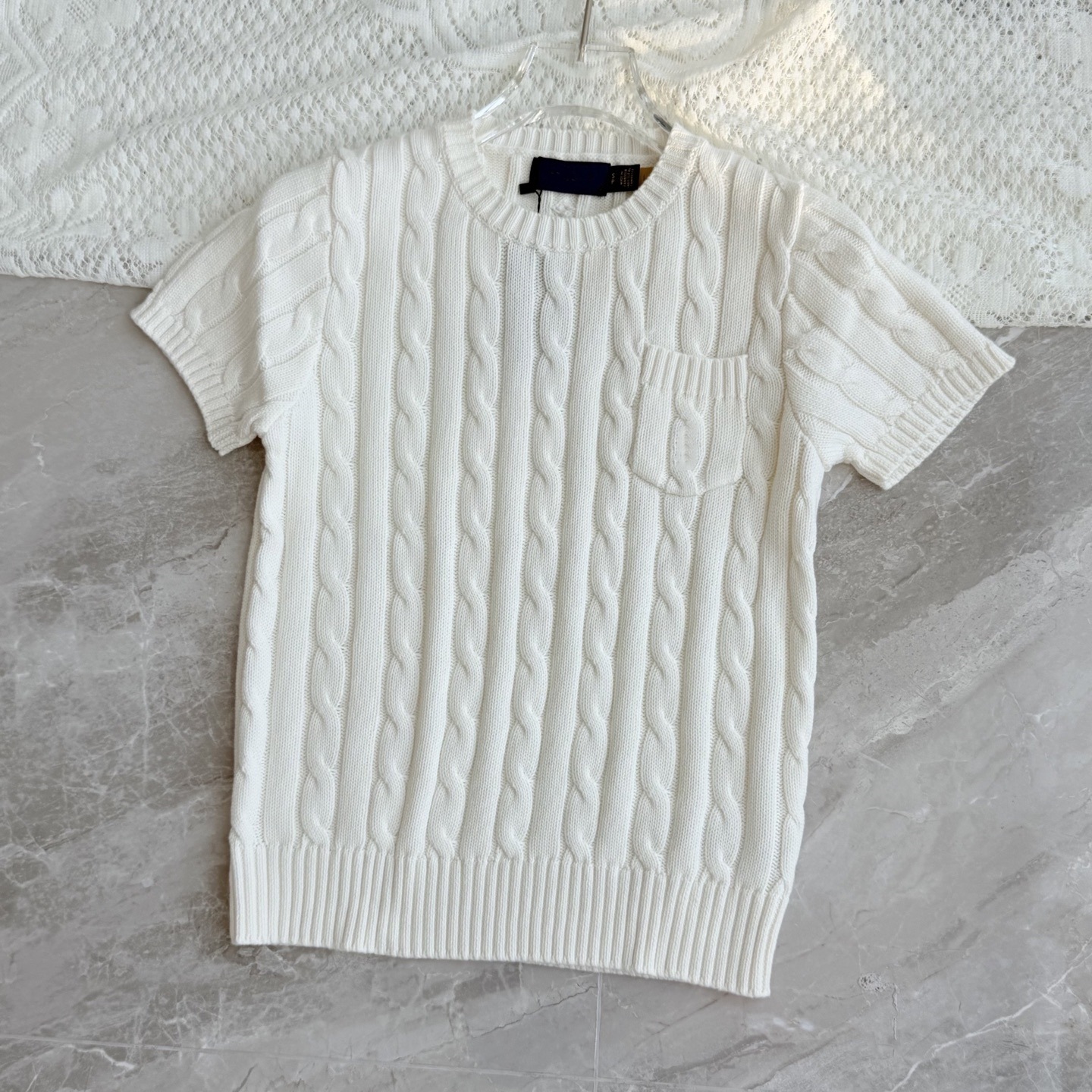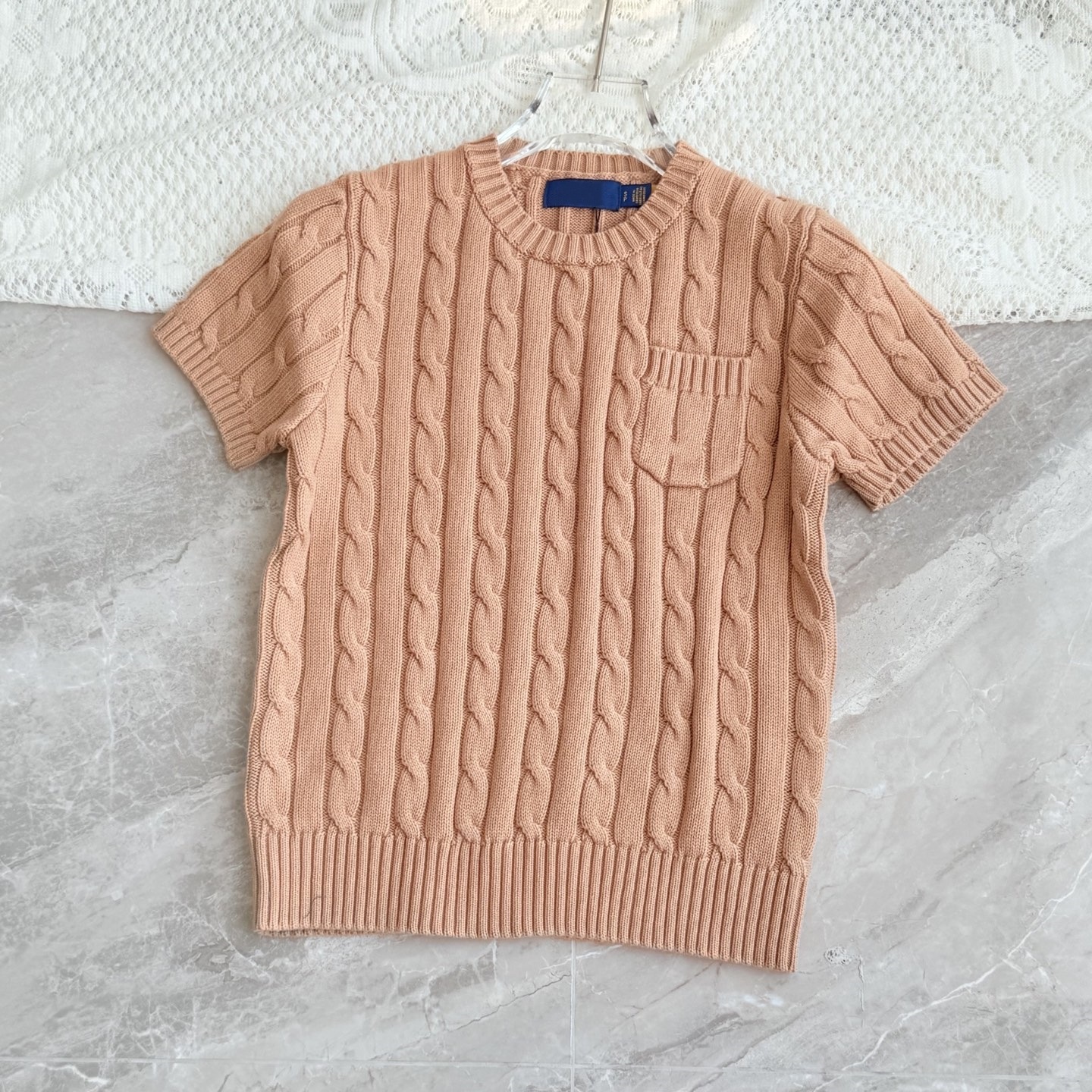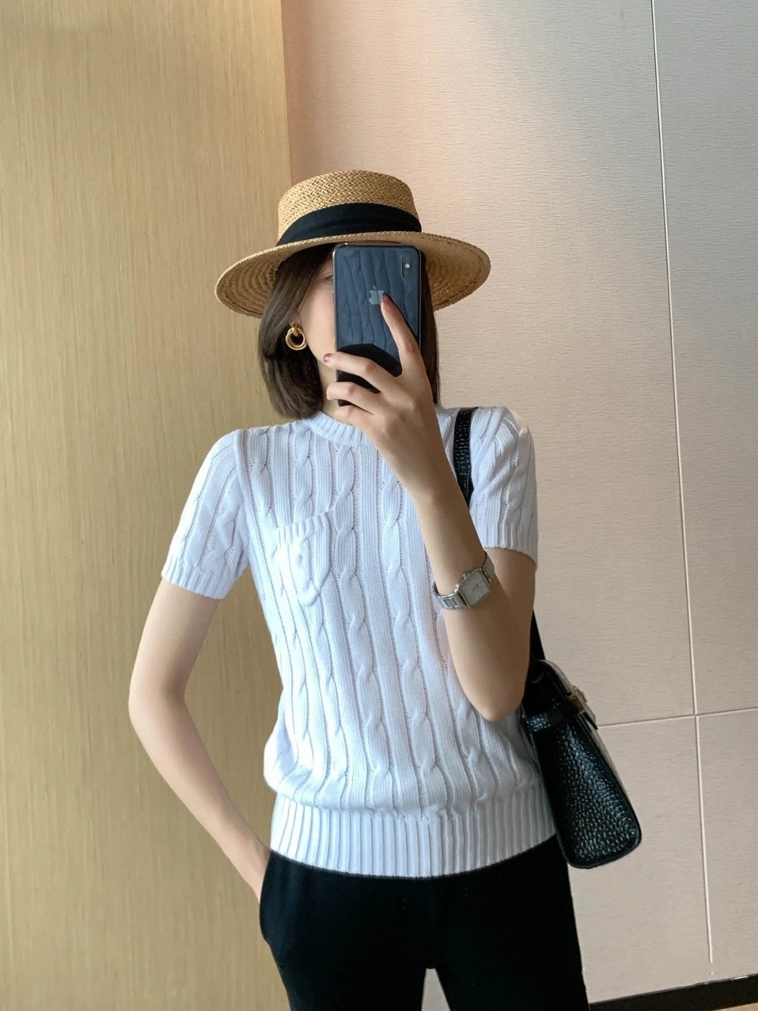 고품질/스캔코드 가능 라프 라운드넥 포켓 소마자수 니트 반팔 트위스트 상의 여성용스토어 가기