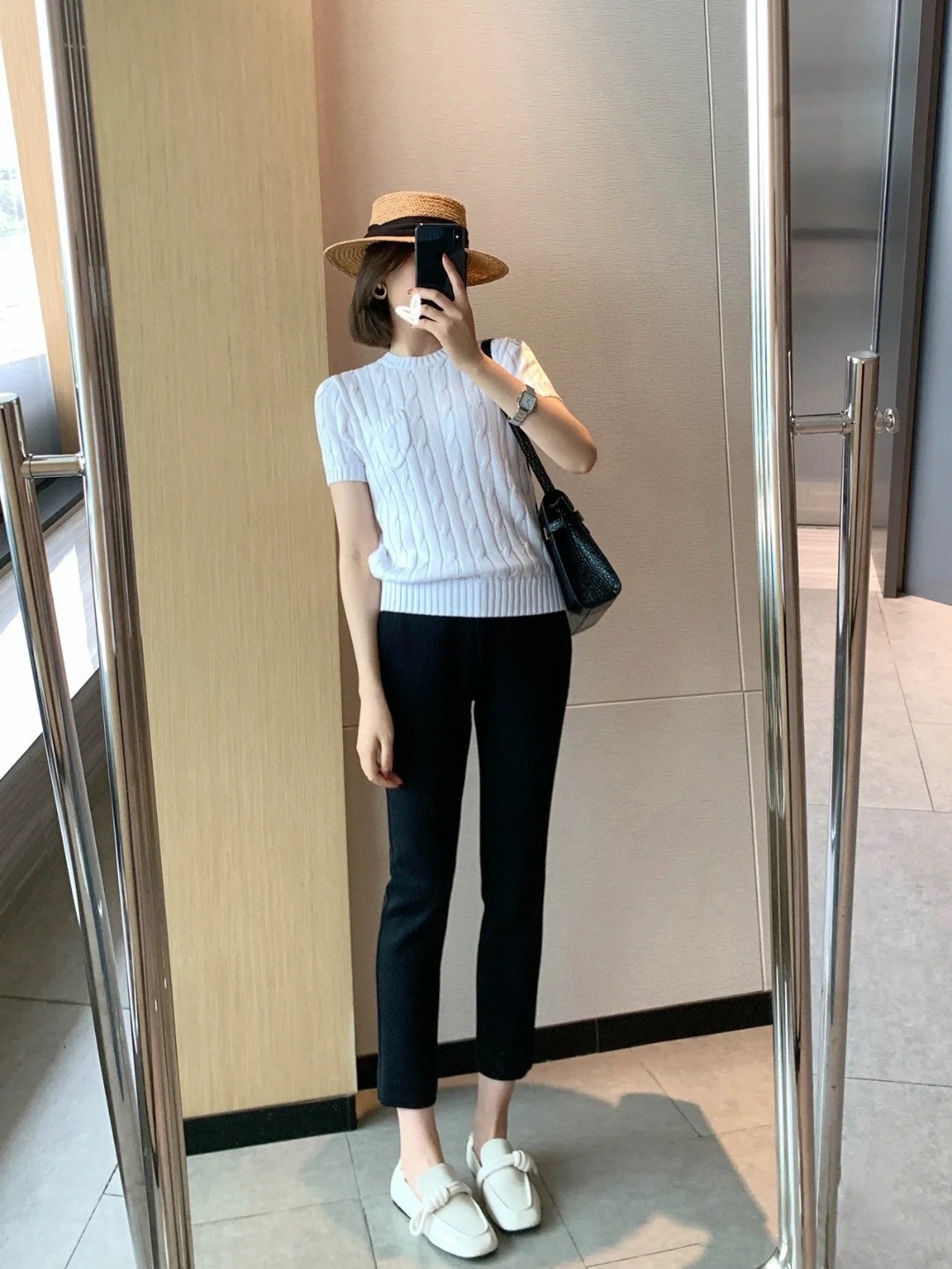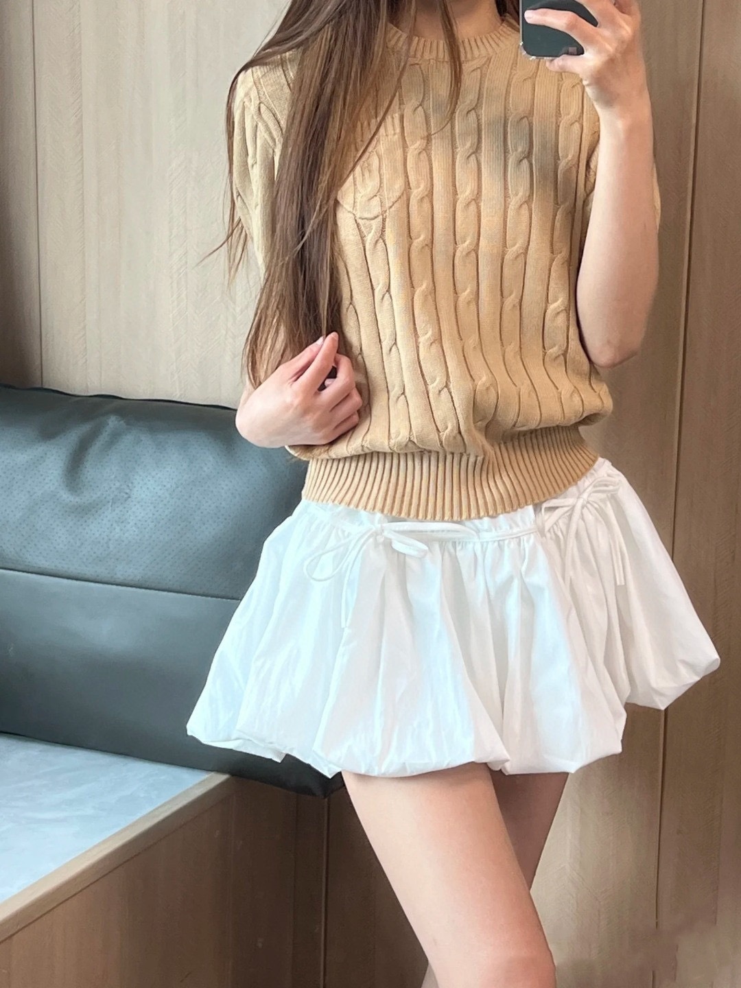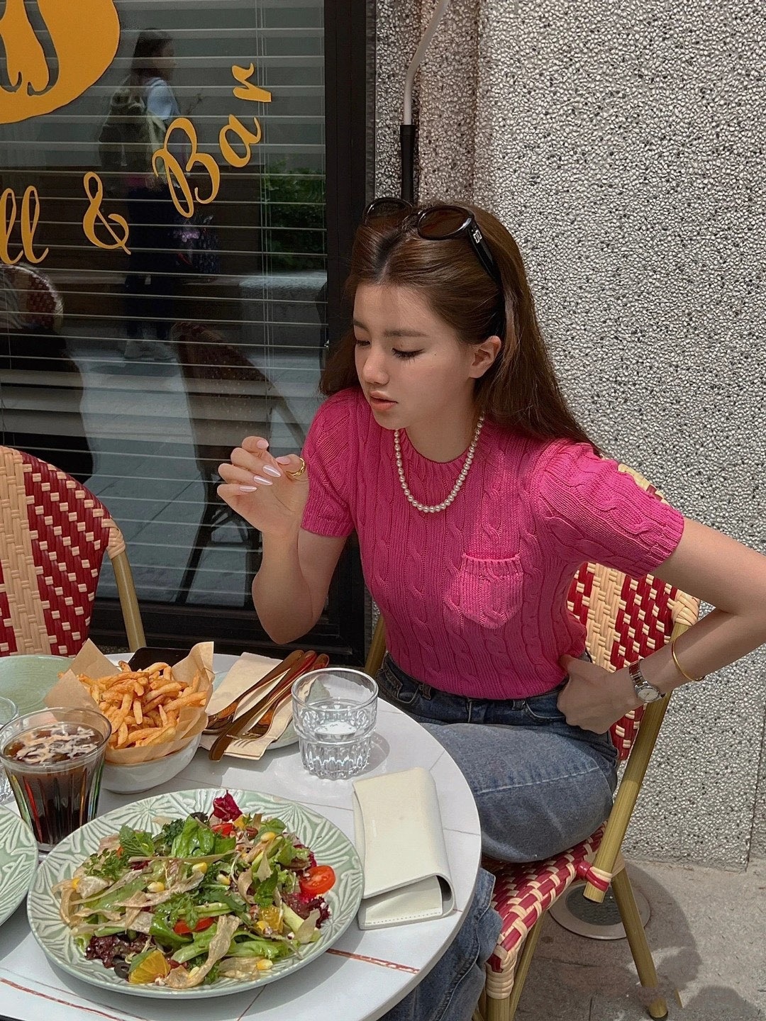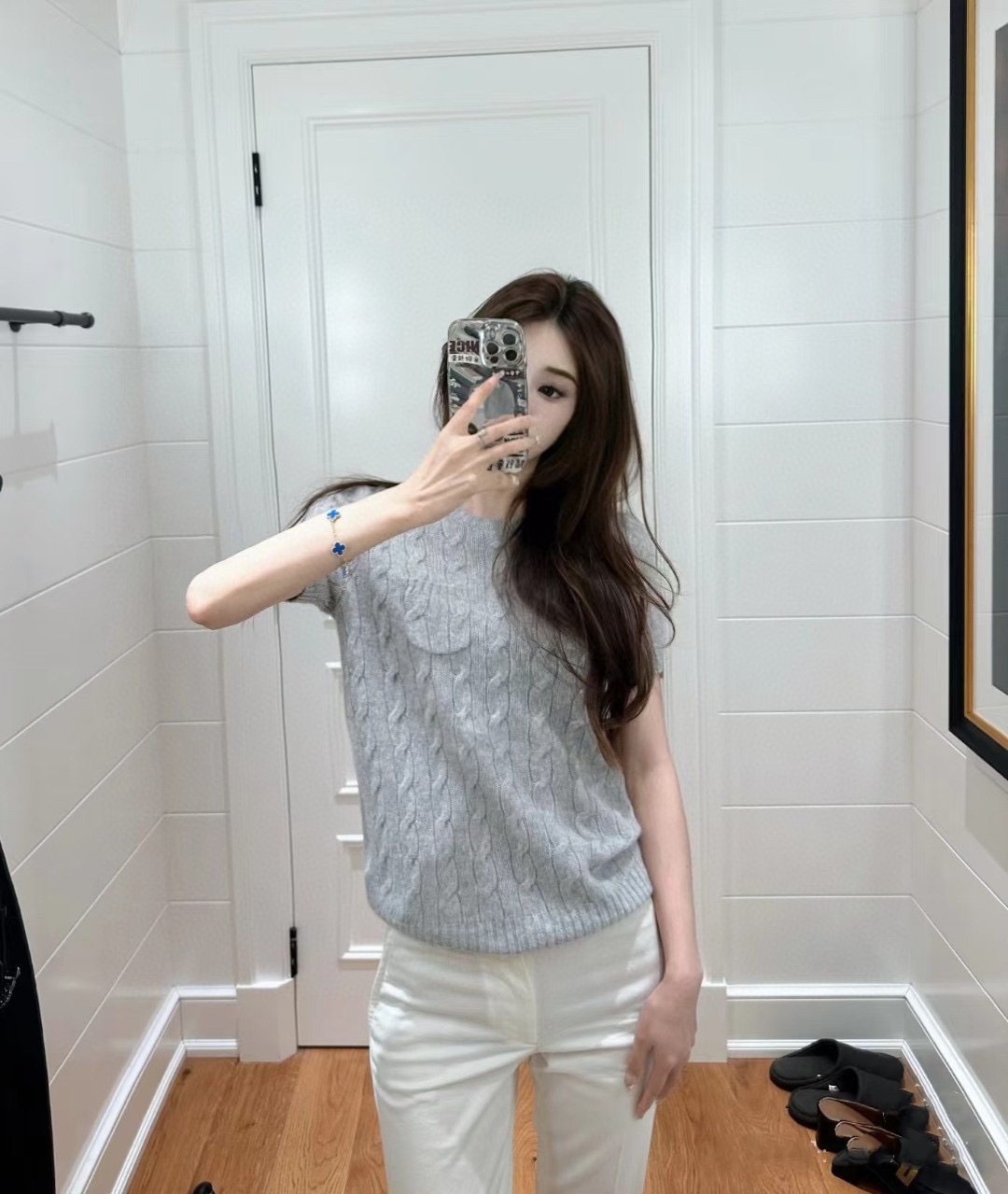 고품질/스캔코드 가능 라프 라운드넥 포켓 소마자수 니트 반팔 트위스트 상의 여성용스토어 가기
