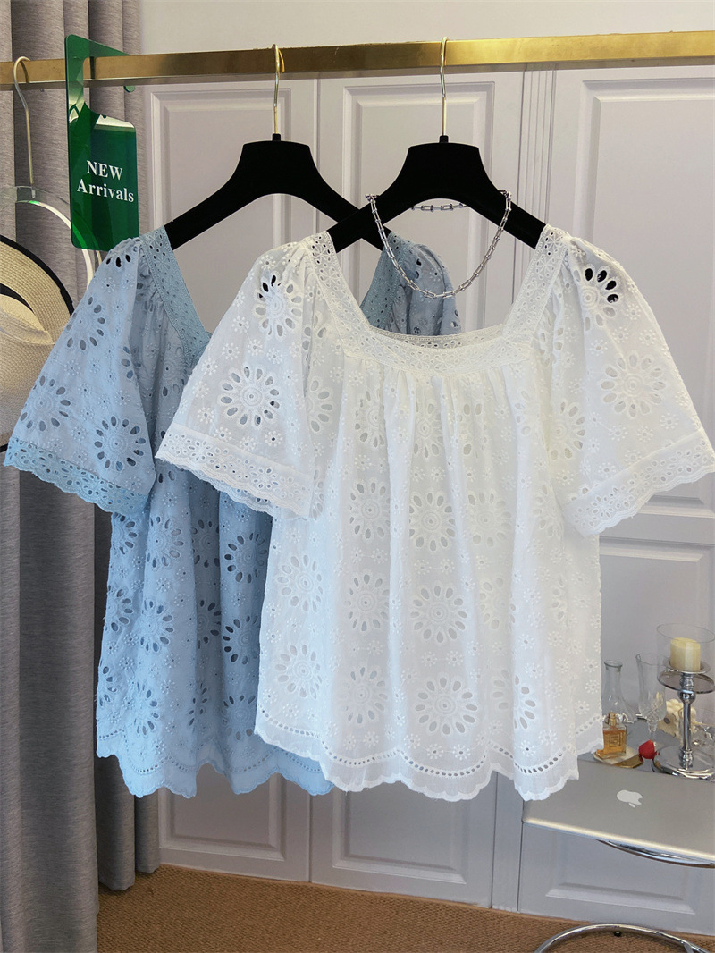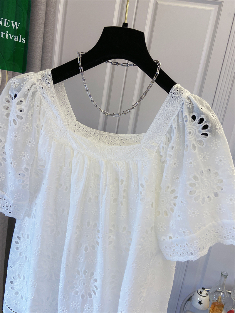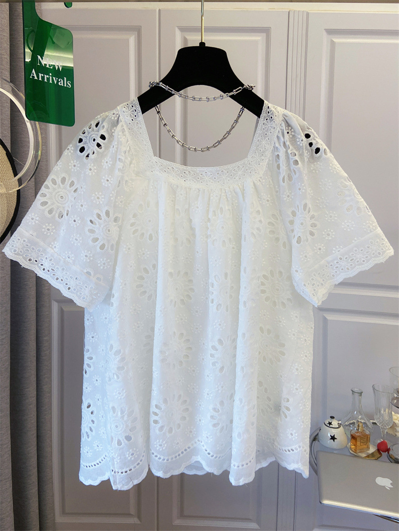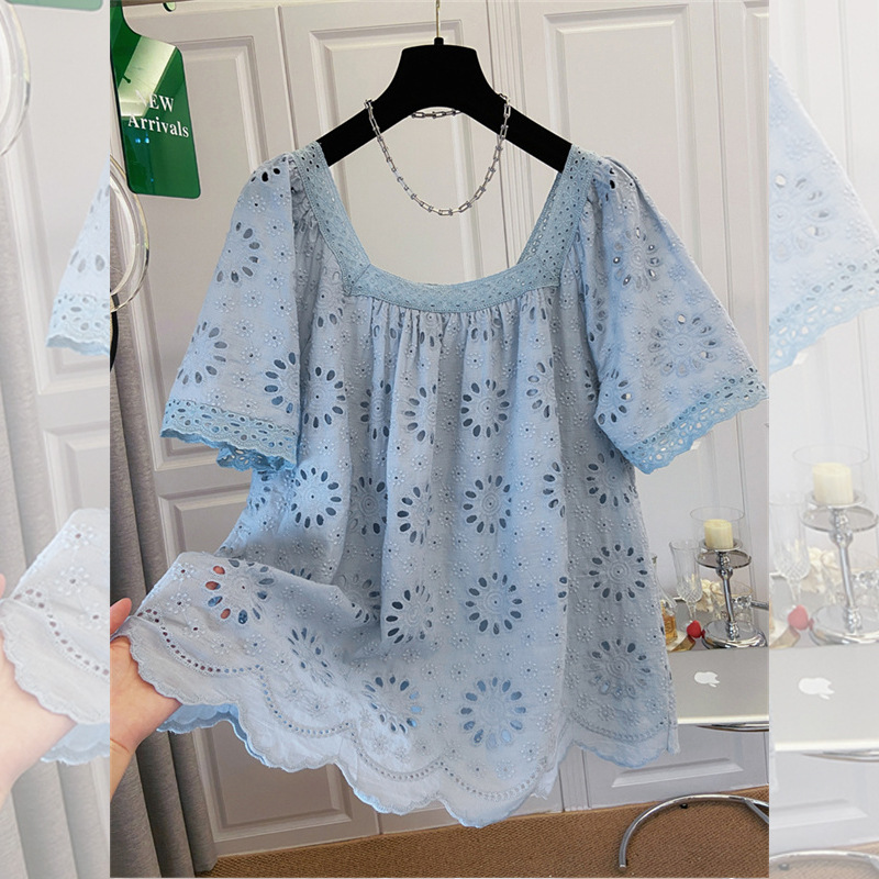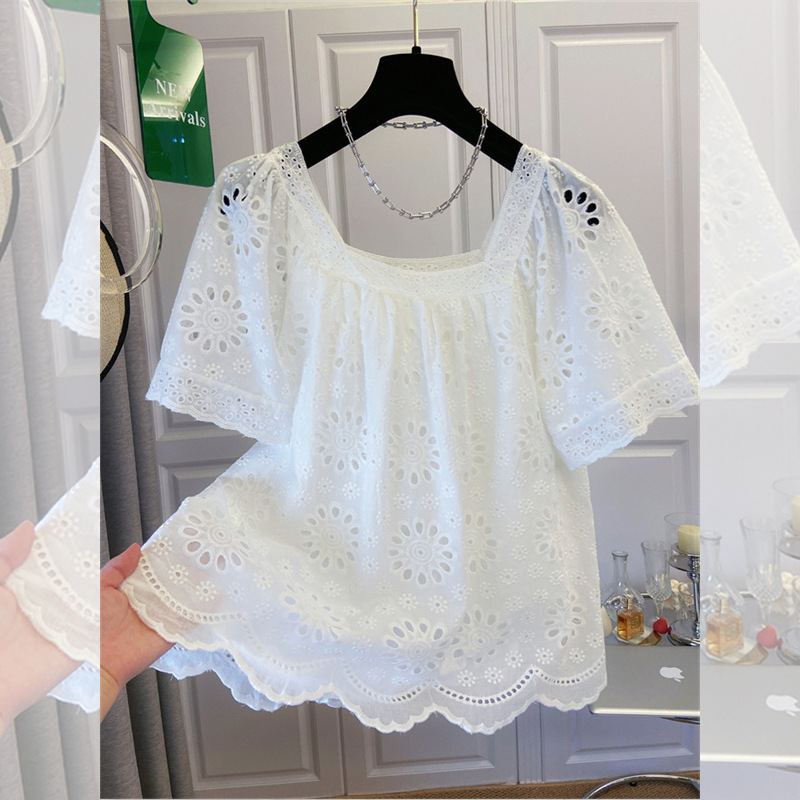 프랑스 스타일 연령 감소 로우 라운드 넥 중공 반팔 쉬폰 셔츠 탑 여성 여름 신작 대형 루즈 스위트 셔츠스토어 가기