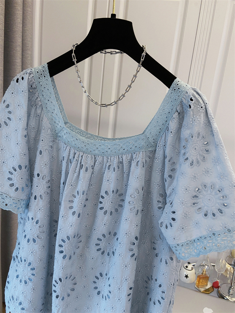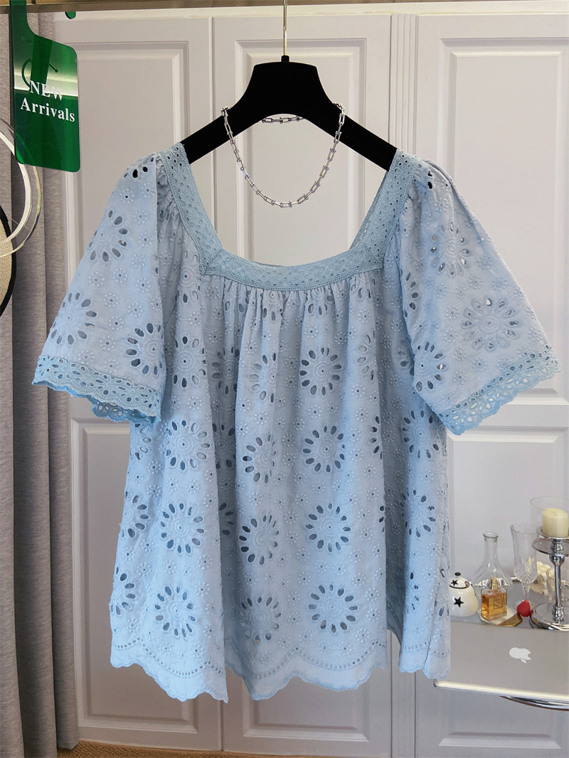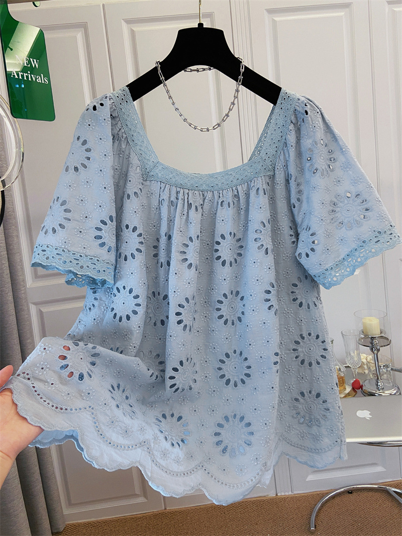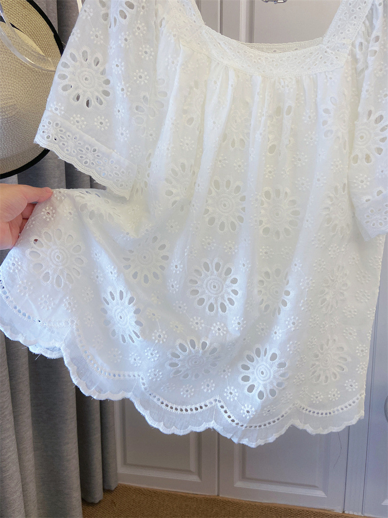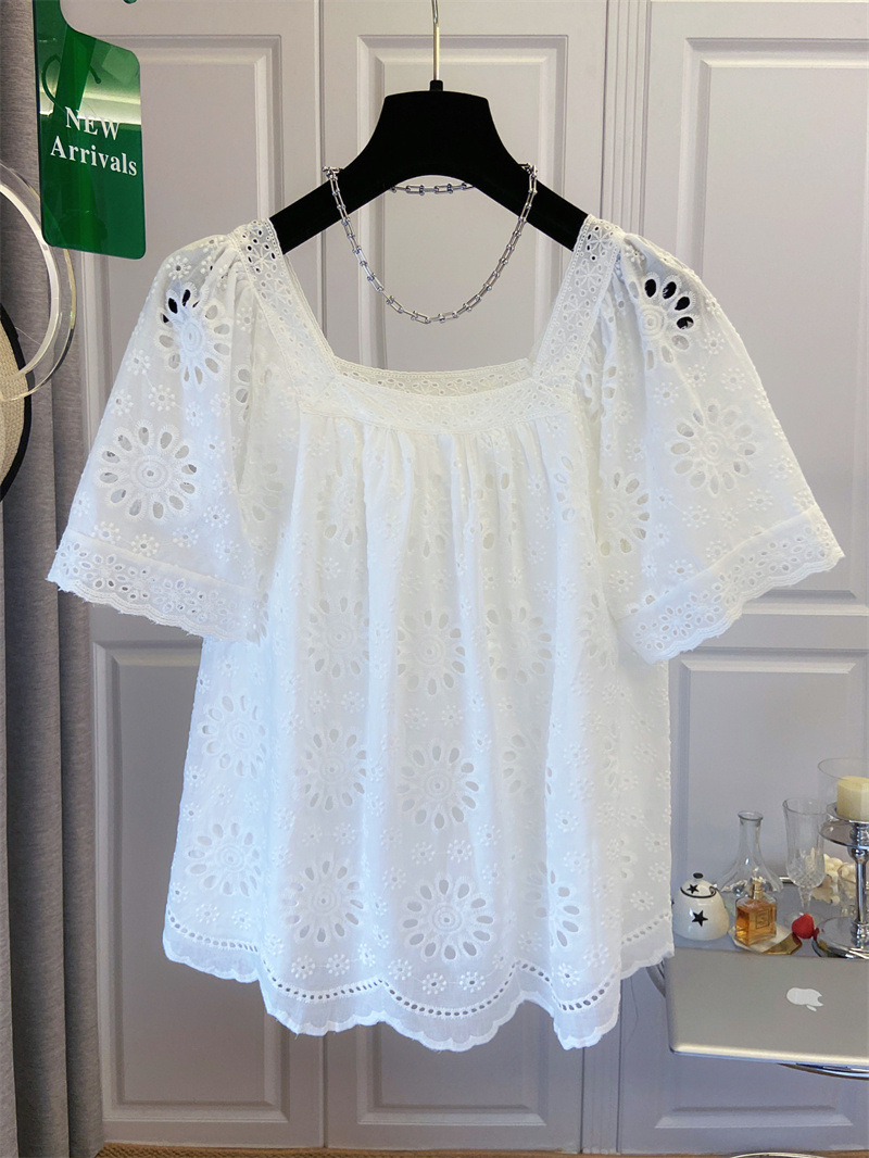 프랑스 스타일 연령 감소 로우 라운드 넥 중공 반팔 쉬폰 셔츠 탑 여성 여름 신작 대형 루즈 스위트 셔츠스토어 가기