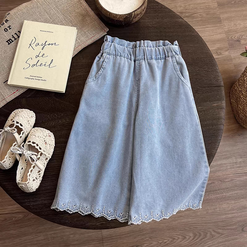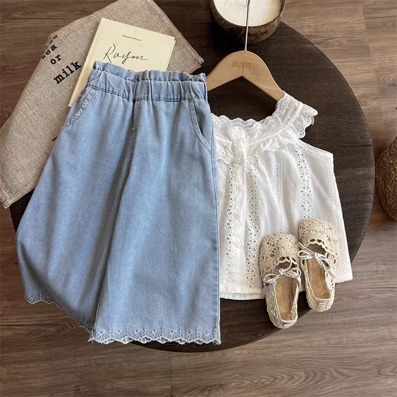 2025 여름 새 스타일 여아 의류 귀여운 레이스 조끼와 데님 와이드 팬츠 정장 여아 투피스 세트스토어 가기