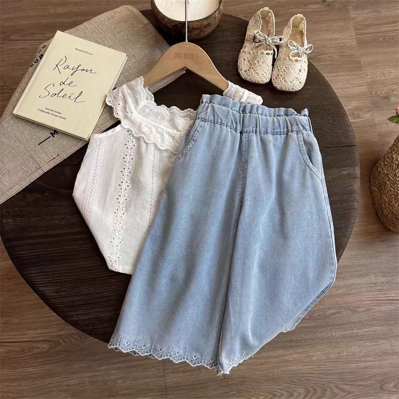 2025 여름 새 스타일 여아 의류 귀여운 레이스 조끼와 데님 와이드 팬츠 정장 여아 투피스 세트