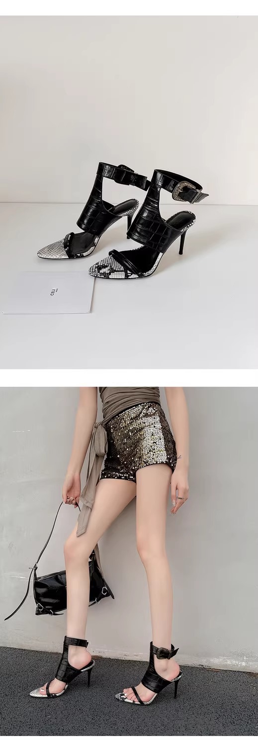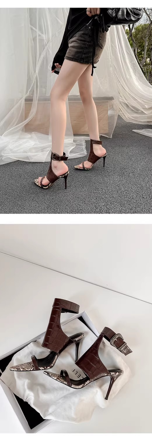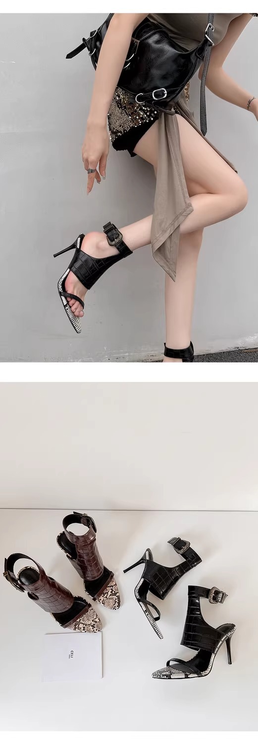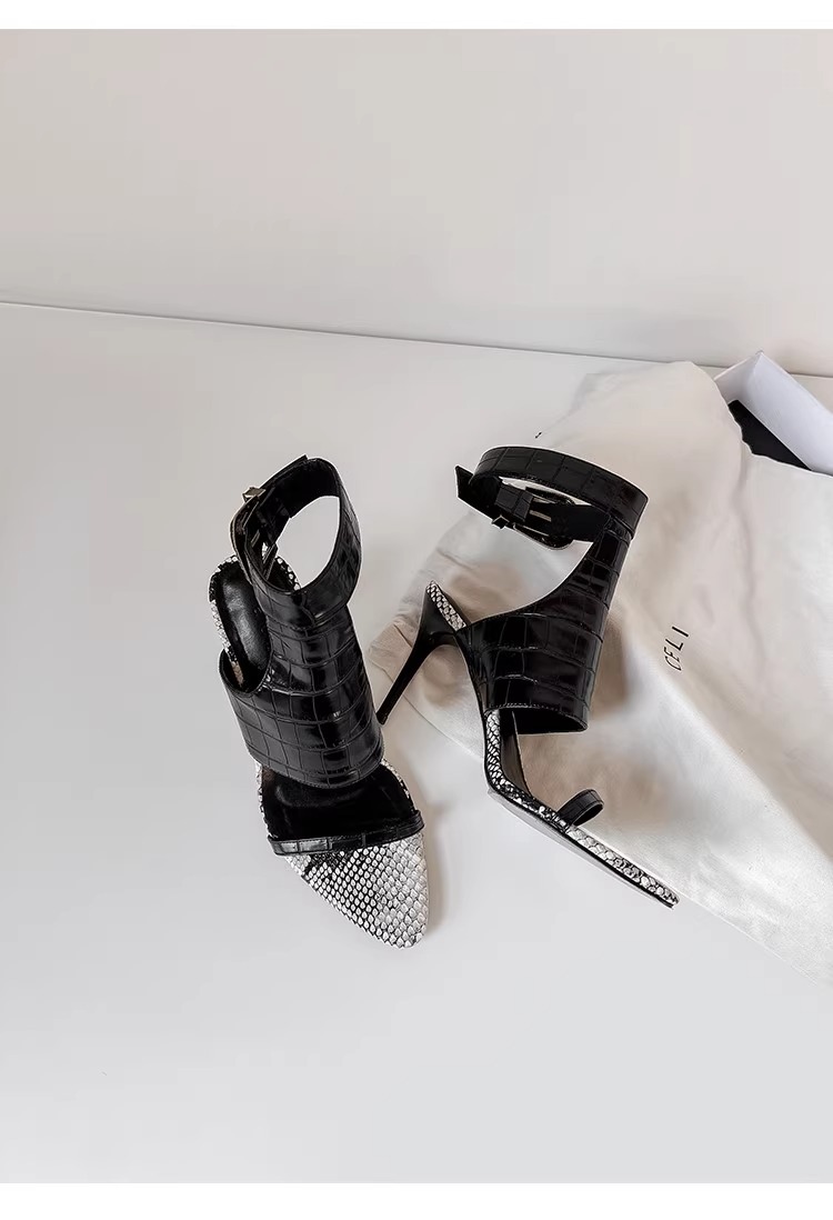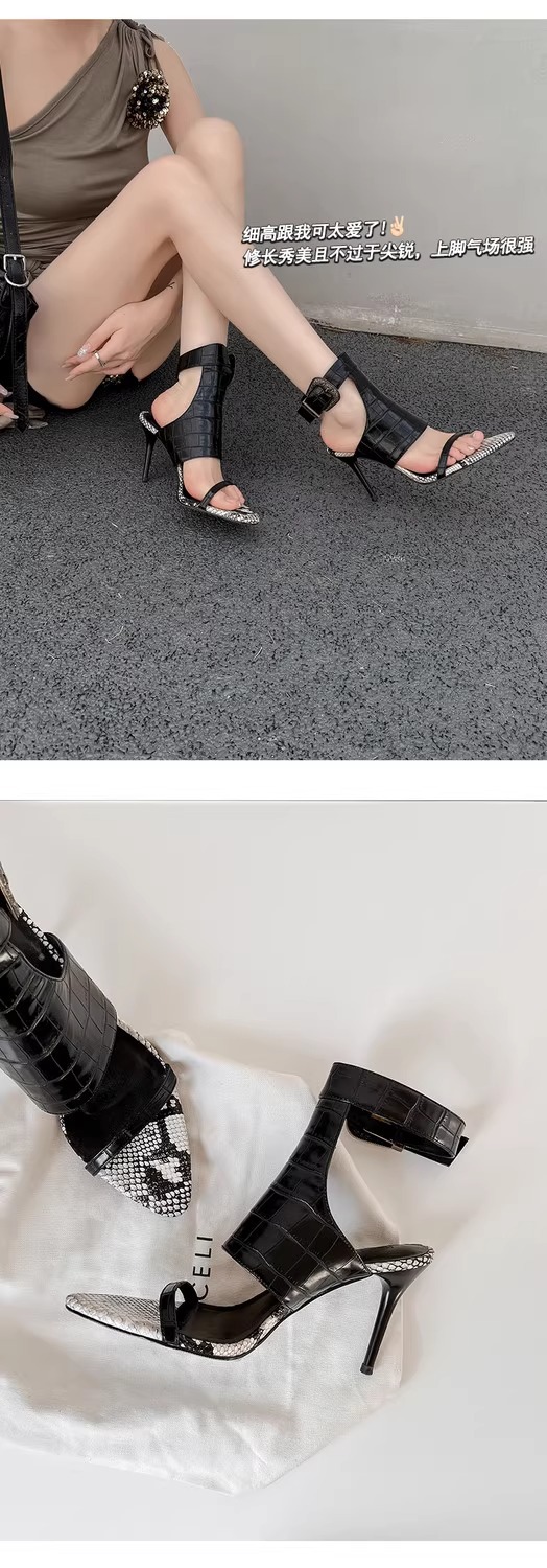 유럽과 미국의 검은 기질 하이힐, 섹시한 여신 스타일 스커트, 패션 슈즈, 천연 가죽 뾰족한 굽 오픈 토 샌들