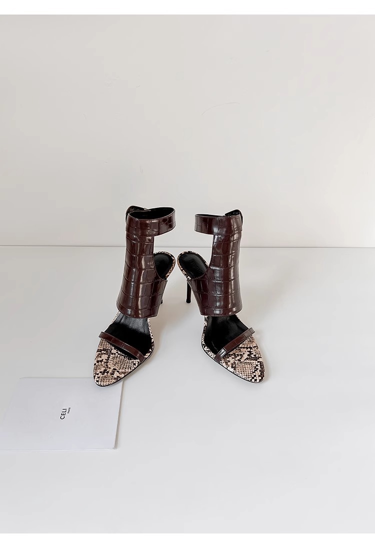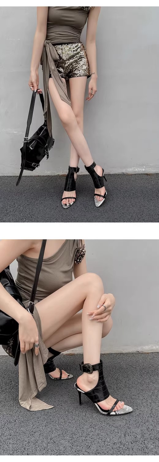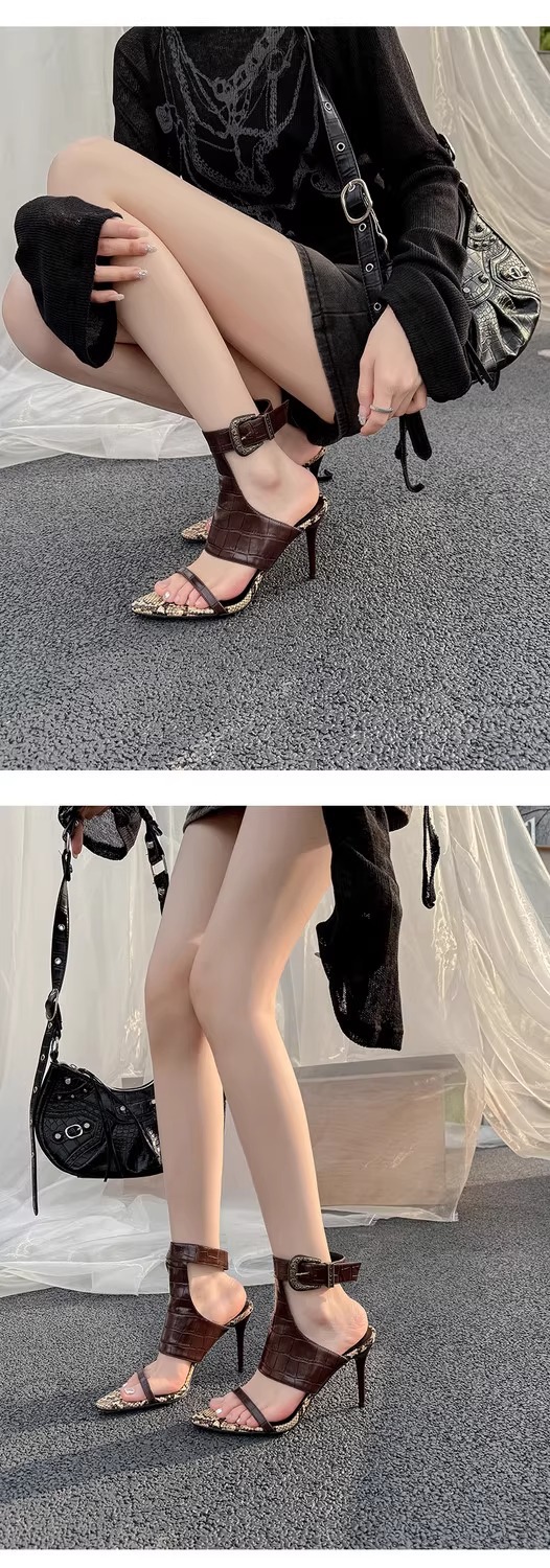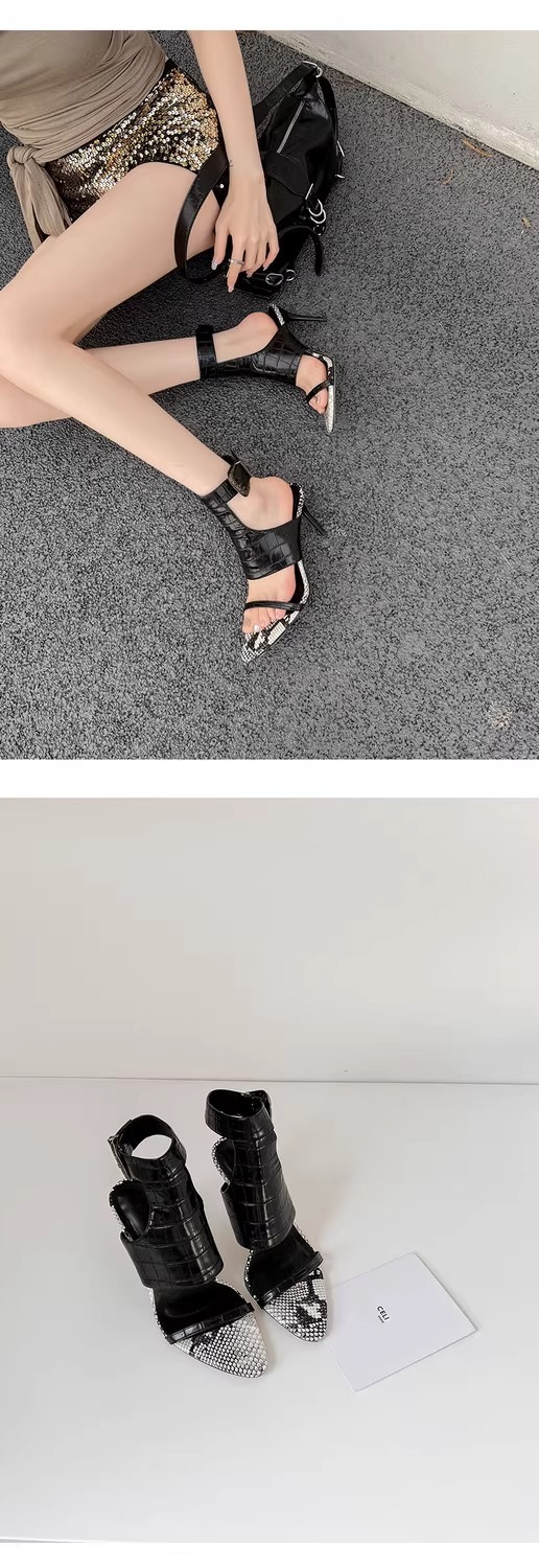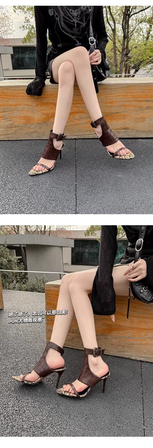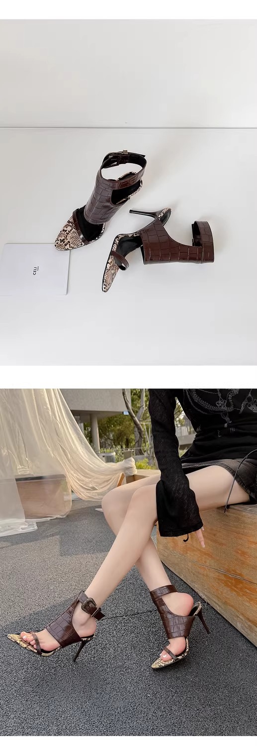 유럽과 미국의 검은 기질 하이힐, 섹시한 여신 스타일 스커트, 패션 슈즈, 천연 가죽 뾰족한 굽 오픈 토 샌들