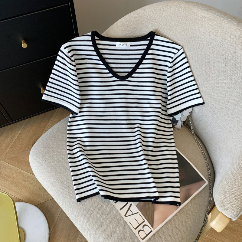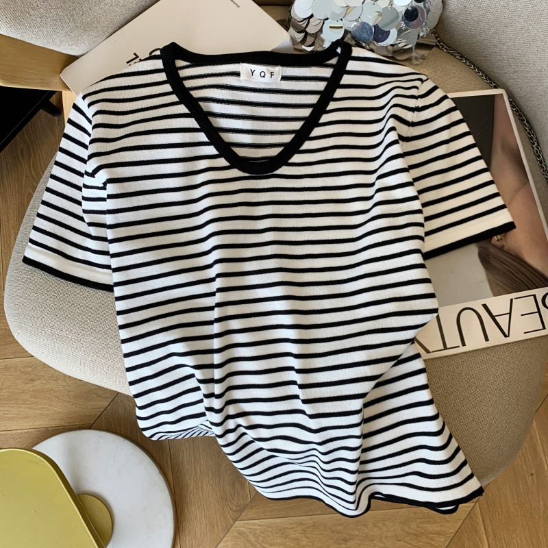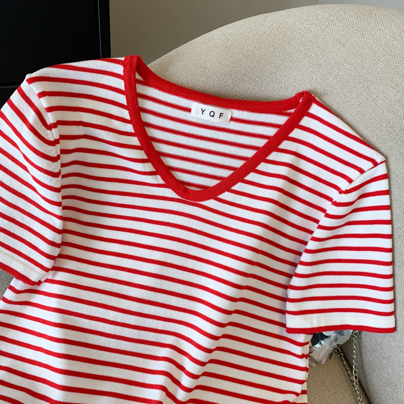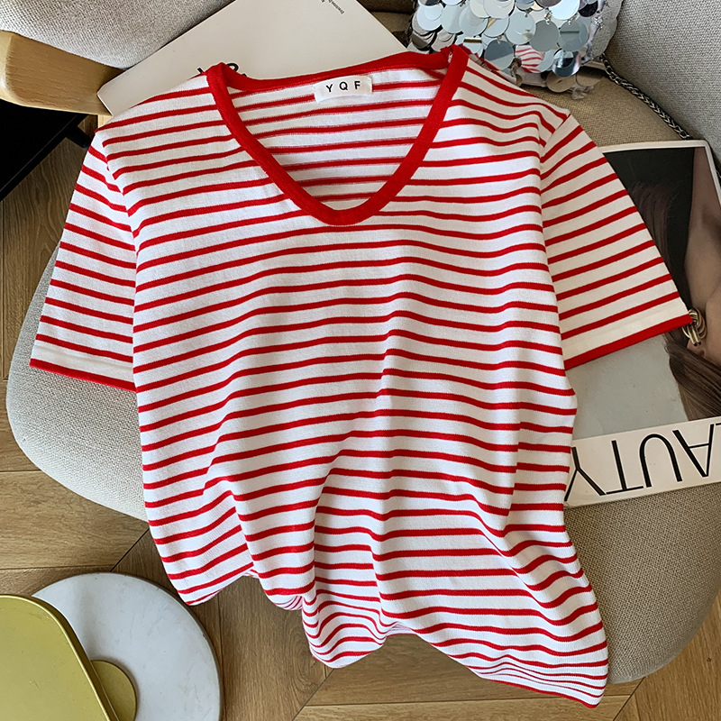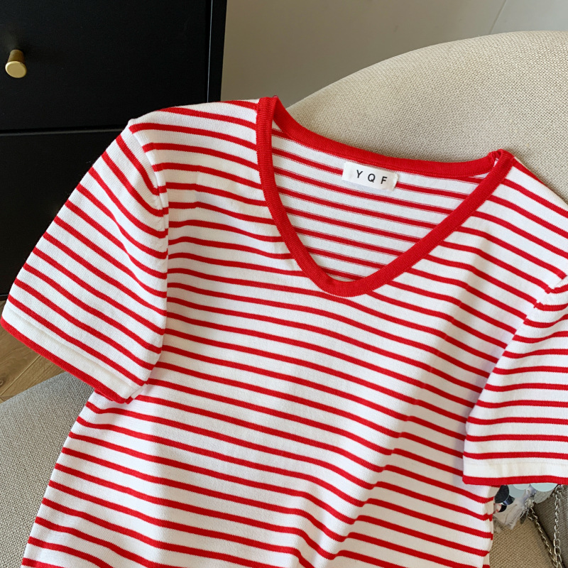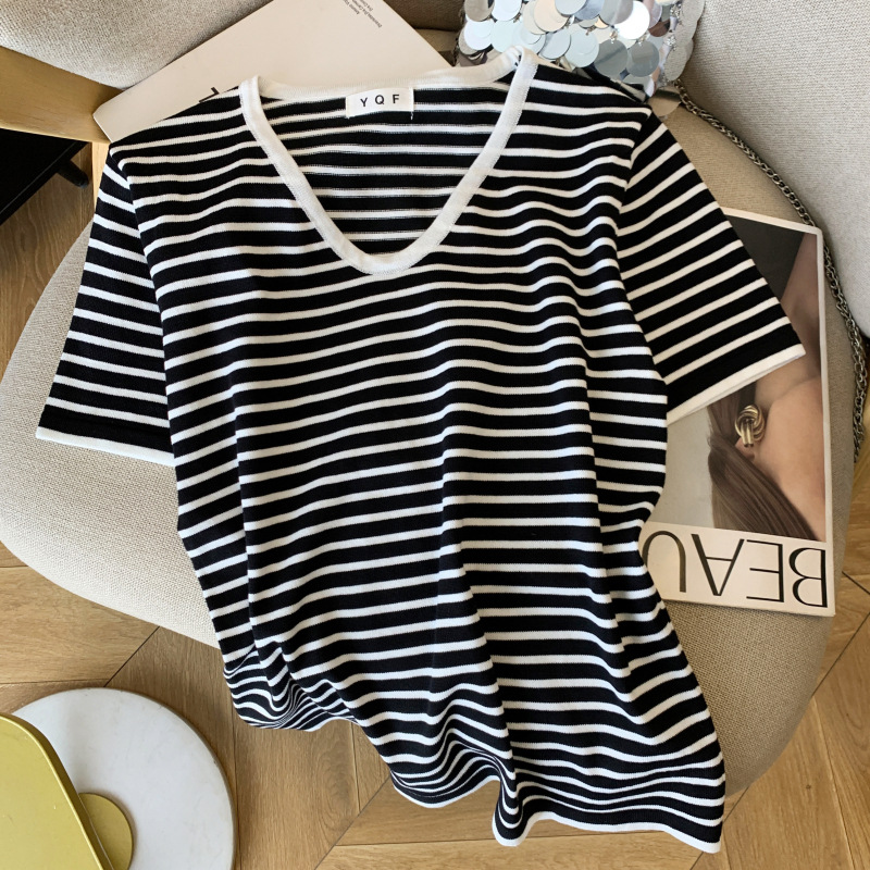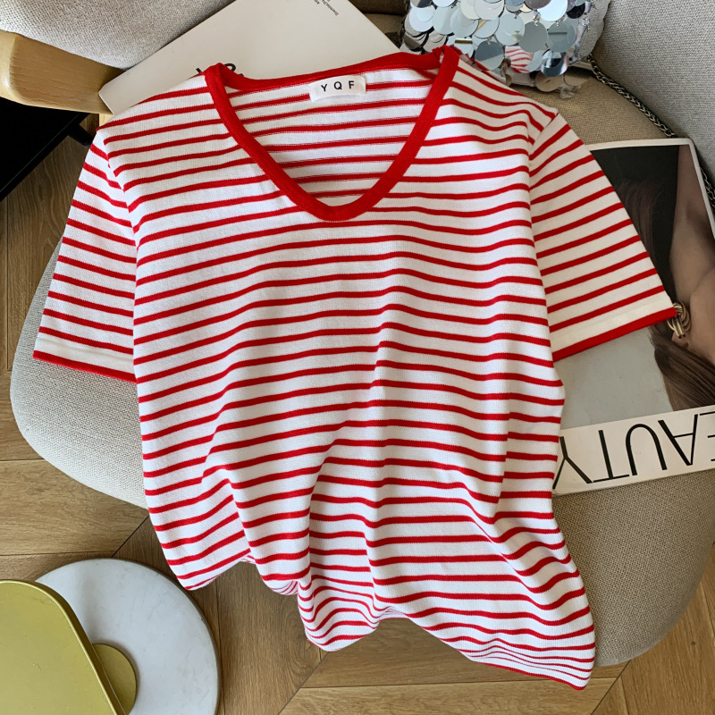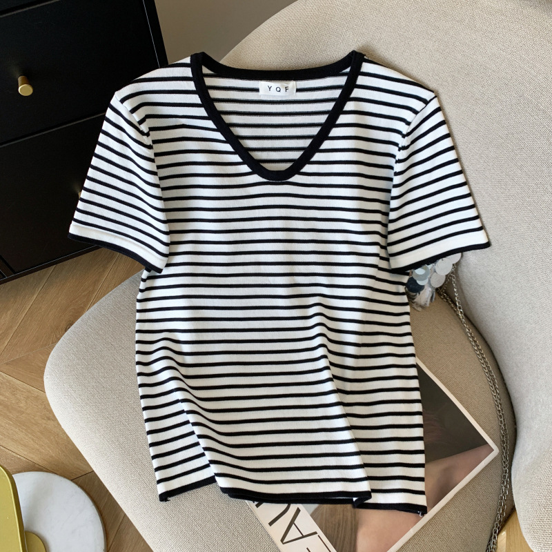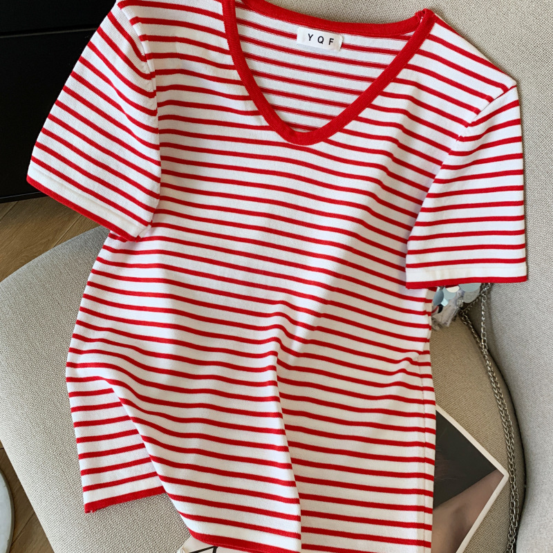 실제 샷 여성 여름 신작 한국 스타일 브이넥 스트라이프 반팔 티셔츠 여성용 패션 아이스 실크 스웨터 탑스토어 가기