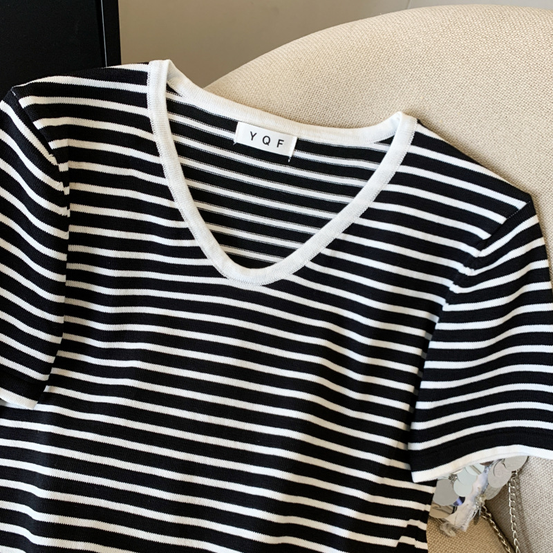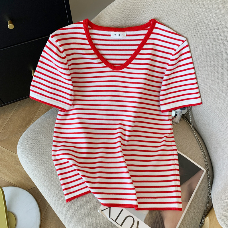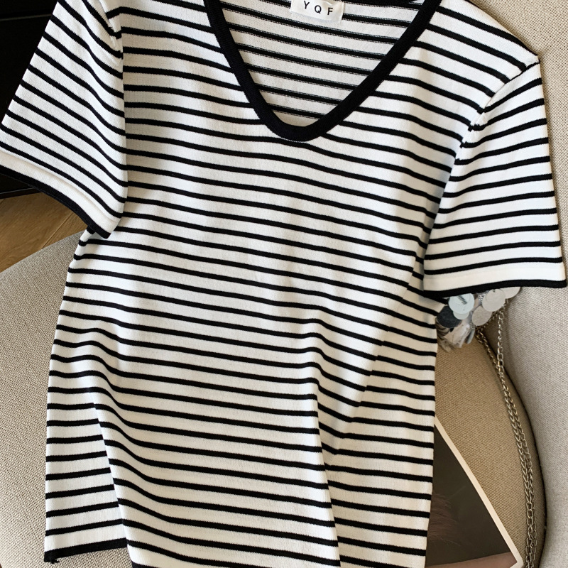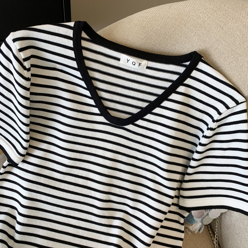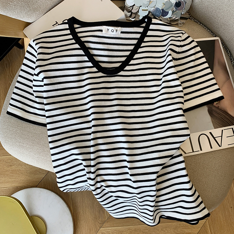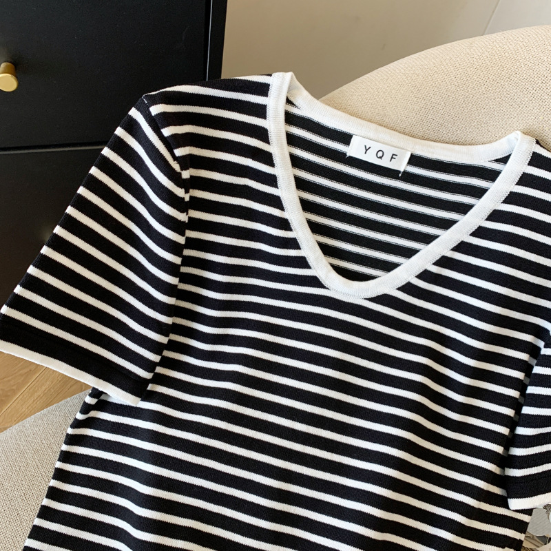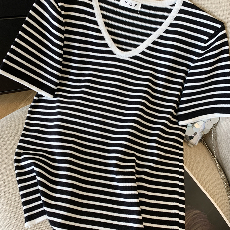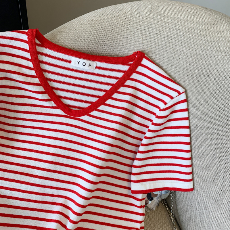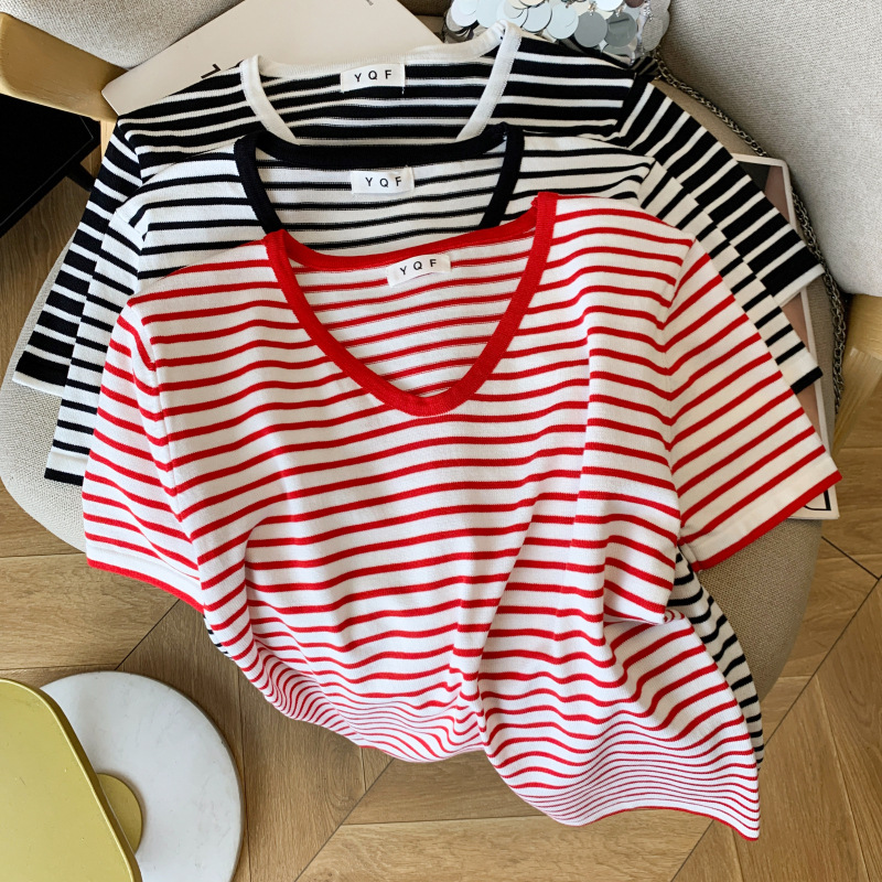 실제 샷 여성 여름 신작 한국 스타일 브이넥 스트라이프 반팔 티셔츠 여성용 패션 아이스 실크 스웨터 탑스토어 가기