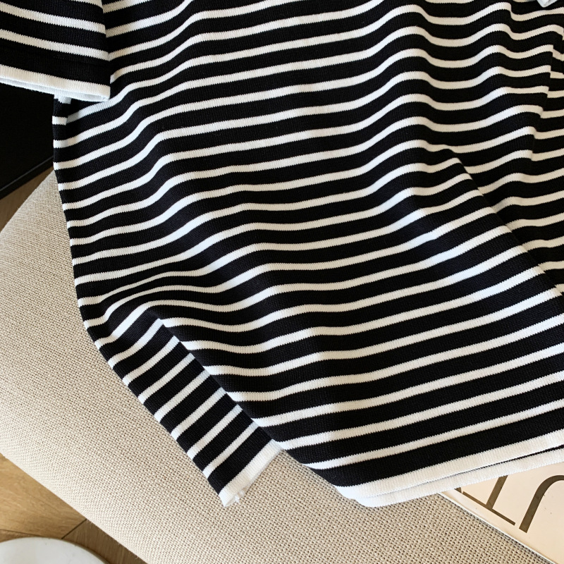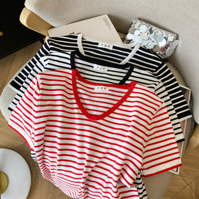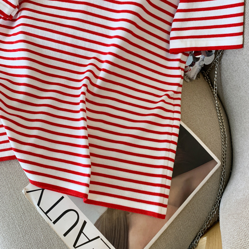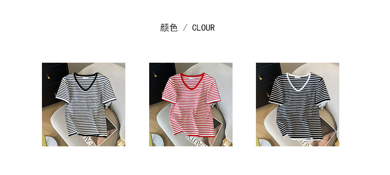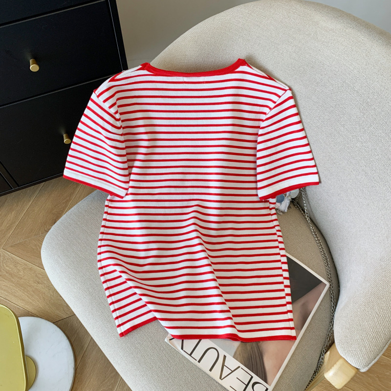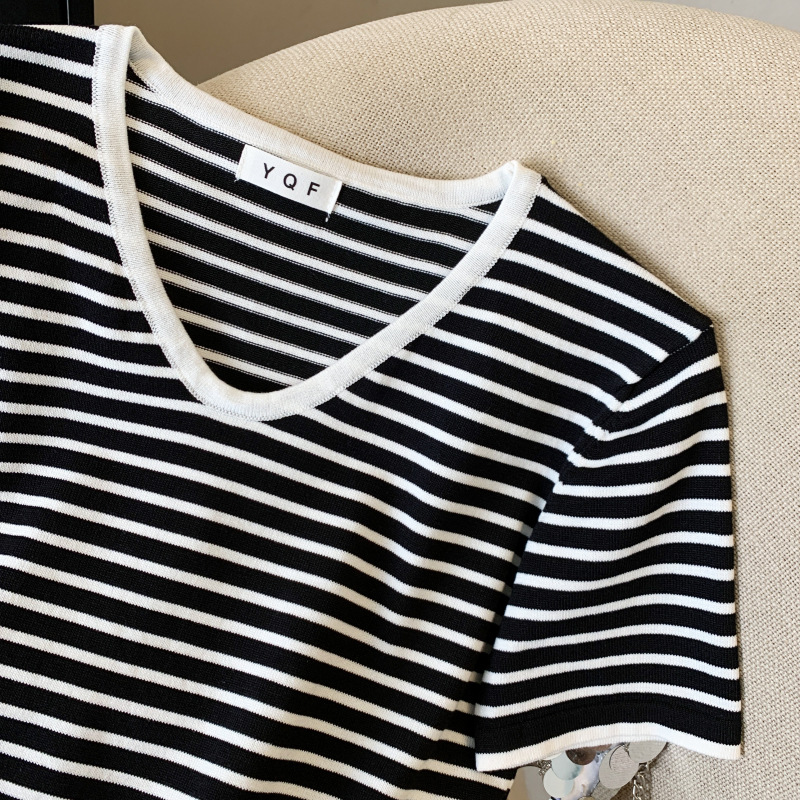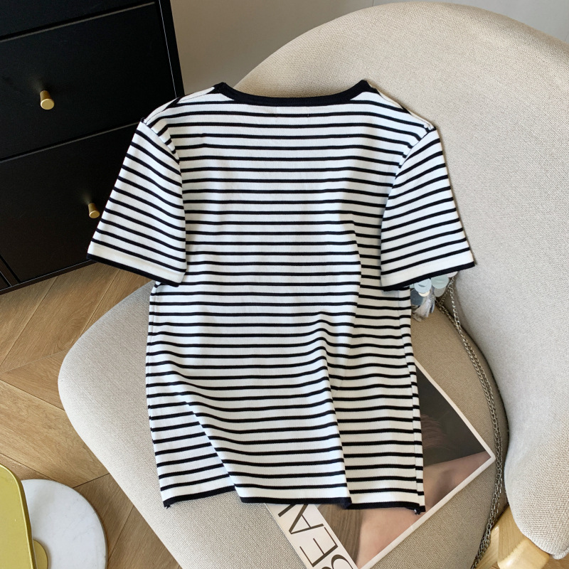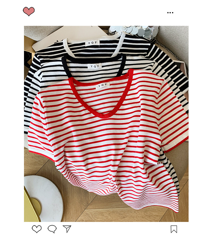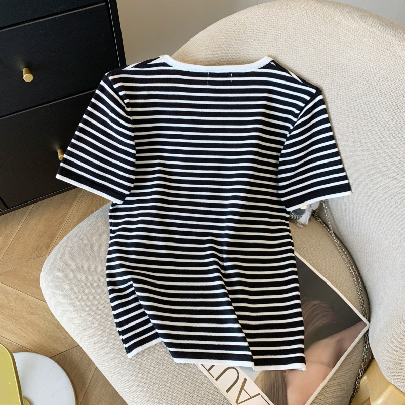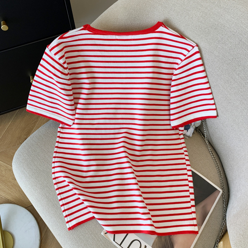 실제 샷 여성 여름 신작 한국 스타일 브이넥 스트라이프 반팔 티셔츠 여성용 패션 아이스 실크 스웨터 탑스토어 가기