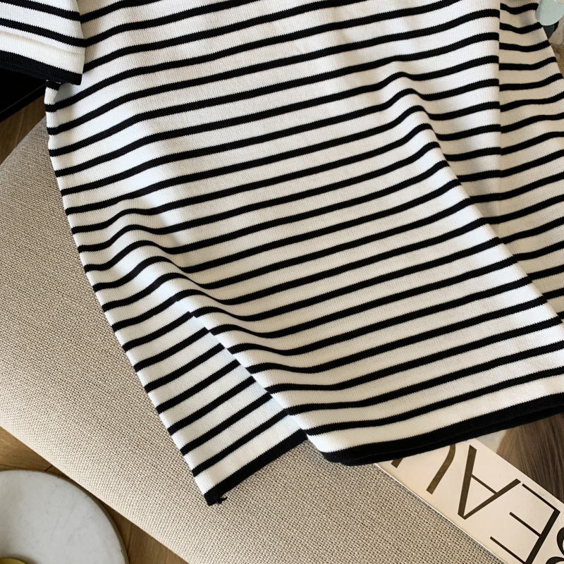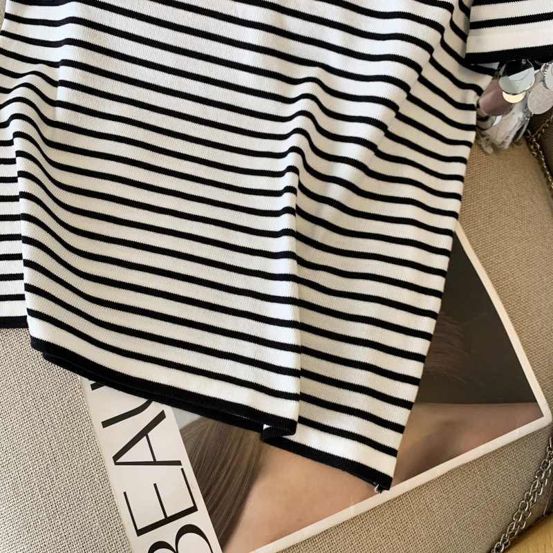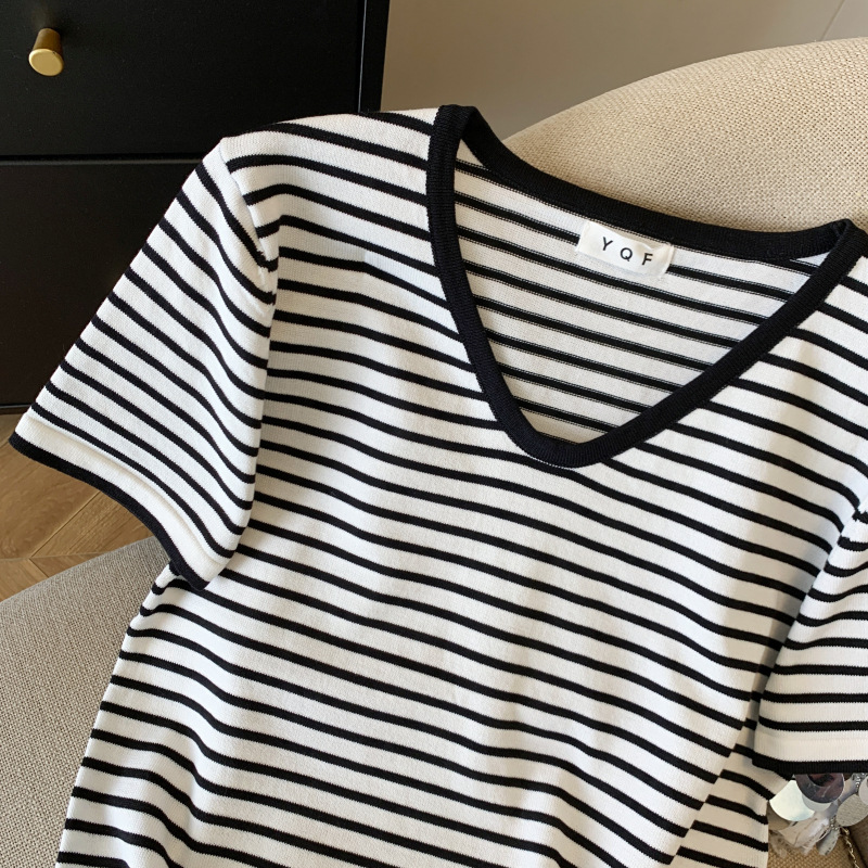 실제 샷 여성 여름 신작 한국 스타일 브이넥 스트라이프 반팔 티셔츠 여성용 패션 아이스 실크 스웨터 탑