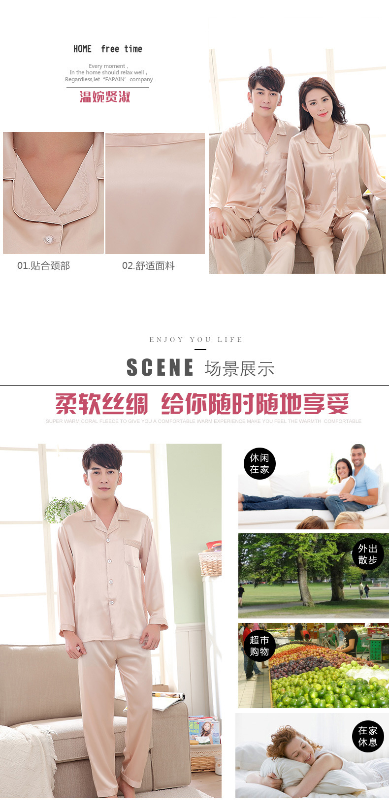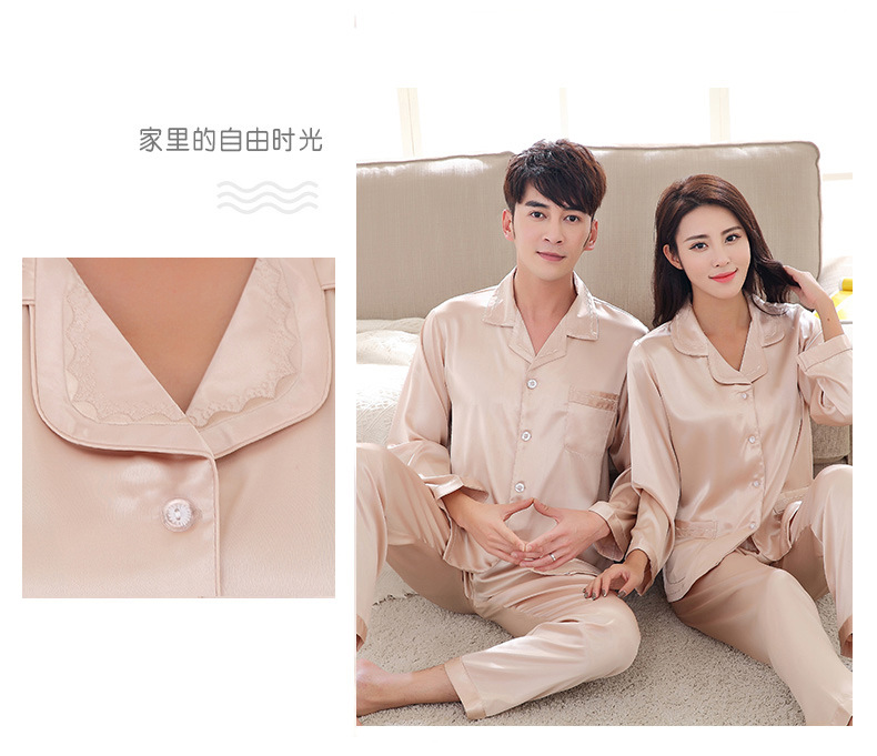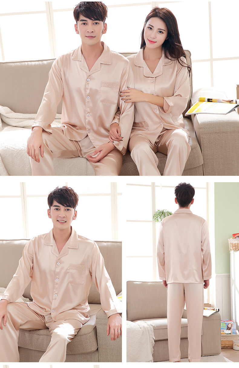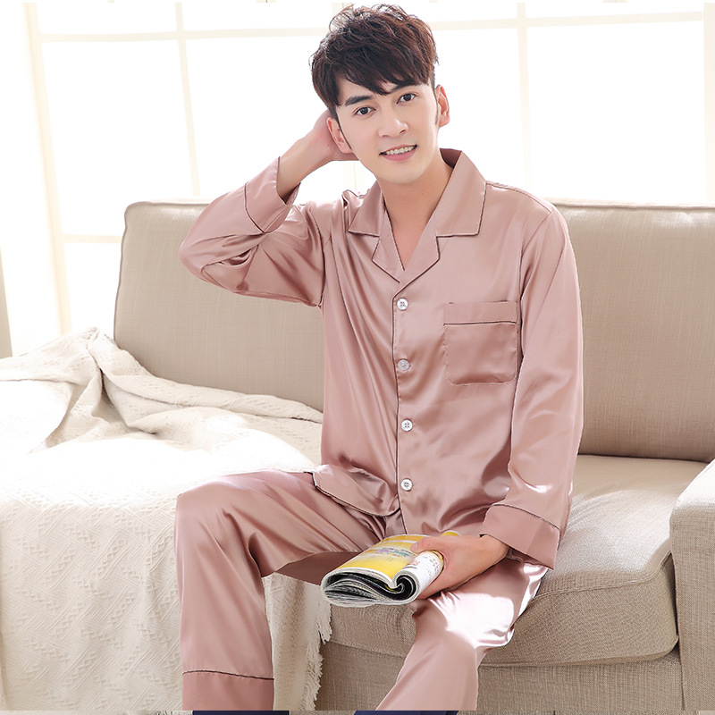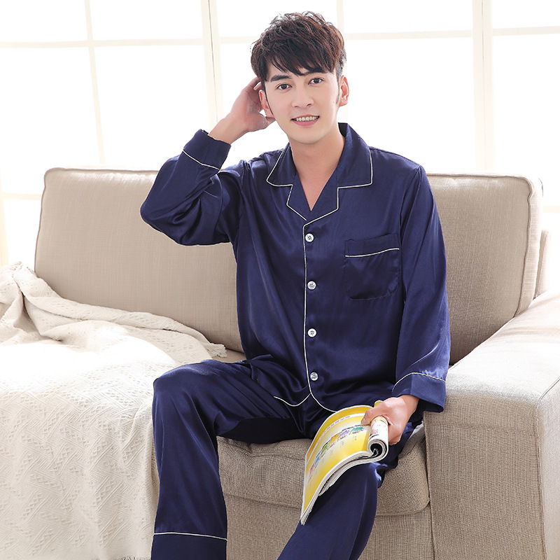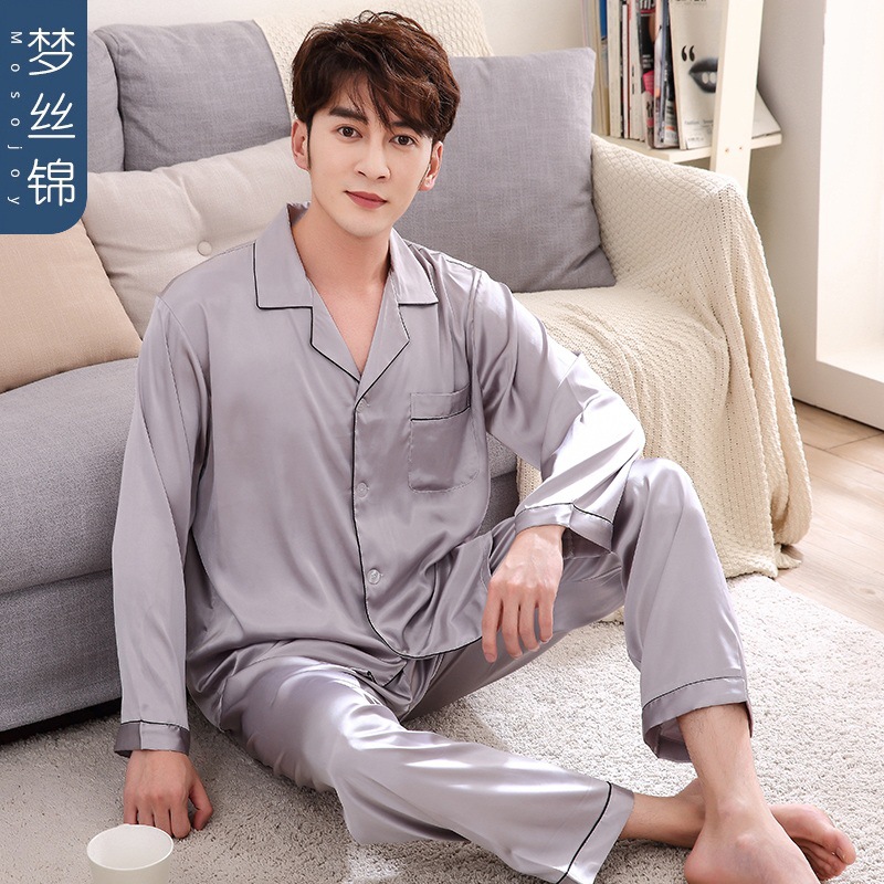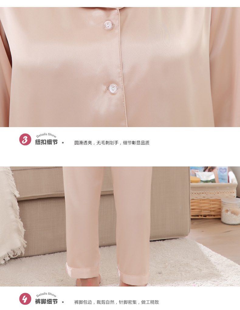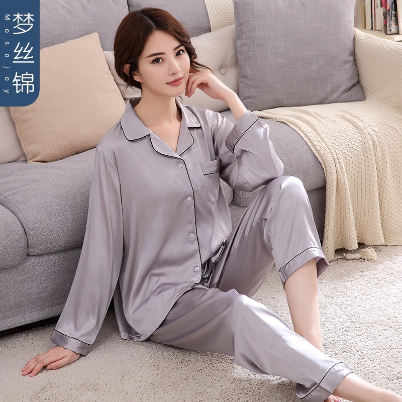 잠옷 여성의 2023 새로운 간단한 단색 긴 소매 바지 옷깃 홈 옷 느슨한 플러스 사이즈 아이스 실크 잠옷스토어 가기