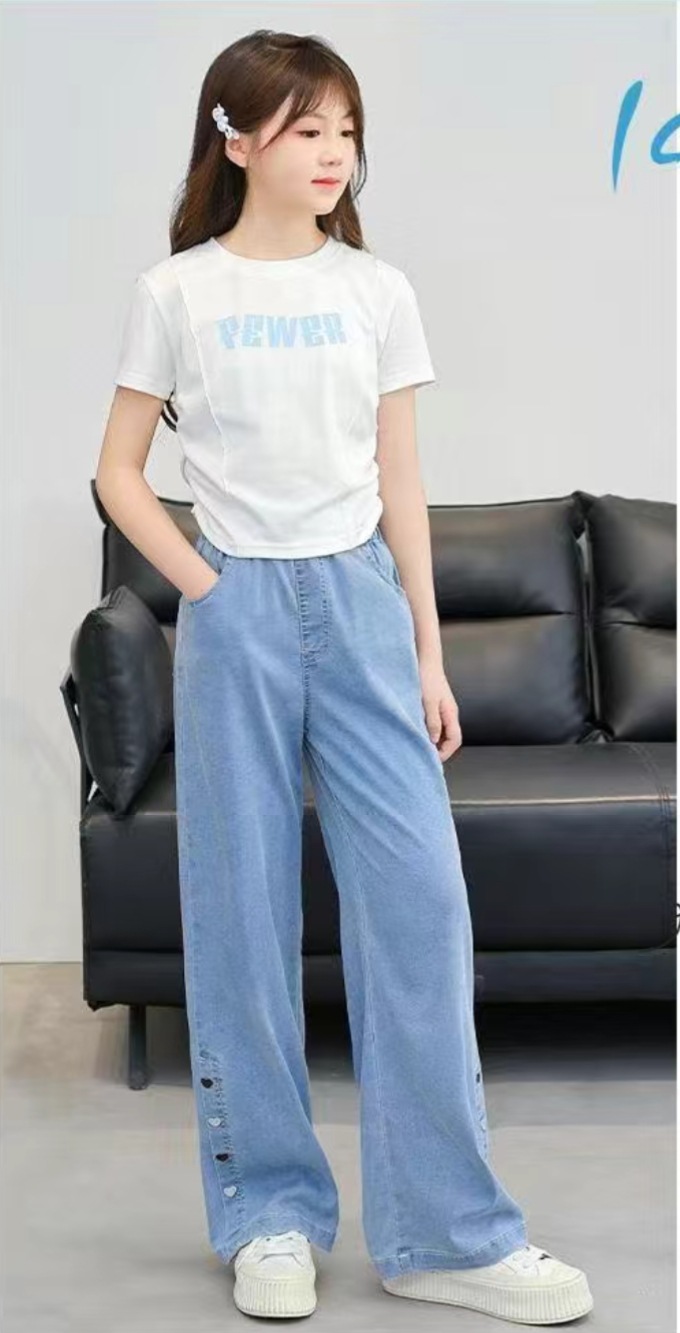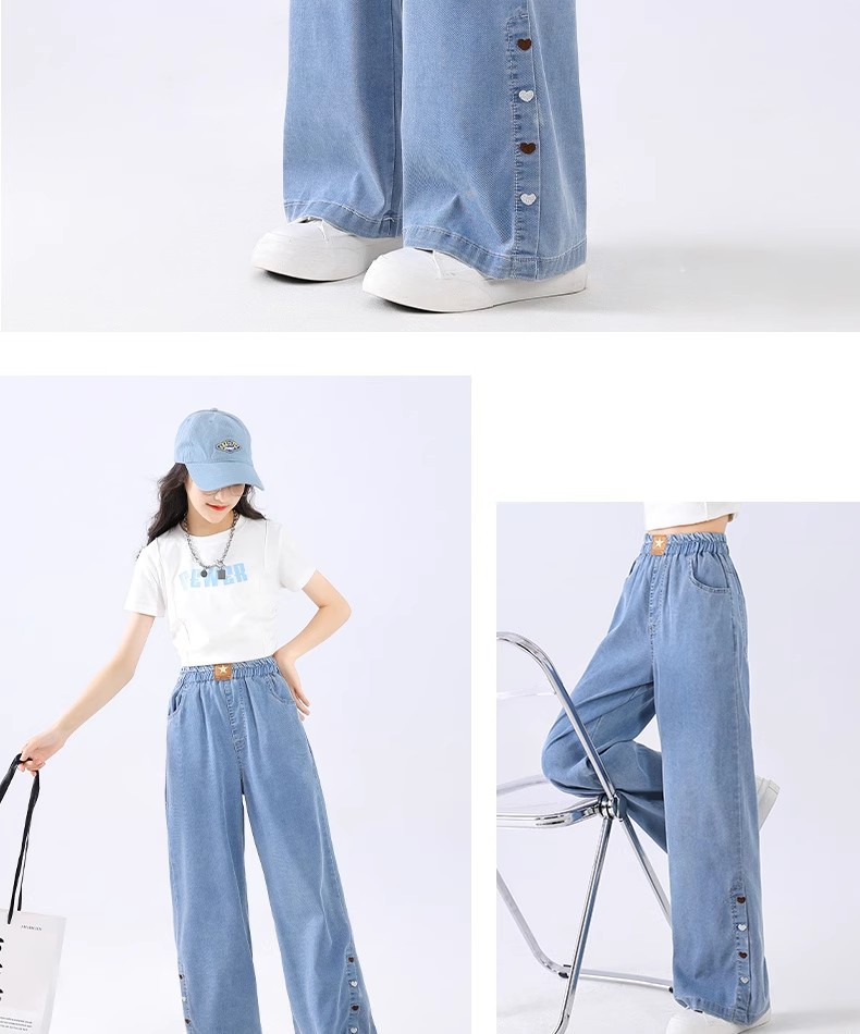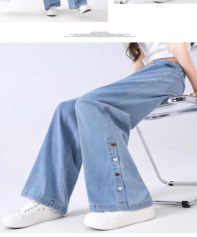 여아 텐셀 청바지, 루즈한 여름 얇은 부츠컷 팬츠, 슬림하고 드레이프한 스트레이트 네로우 와이드 팬츠, 러브 자수