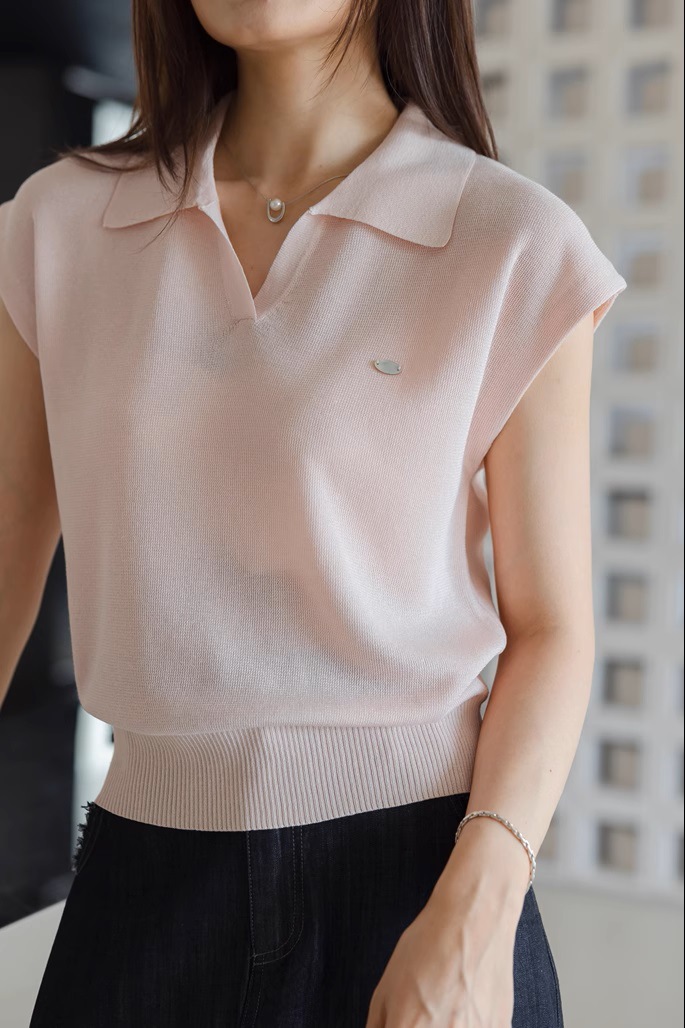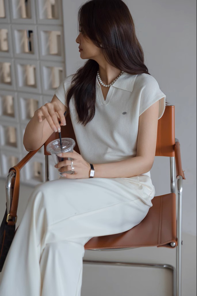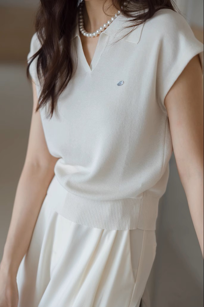 화이트 리넨 텐셀 칼라 니트 반팔 통근 여성 새 여름 우아한 짧은 폴로 셔츠 탑