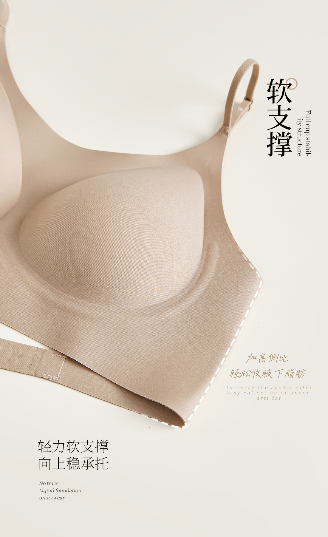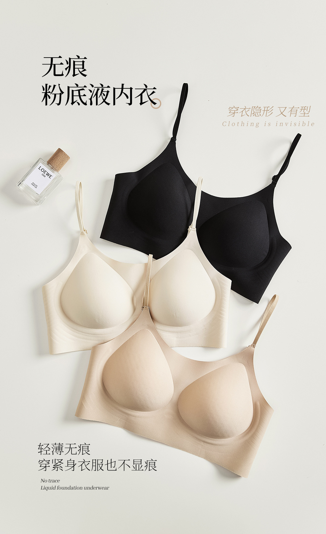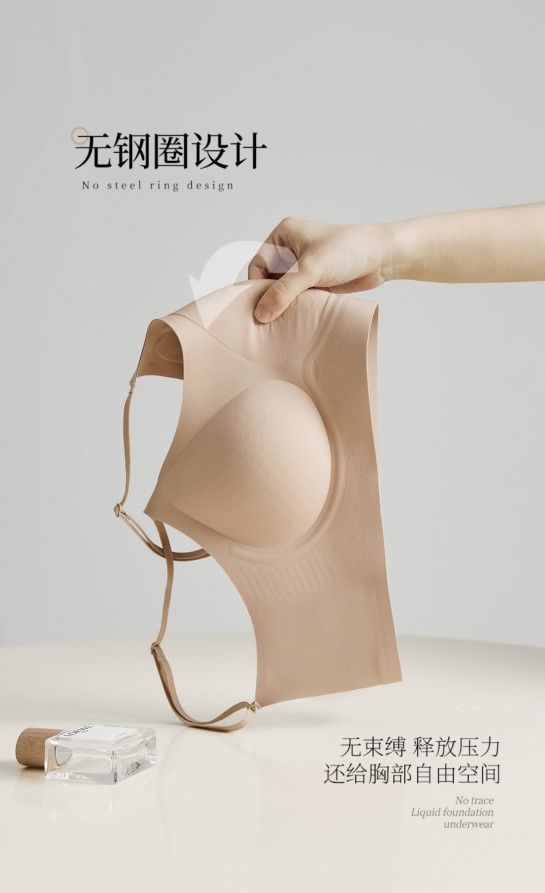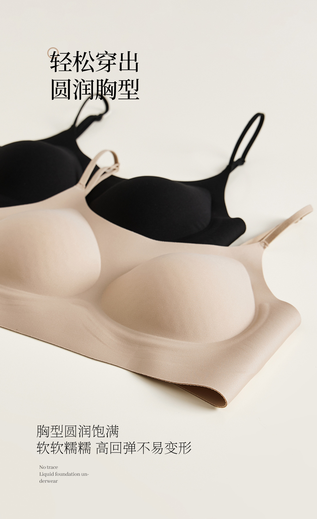 흔적없는 투명 파운데이션형 여성 속옷, 얇은 노와이어 편안한 고정컵, 작은 가슴을 모아주는 아름다운 등 라인 조절 브라
