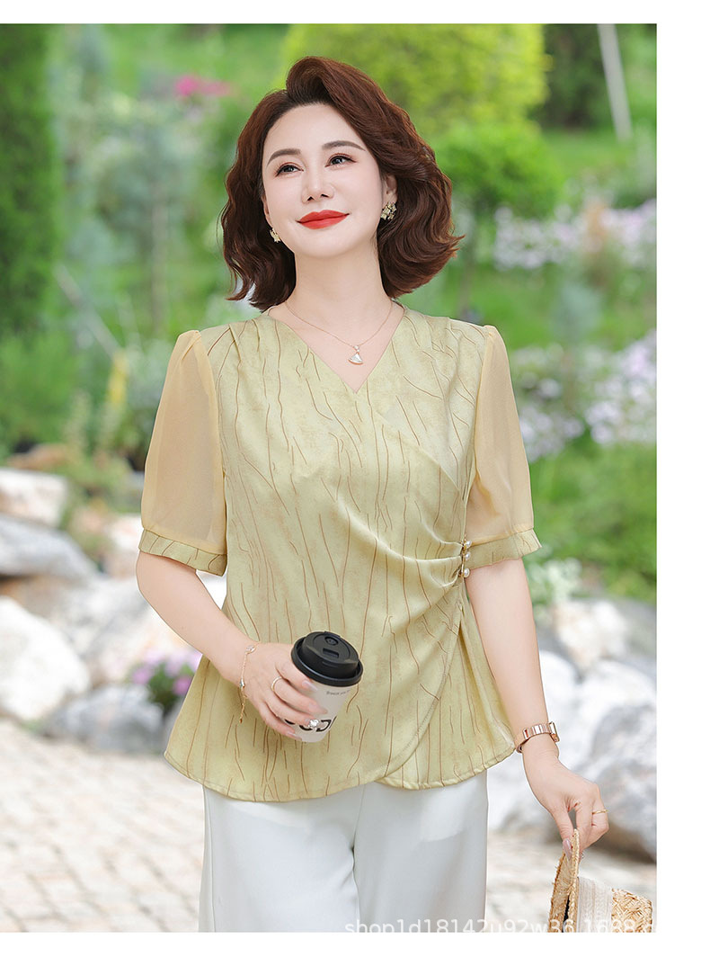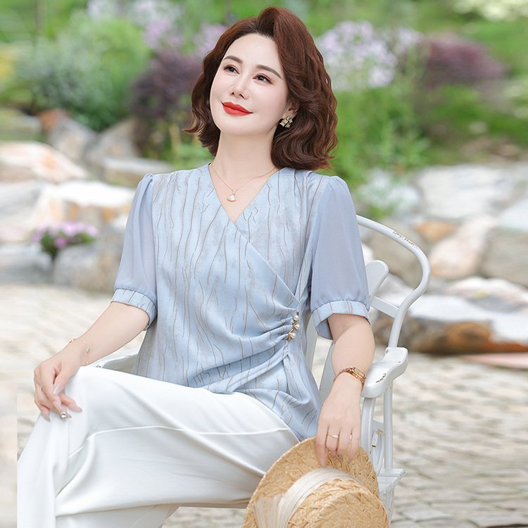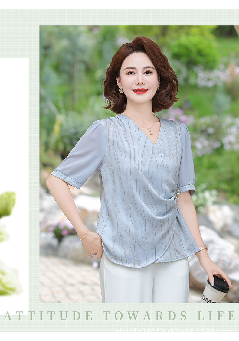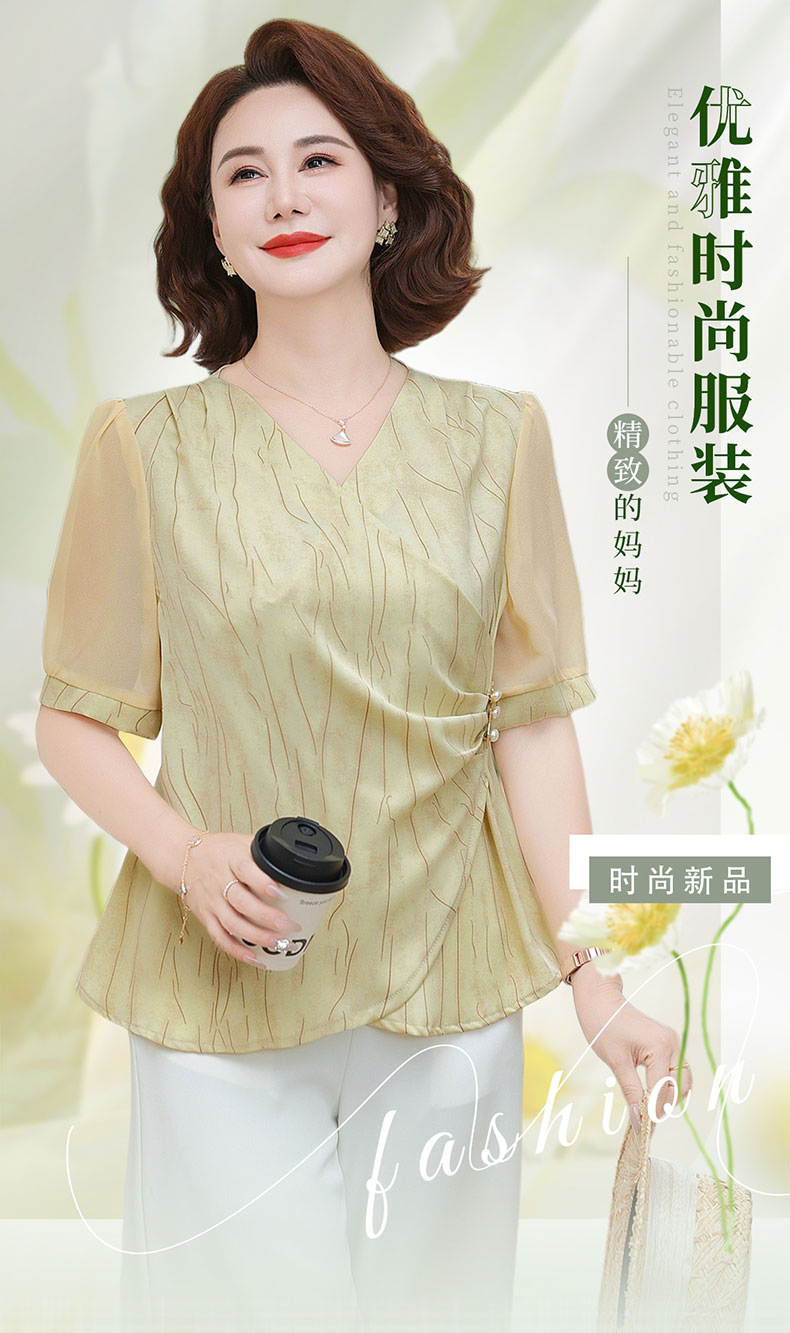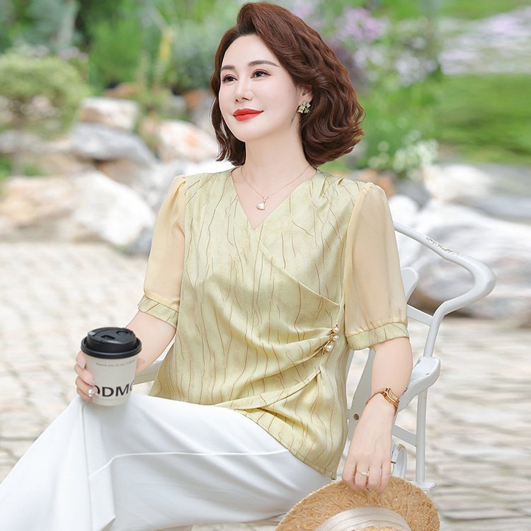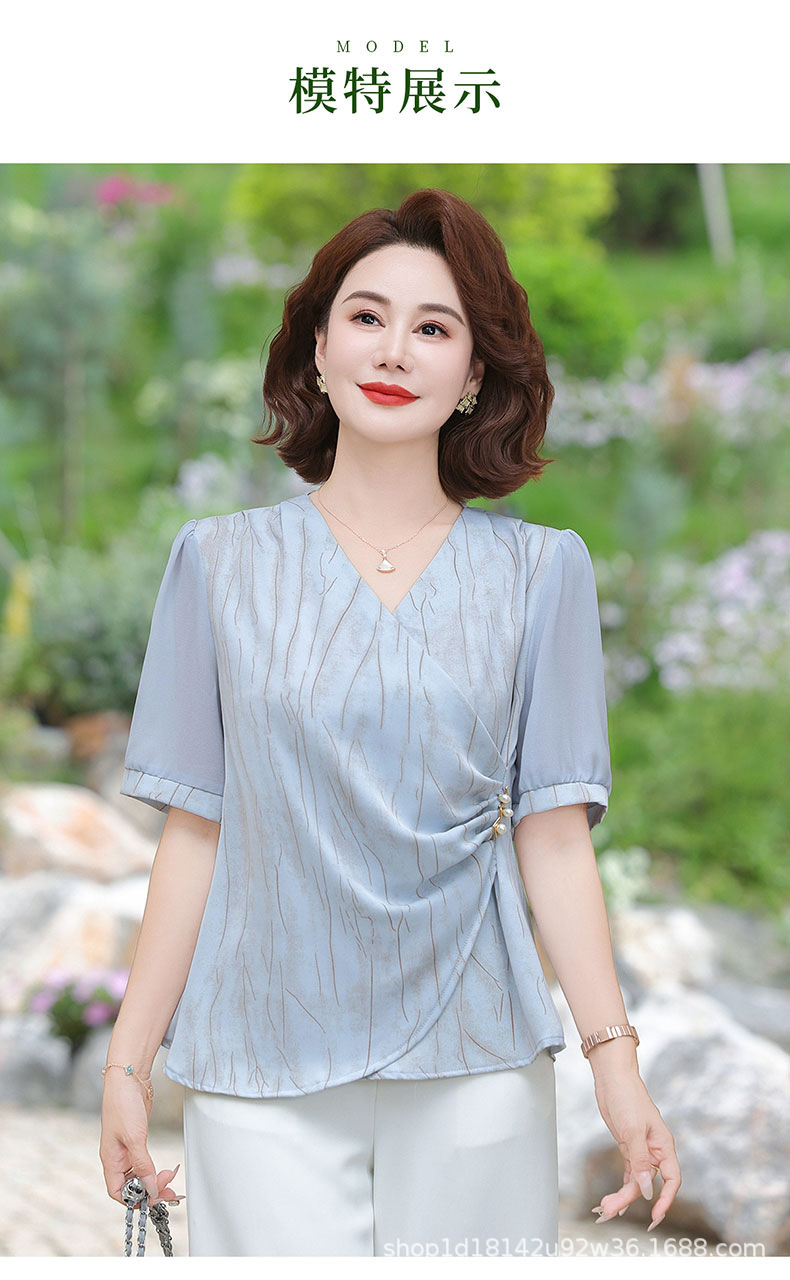 중년 어머니 여름 탑 반팔 쉬폰 셔츠 2025 새로운 패션 셔츠 중년 및 노인 여성 여름 셔츠스토어 가기