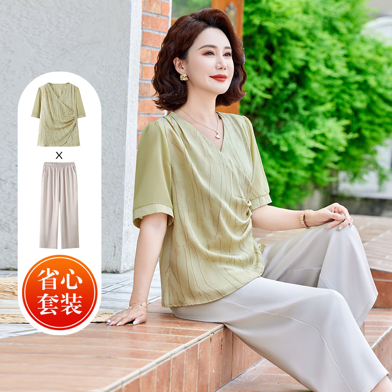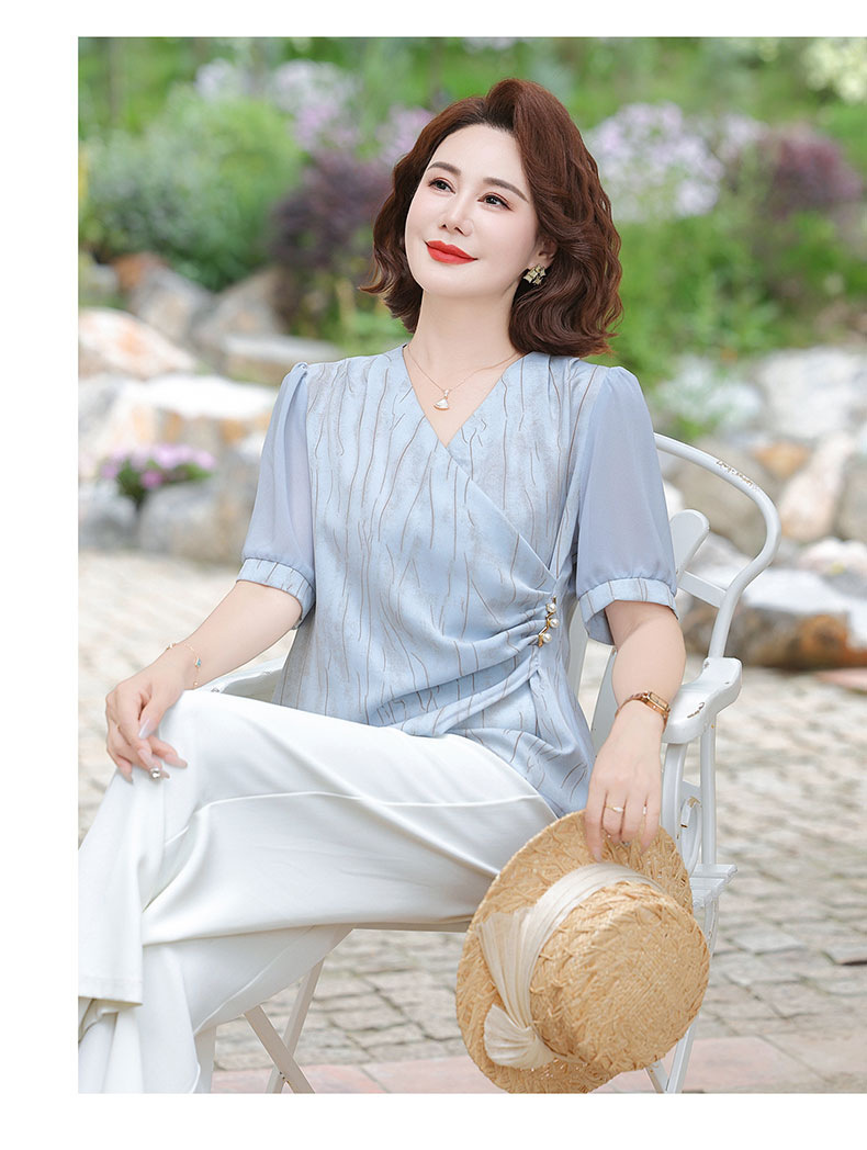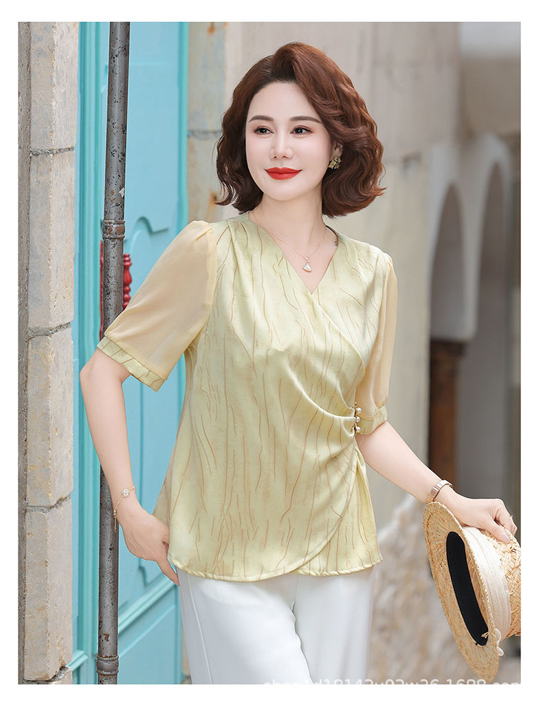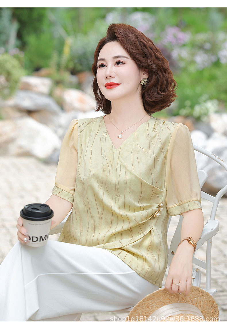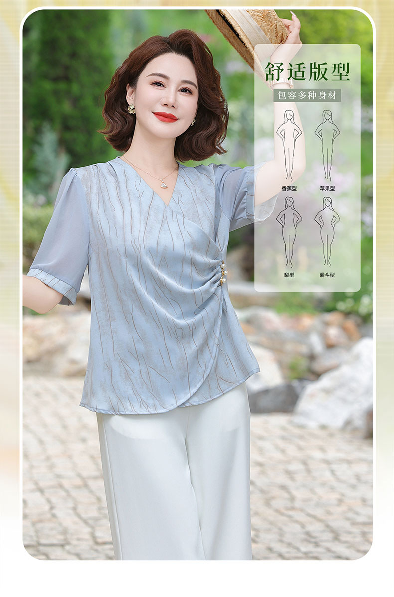 중년 어머니 여름 탑 반팔 쉬폰 셔츠 2025 새로운 패션 셔츠 중년 및 노인 여성 여름 셔츠