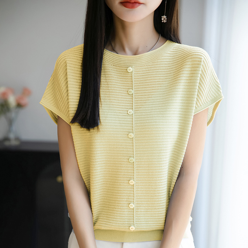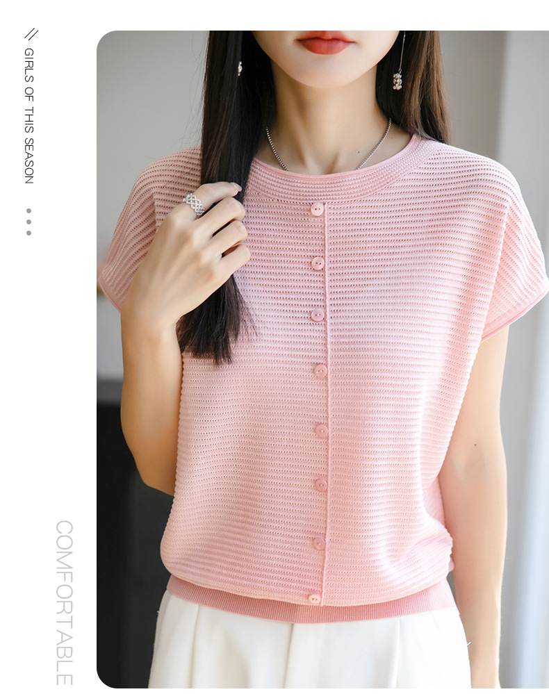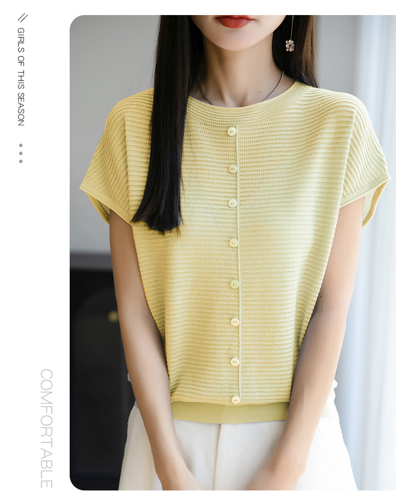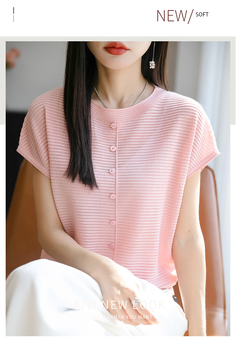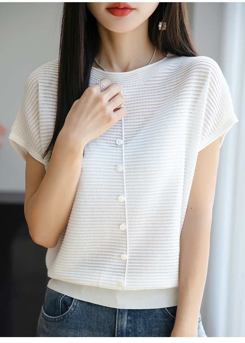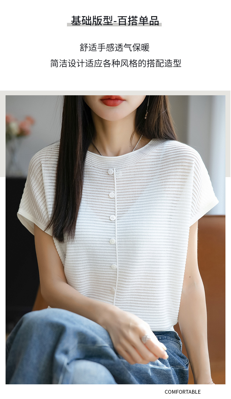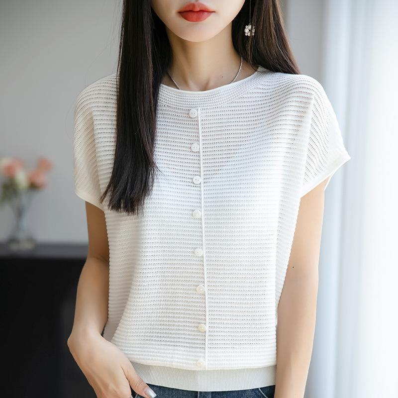 여름 신작 아이스 실크 버튼 핏 라운드 넥 배트 슬리브 반팔 스웨터 여성용 중공 티셔츠 탑 바닥 셔츠