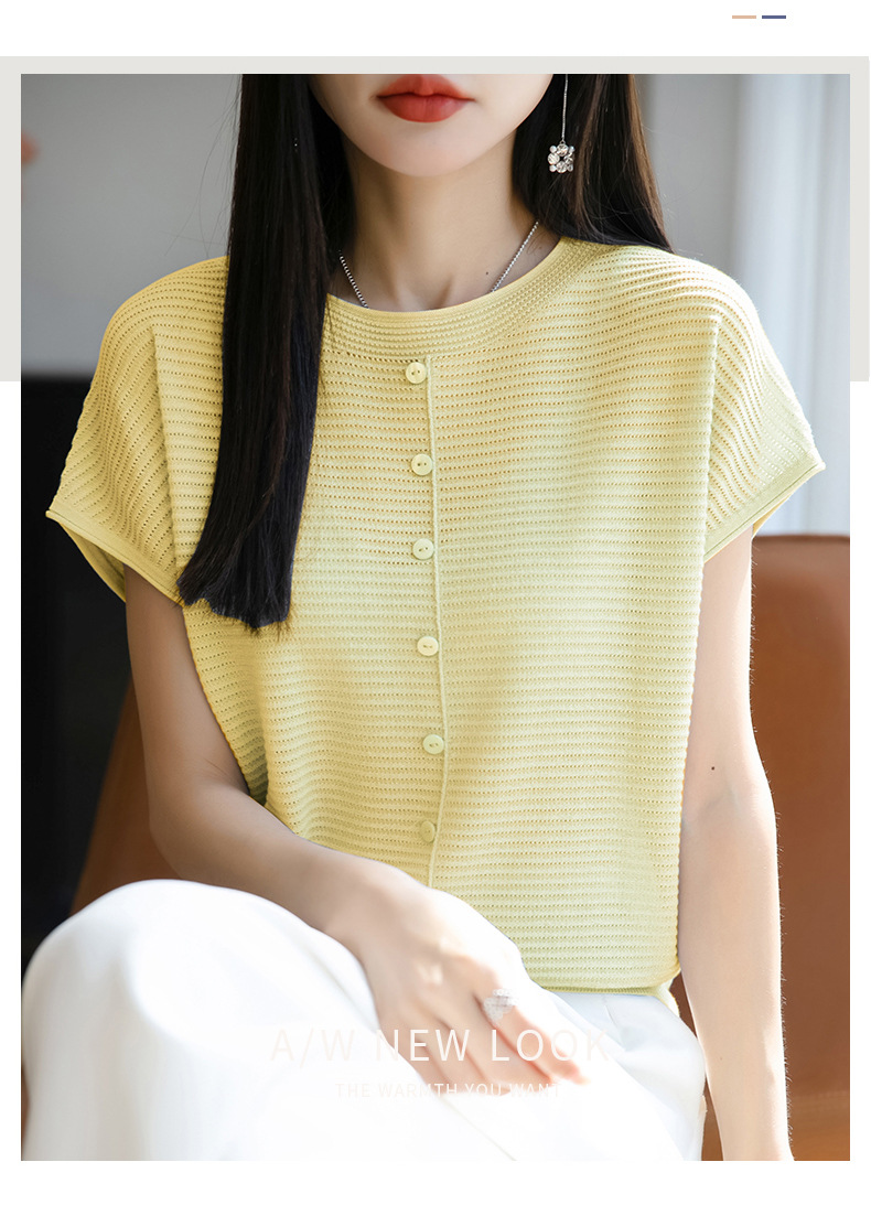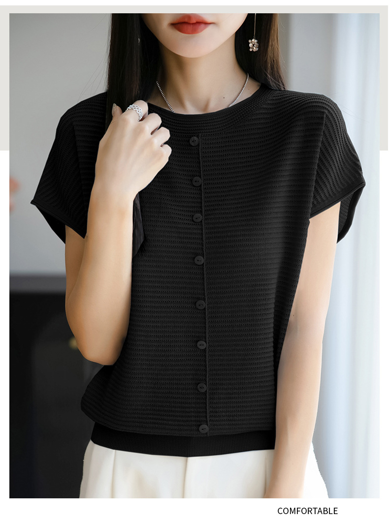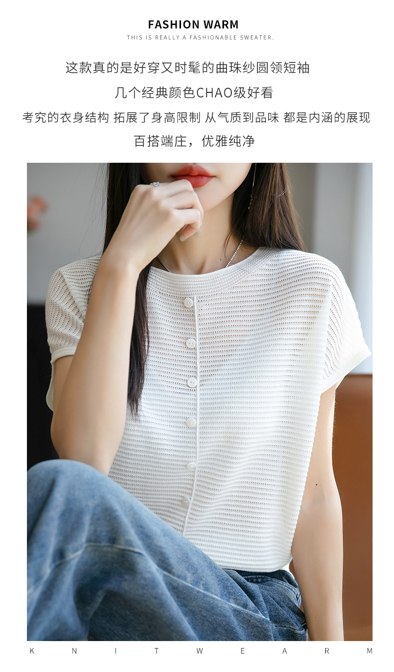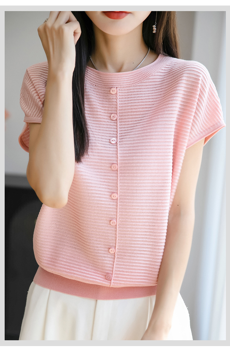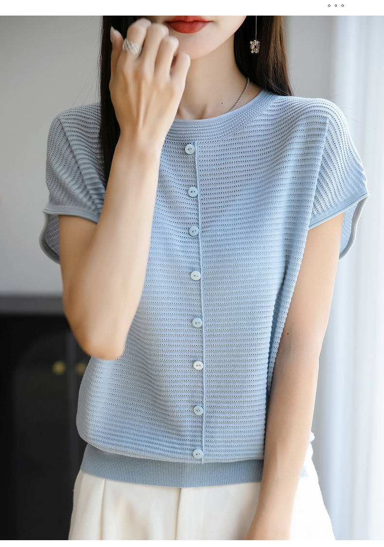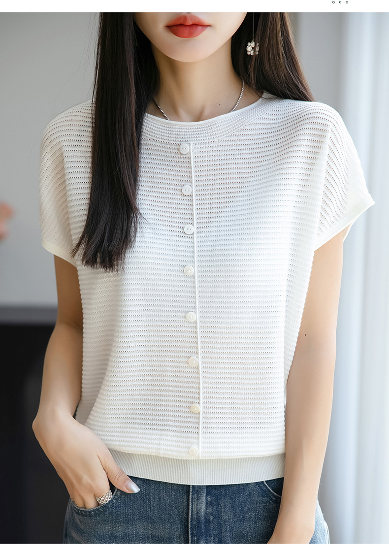여름 신작 아이스 실크 버튼 핏 라운드 넥 배트 슬리브 반팔 스웨터 여성용 중공 티셔츠 탑 바닥 셔츠