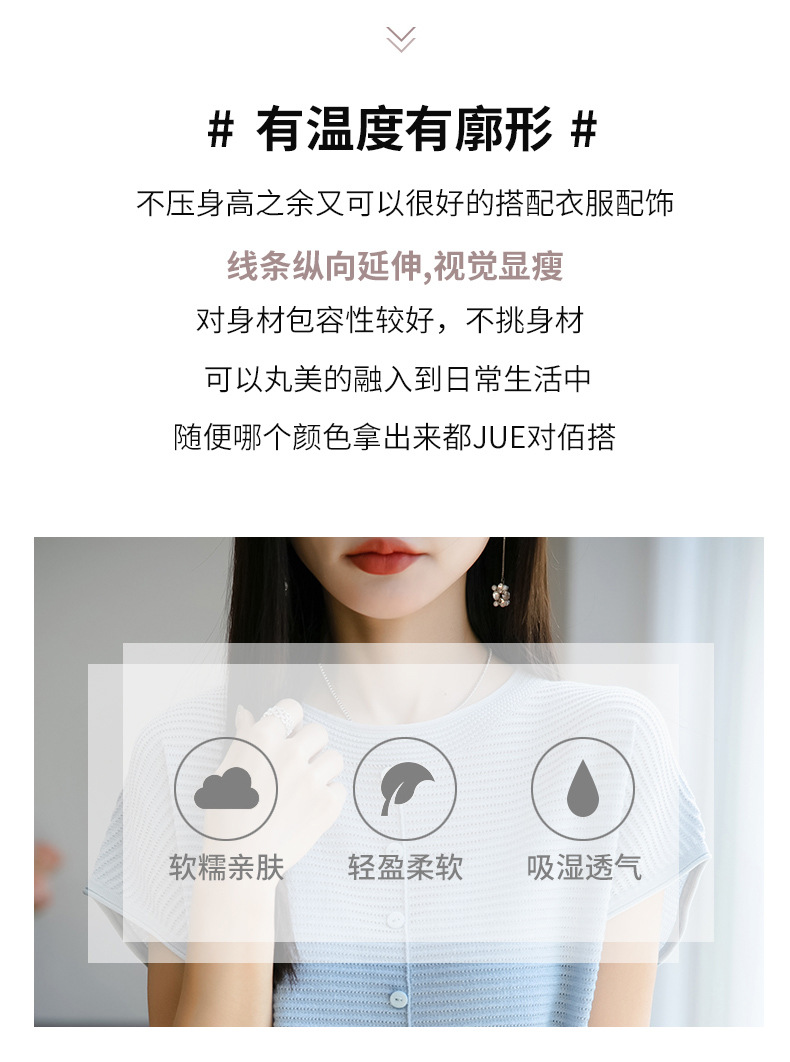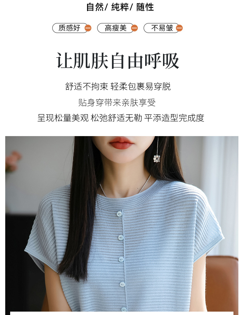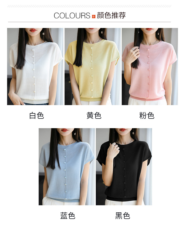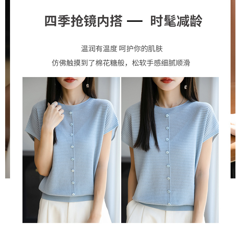 여름 신작 아이스 실크 버튼 핏 라운드 넥 배트 슬리브 반팔 스웨터 여성용 중공 티셔츠 탑 바닥 셔츠스토어 가기
