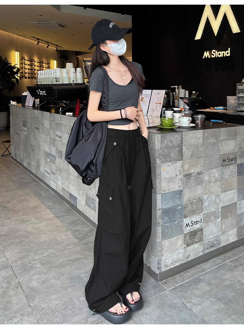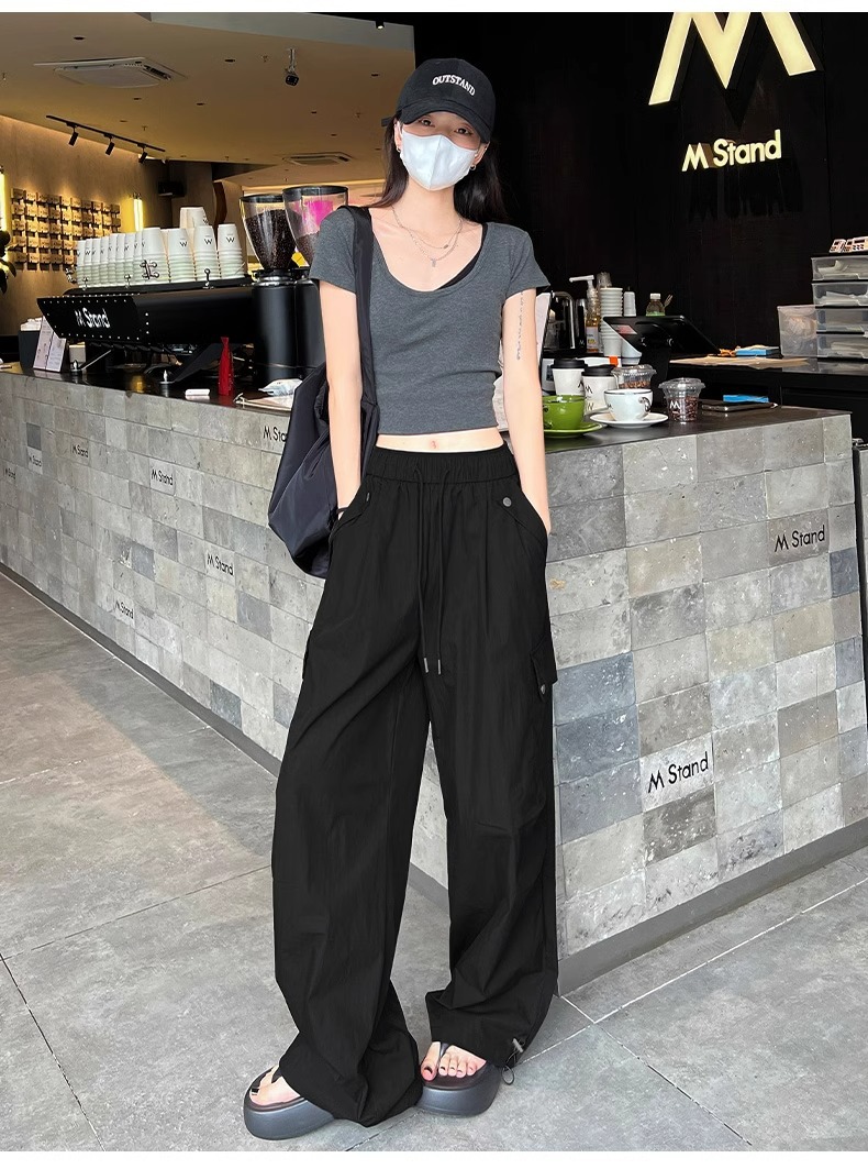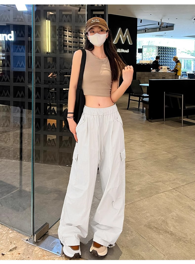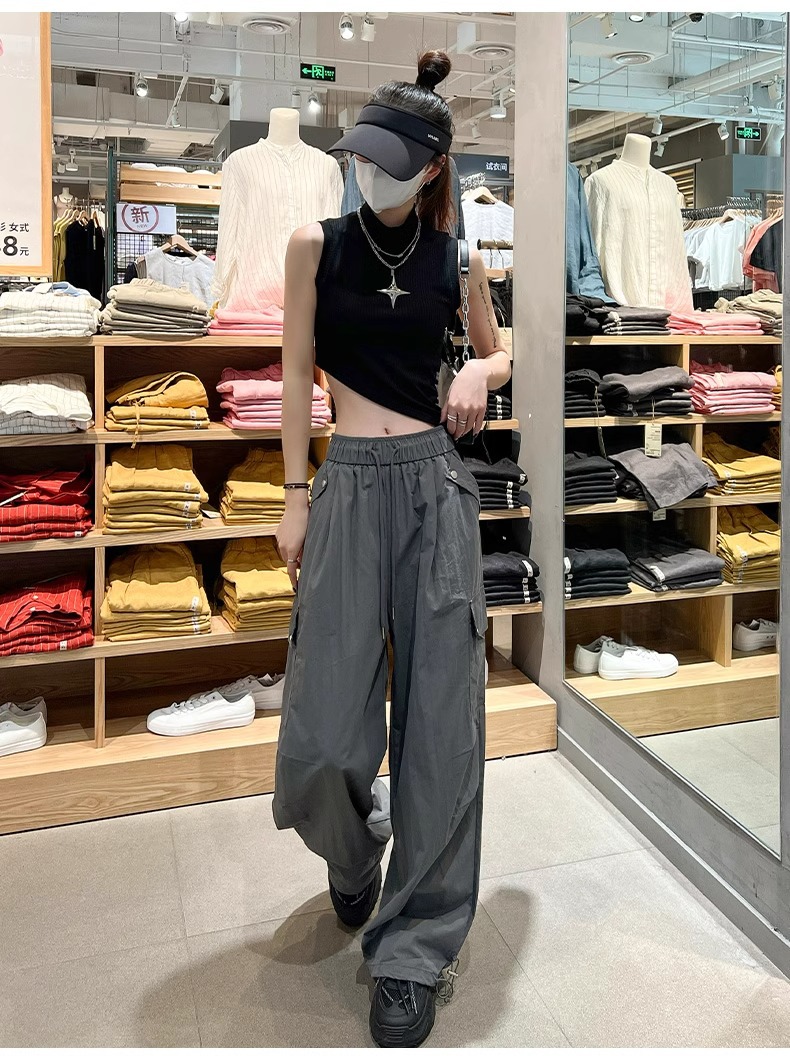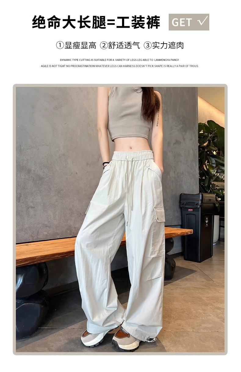 145 짧은 툴링 바지 여자 느슨한 봄과 가을 넓은 다리 캐주얼 바지 150 높은 허리 등산 미국 스포츠 바지스토어 가기