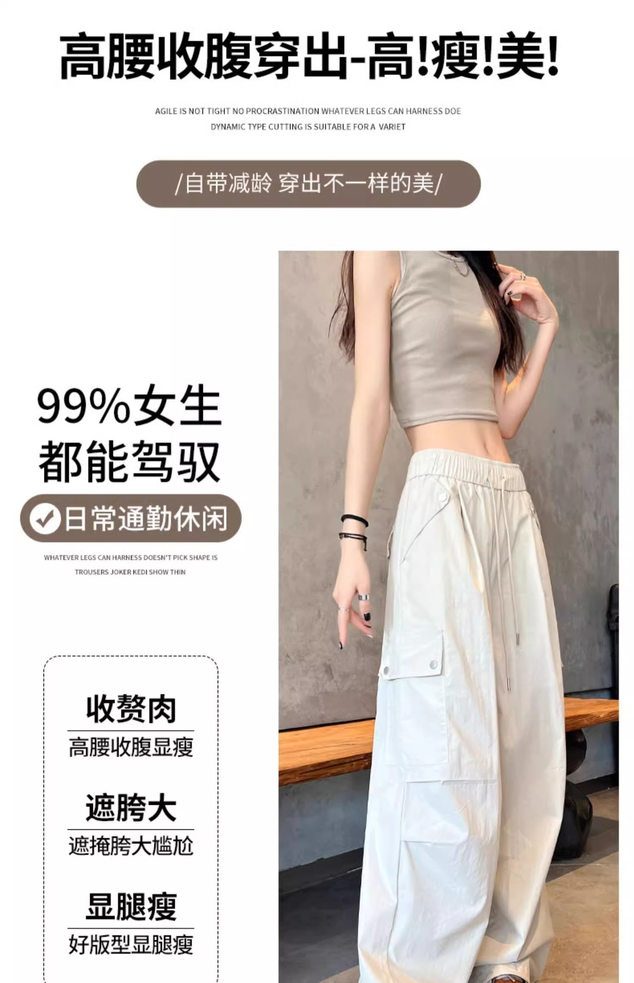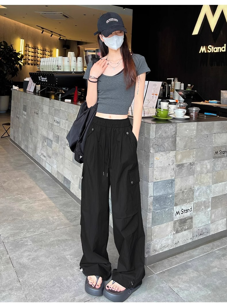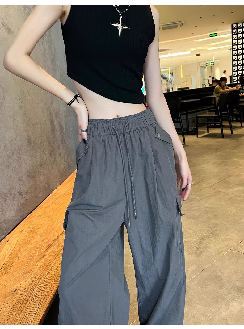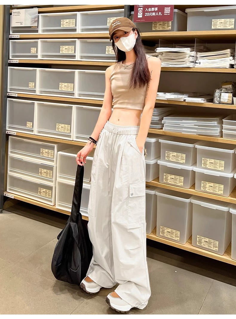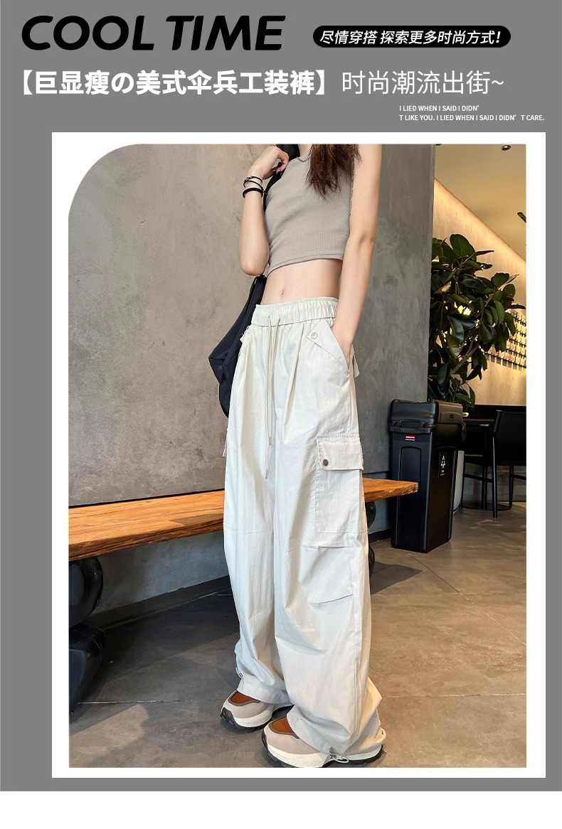 145 짧은 툴링 바지 여자 느슨한 봄과 가을 넓은 다리 캐주얼 바지 150 높은 허리 등산 미국 스포츠 바지스토어 가기