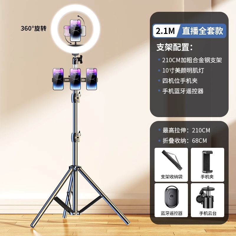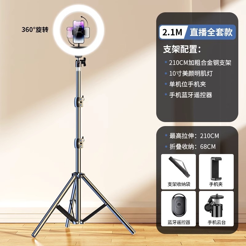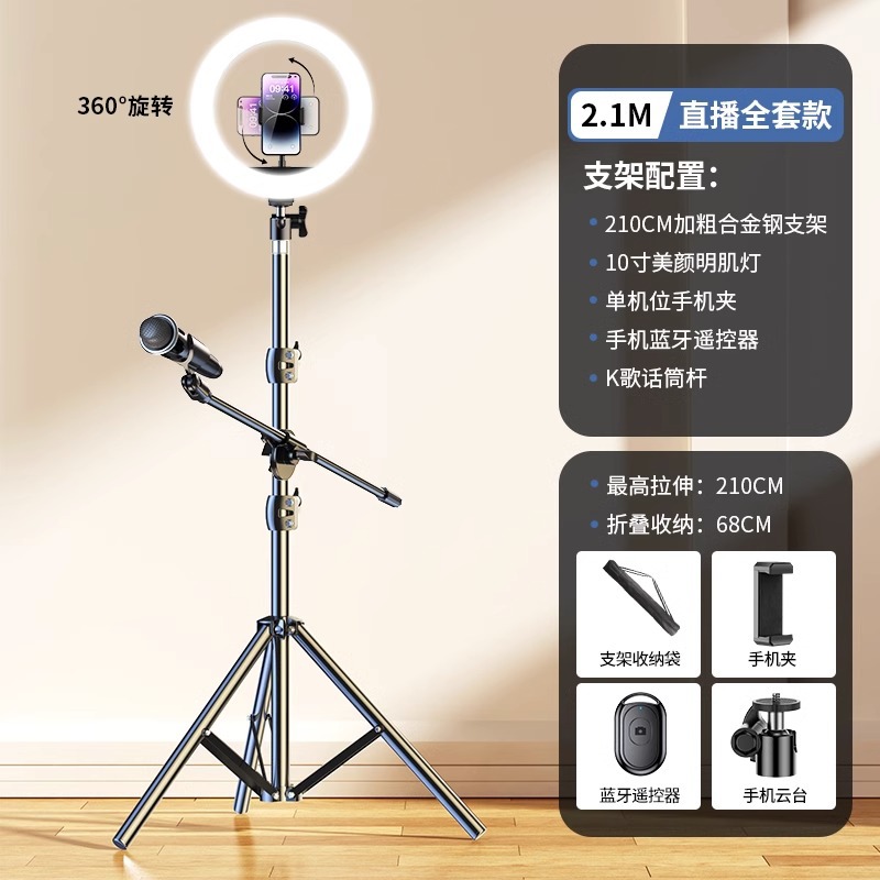 • 2.1m [업그레이드된 합금 스탠드] 10inch 조명 + 마이크 스탠드 + 싱글 카메라 + 셀카 + 보관 가방