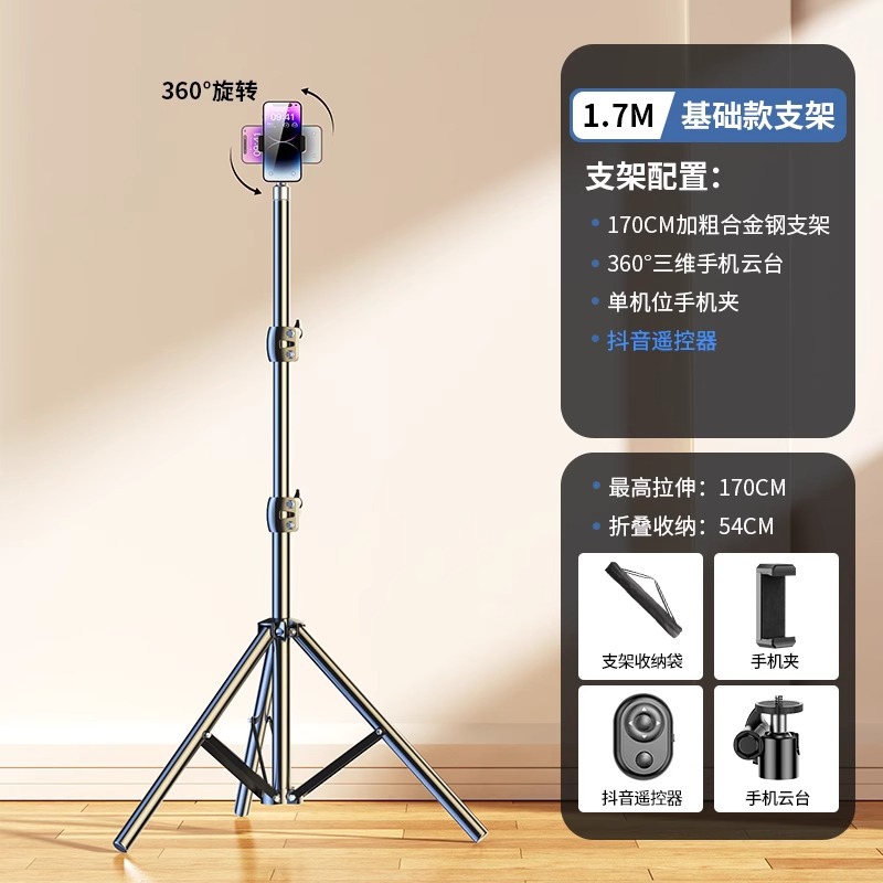 • 1.7m [업그레이드된 합금 브래킷] + [Douyin 리모콘] 단일 카메라 + 보관 가방.