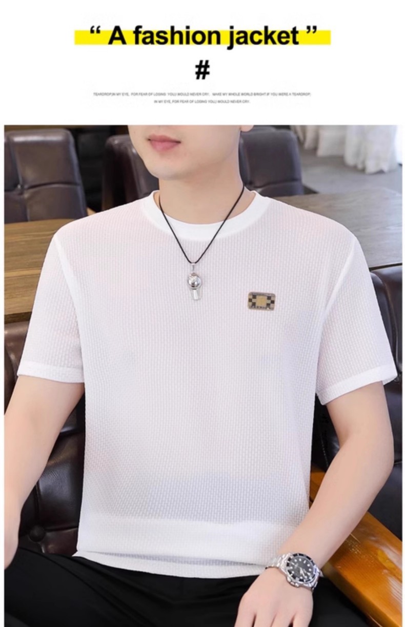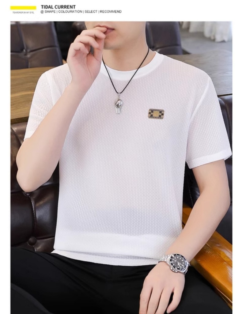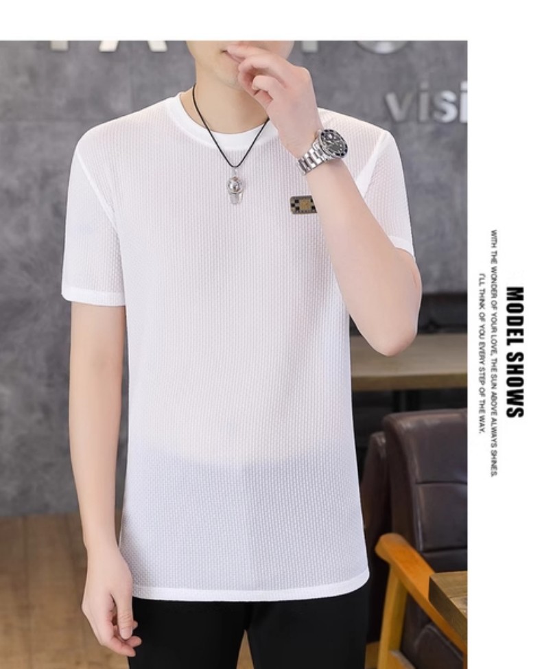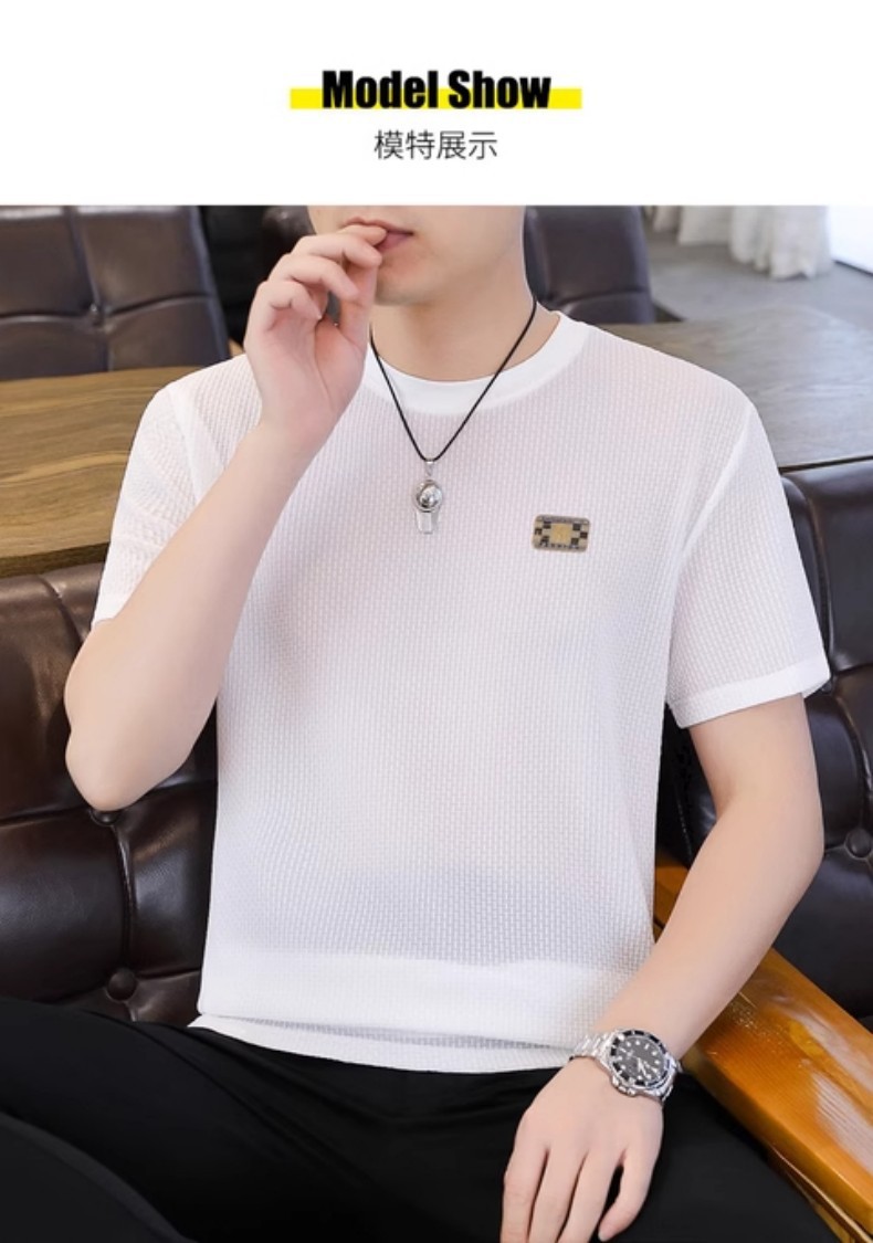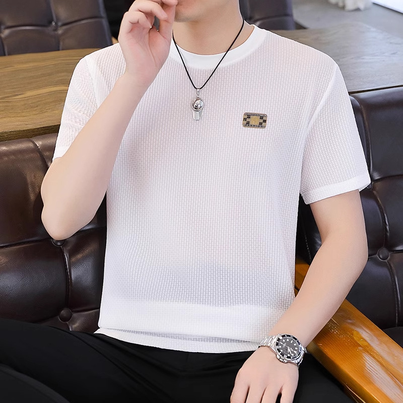아이스 실크 반팔 티셔츠 남성용 여름 얇은 통기성 슬림 핏 어퍼 의류 플러스 사이즈 티셔츠 남성용 할로우 반소매 티셔츠스토어 가기