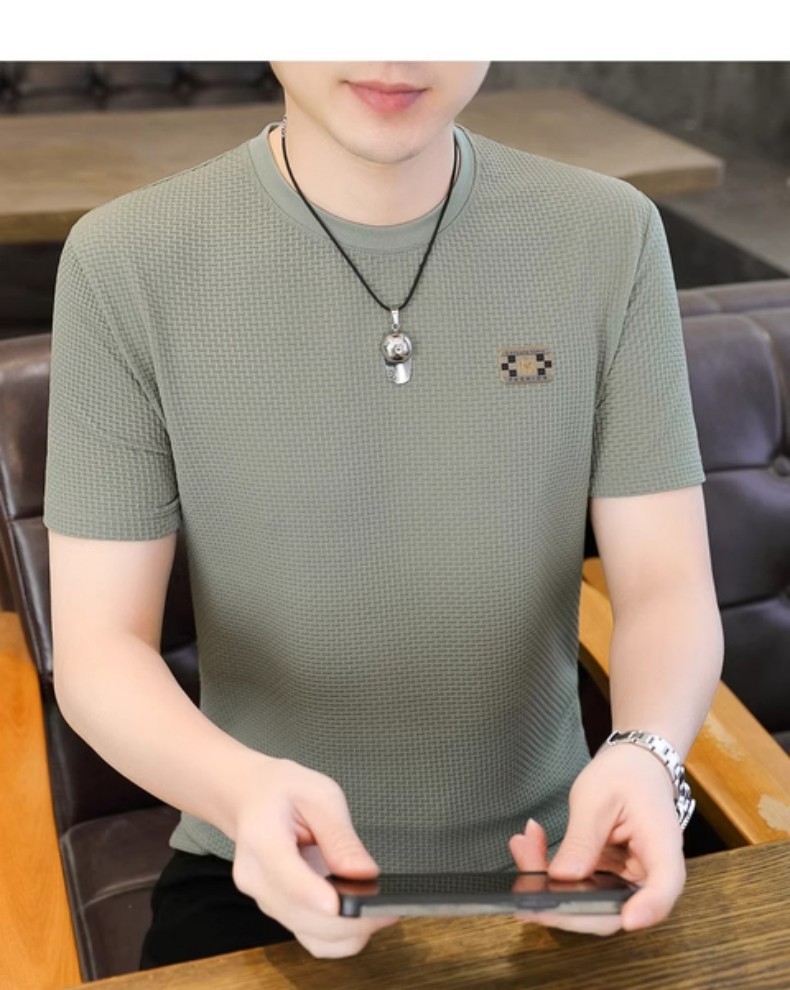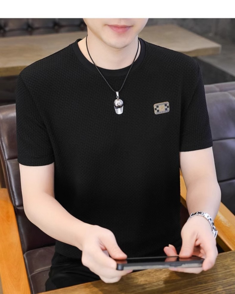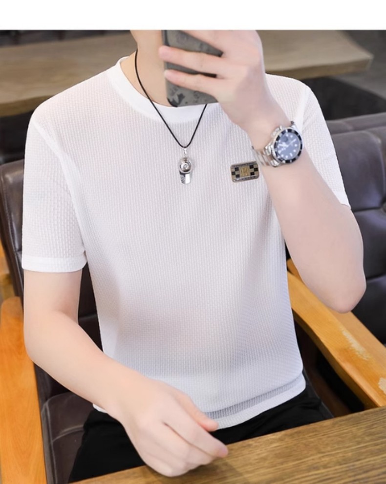 아이스 실크 반팔 티셔츠 남성용 여름 얇은 통기성 슬림 핏 어퍼 의류 플러스 사이즈 티셔츠 남성용 할로우 반소매 티셔츠