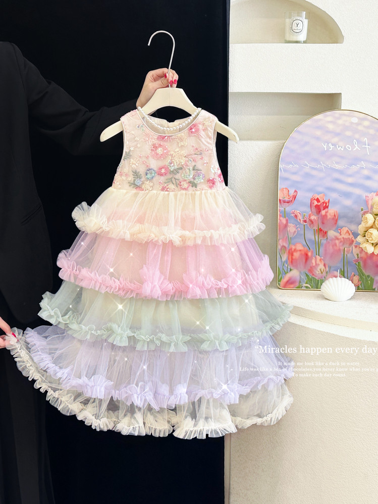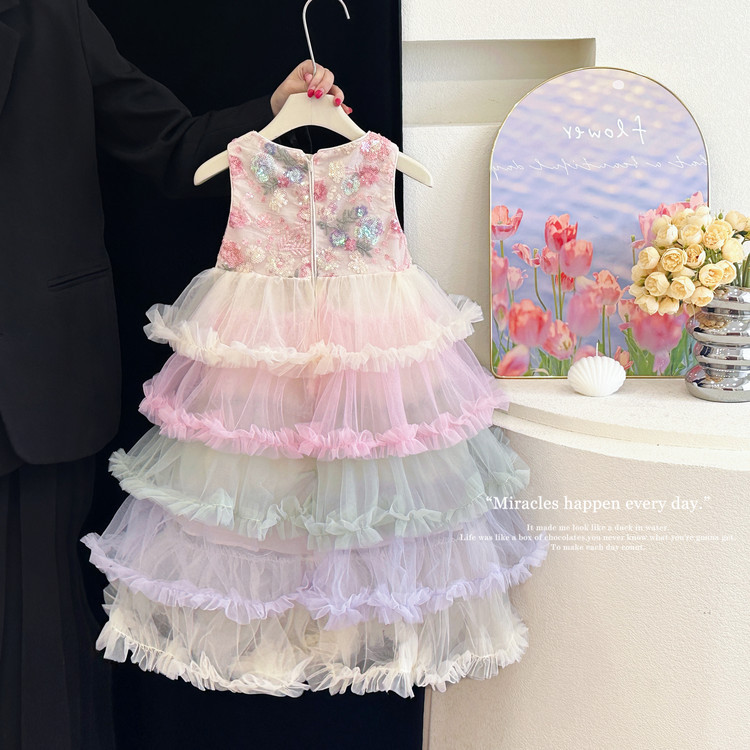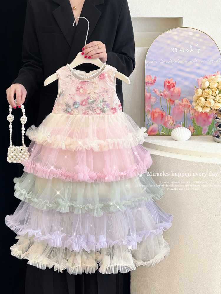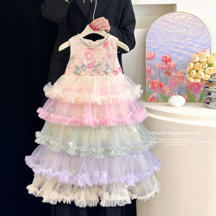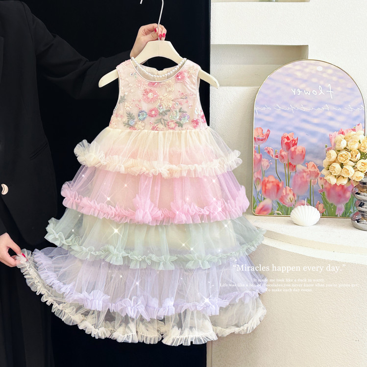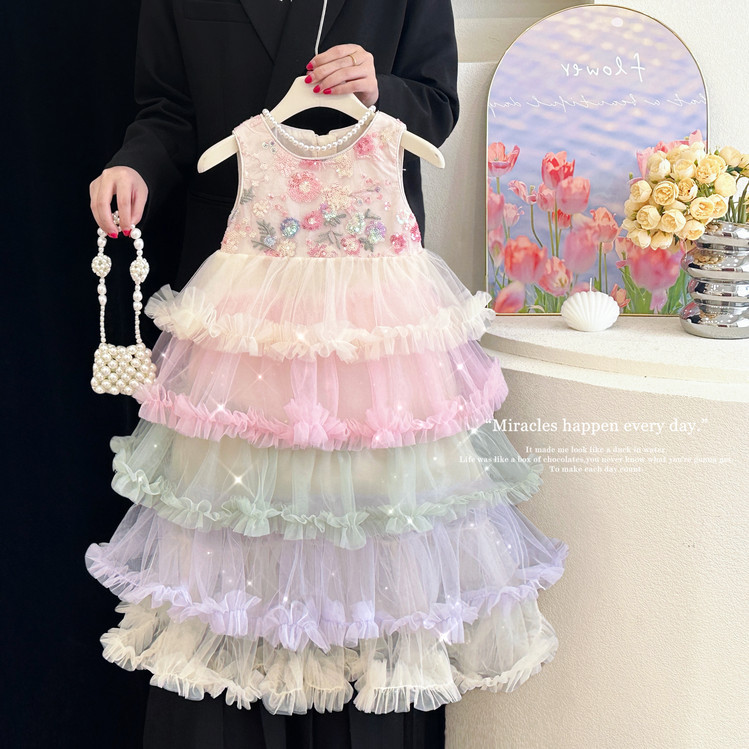 로리타 공주 드레스 어린이 여름 새 스타일 아기 소녀 달콤한 무지개 메쉬 드레스 민소매 조끼 드레스 유행
