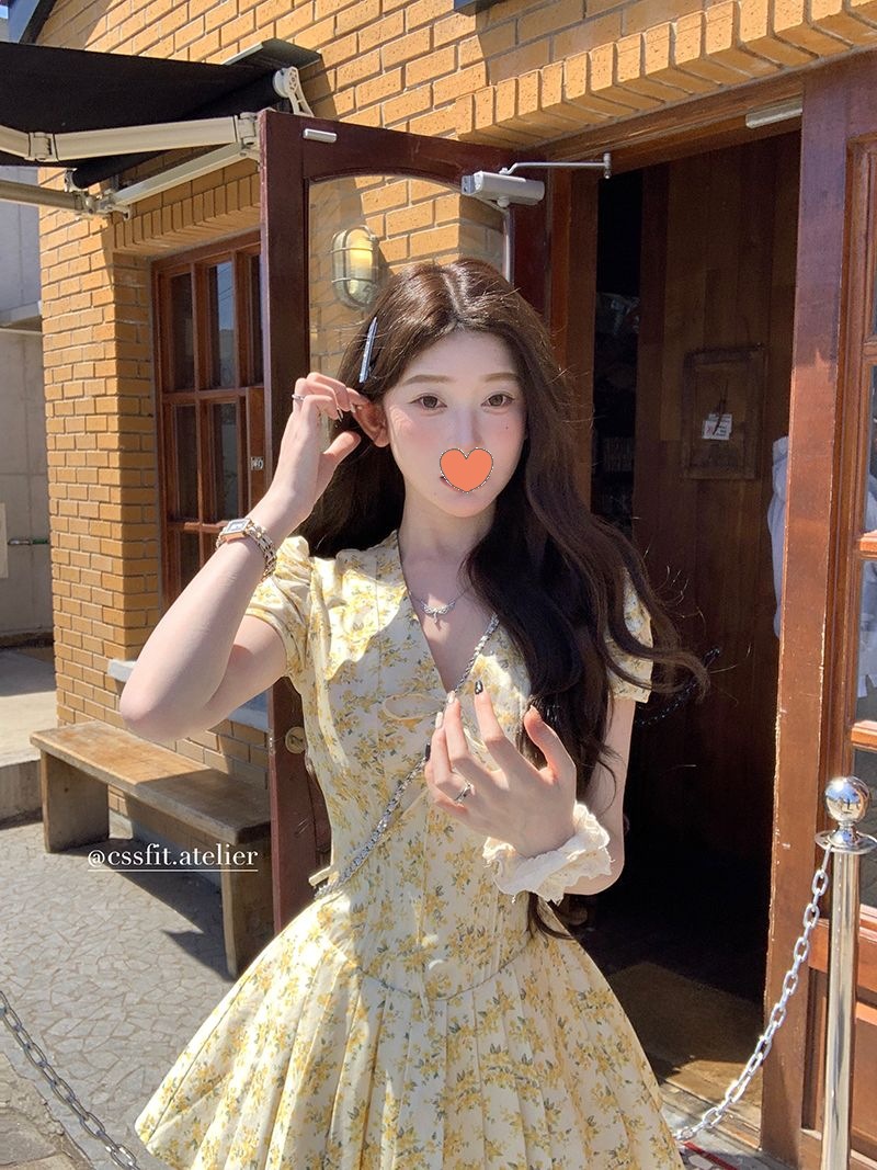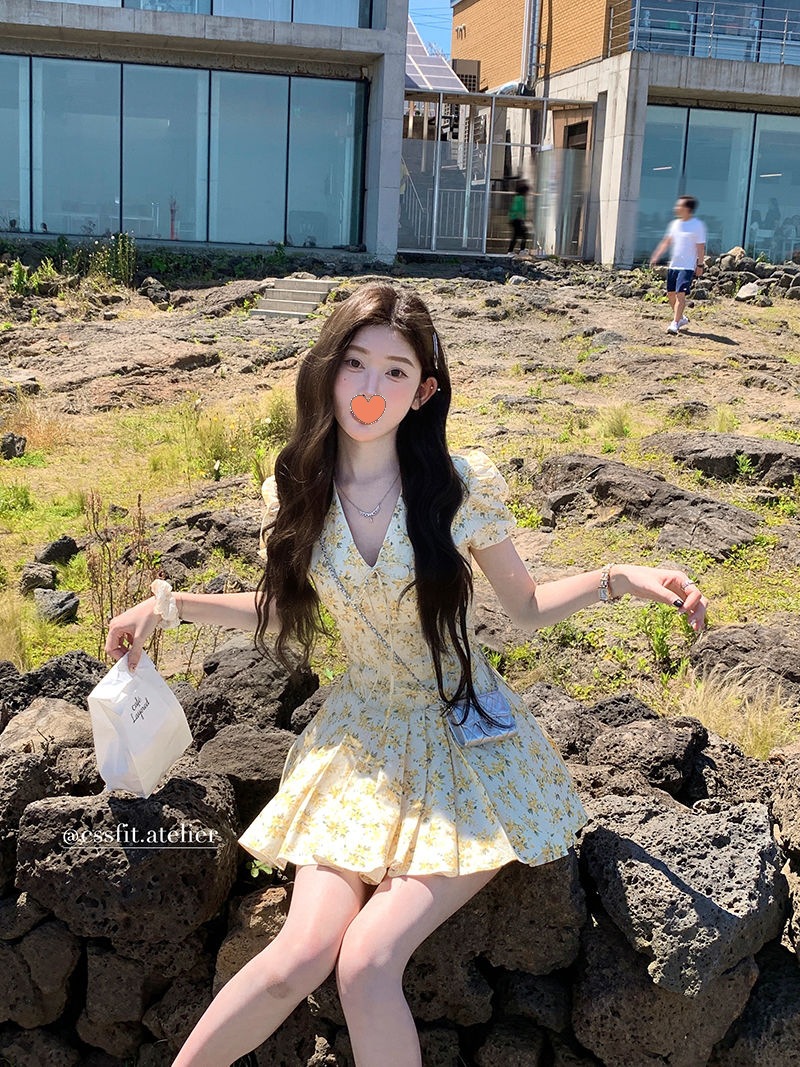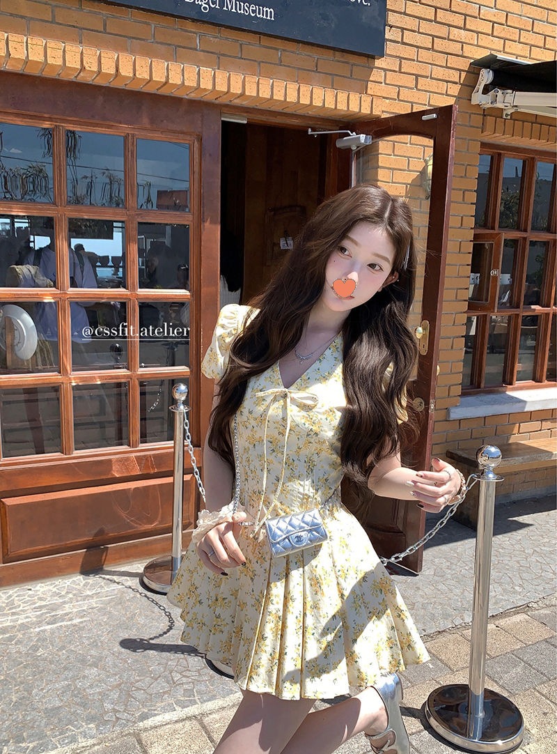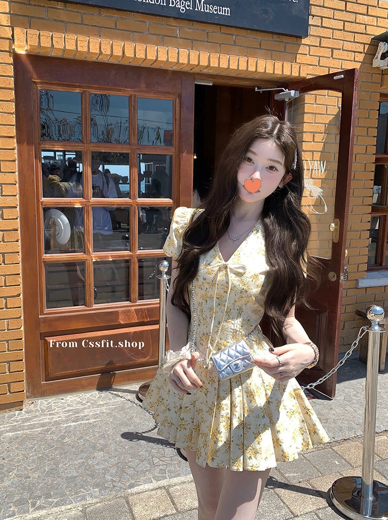 프랑스 달콤한 노란색 꽃 V 넥 원피스 여성 여름 디자인 타이트 허리 휴가 뜨거운 소녀 주름 치마