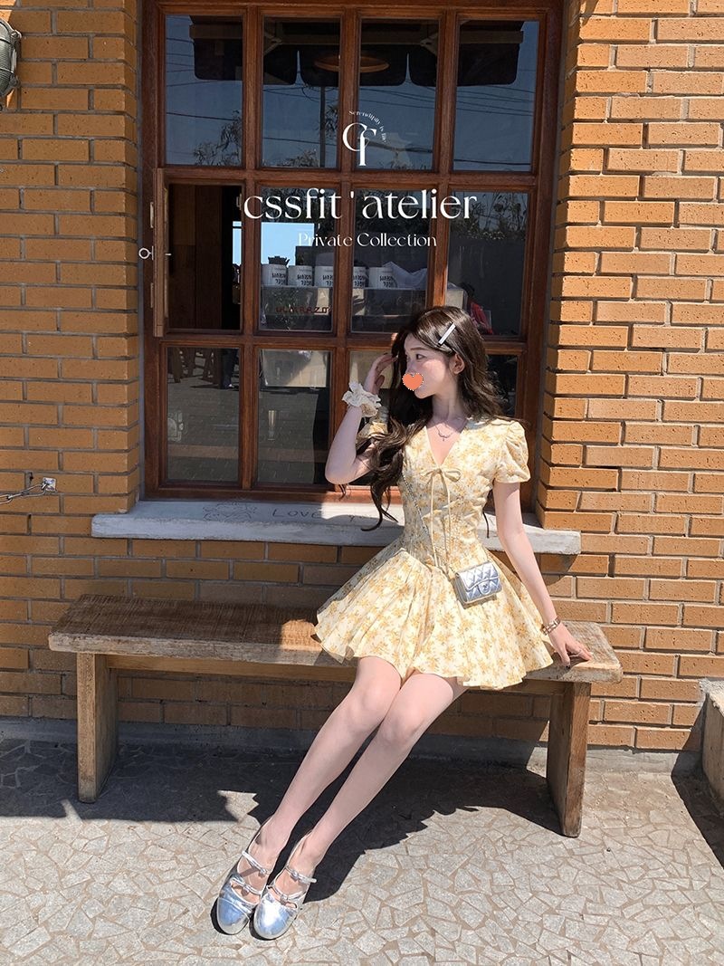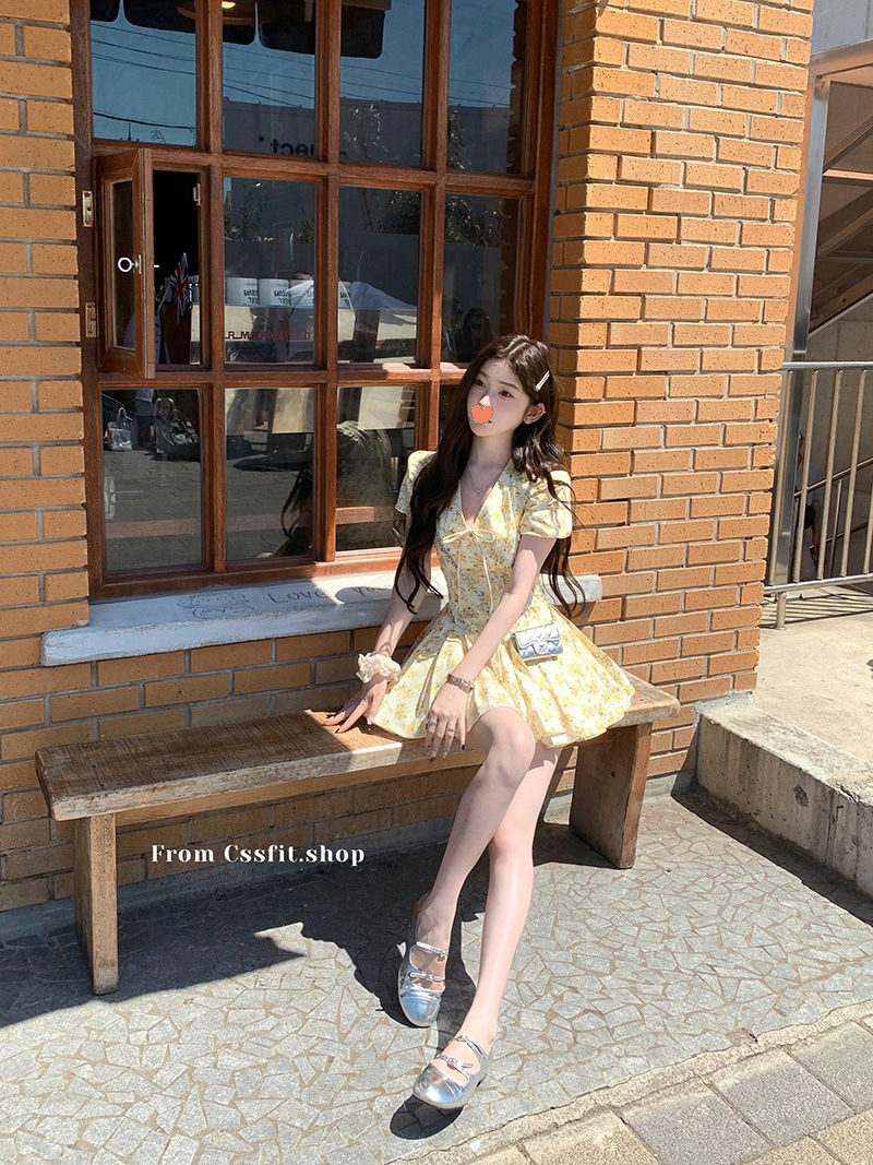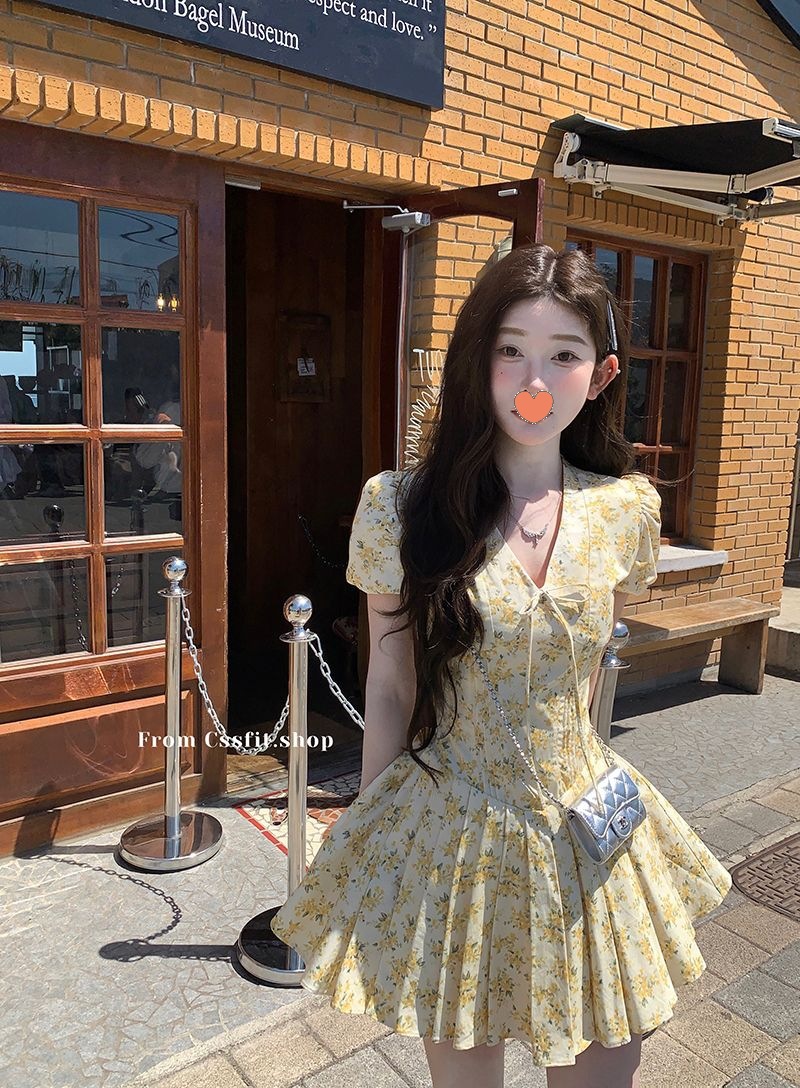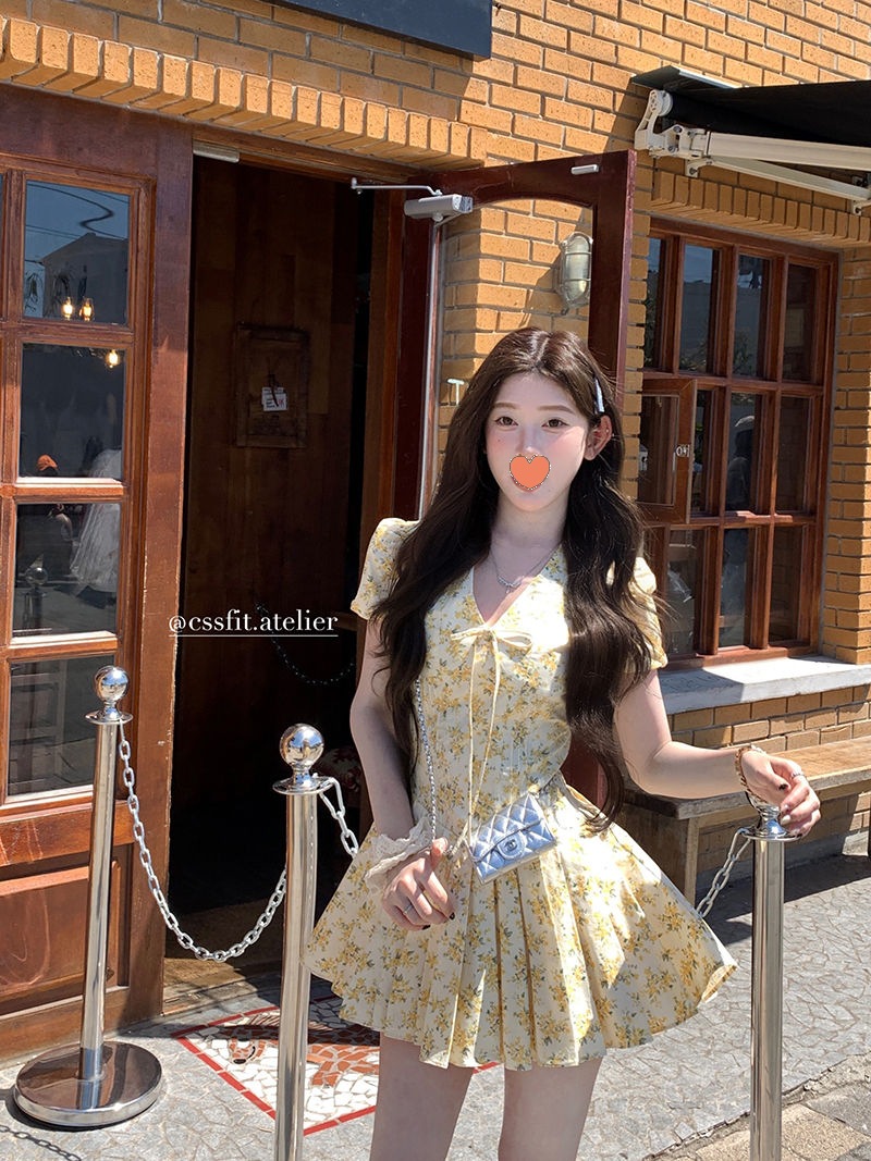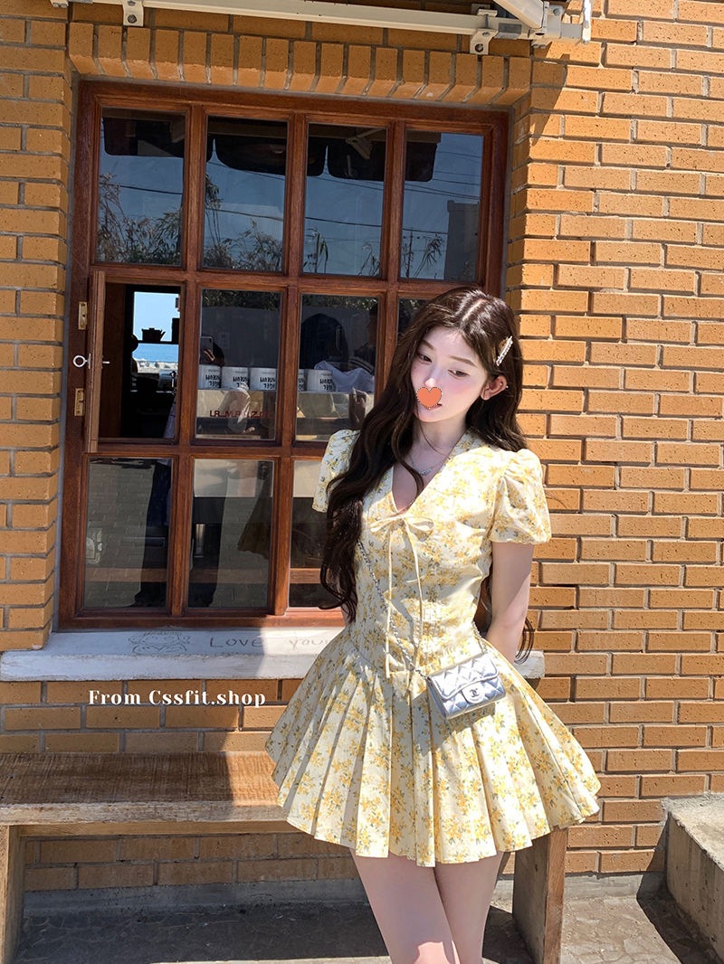 프랑스 달콤한 노란색 꽃 V 넥 원피스 여성 여름 디자인 타이트 허리 휴가 뜨거운 소녀 주름 치마