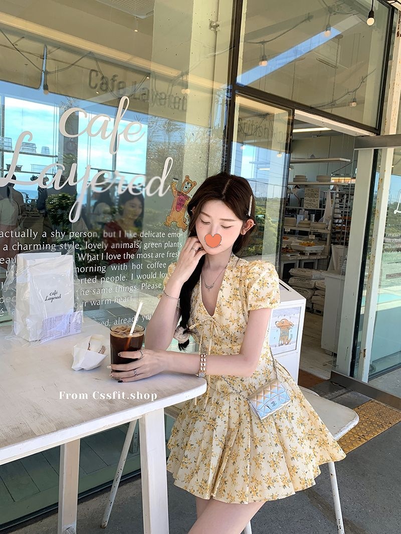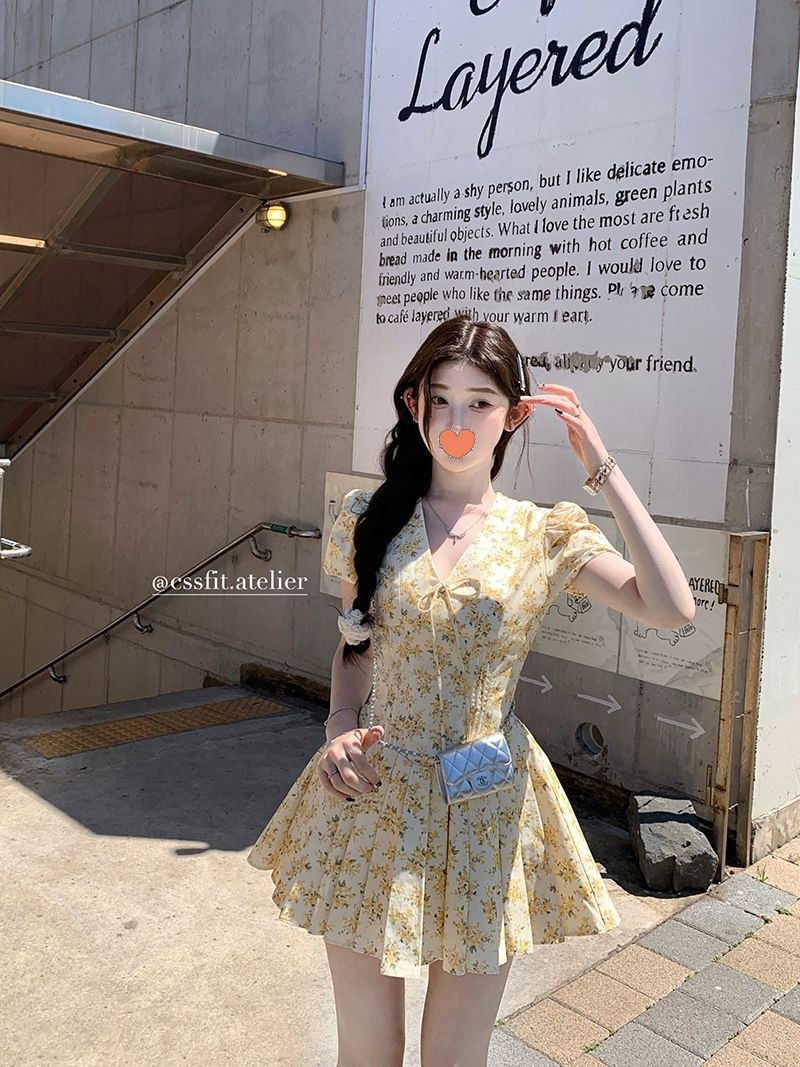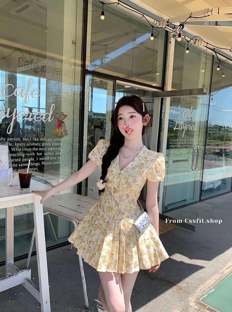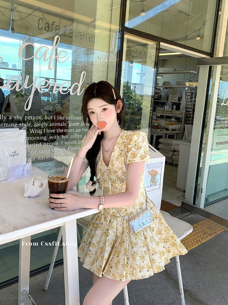 프랑스 달콤한 노란색 꽃 V 넥 원피스 여성 여름 디자인 타이트 허리 휴가 뜨거운 소녀 주름 치마스토어 가기