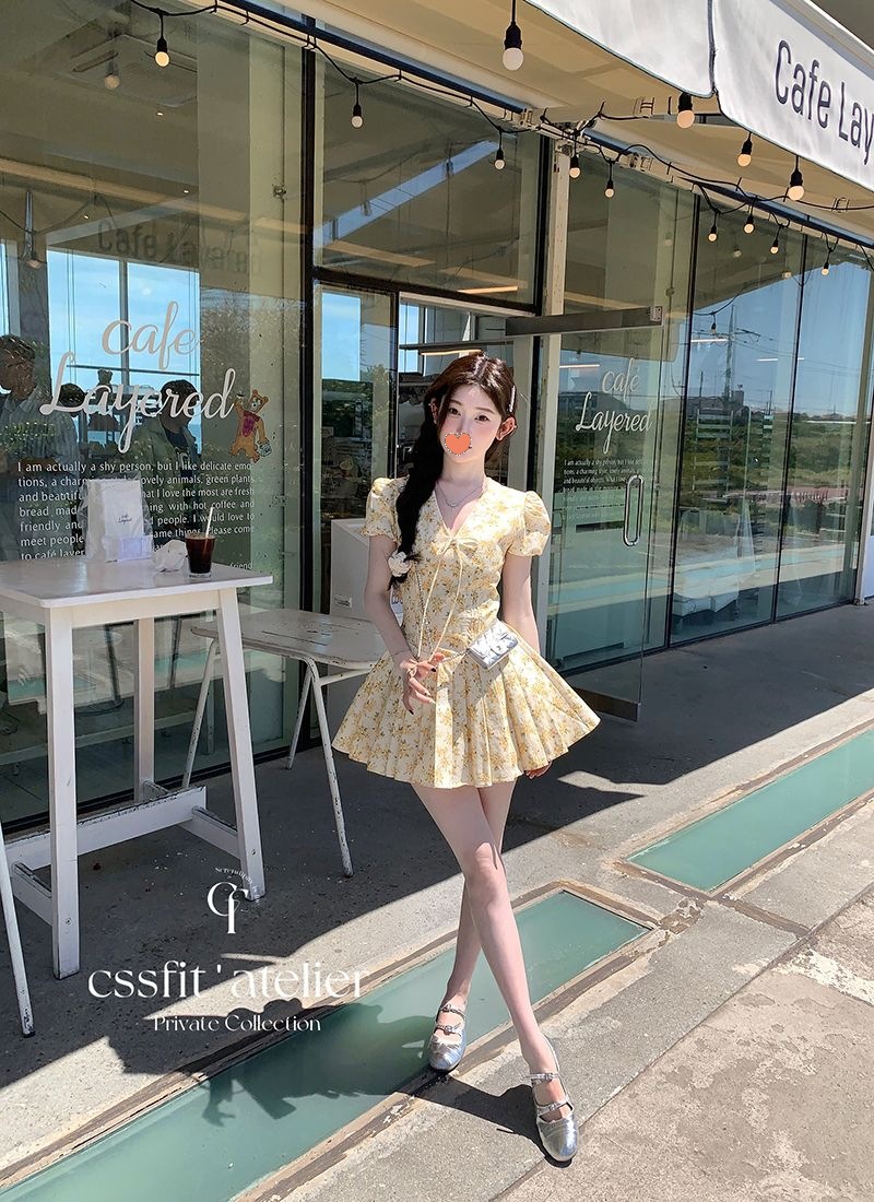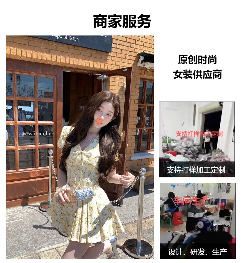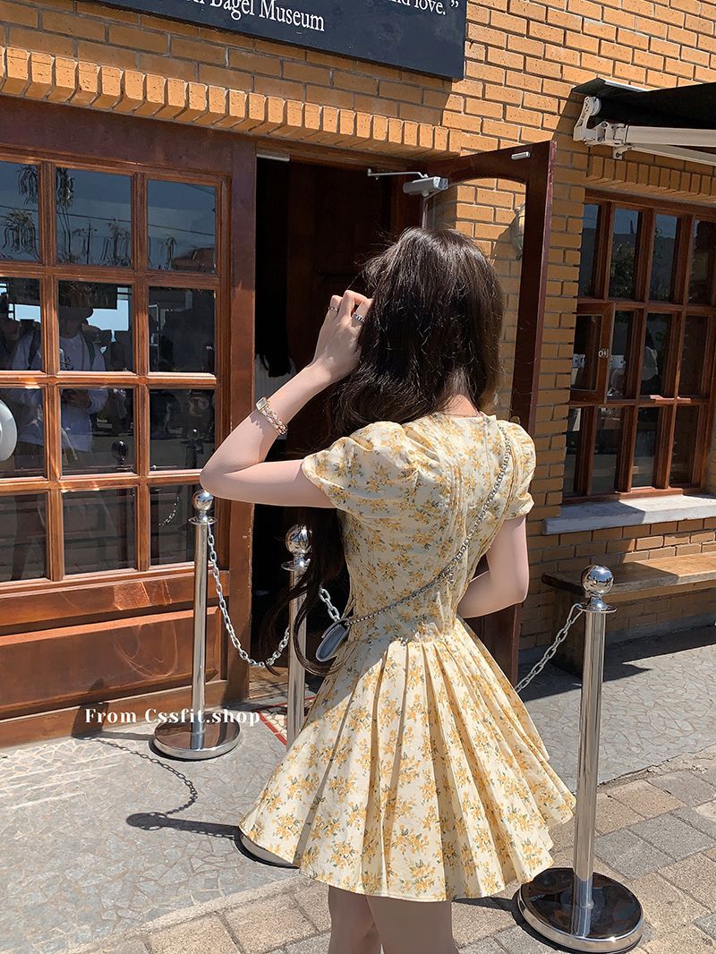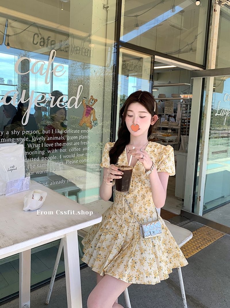 프랑스 달콤한 노란색 꽃 V 넥 원피스 여성 여름 디자인 타이트 허리 휴가 뜨거운 소녀 주름 치마스토어 가기