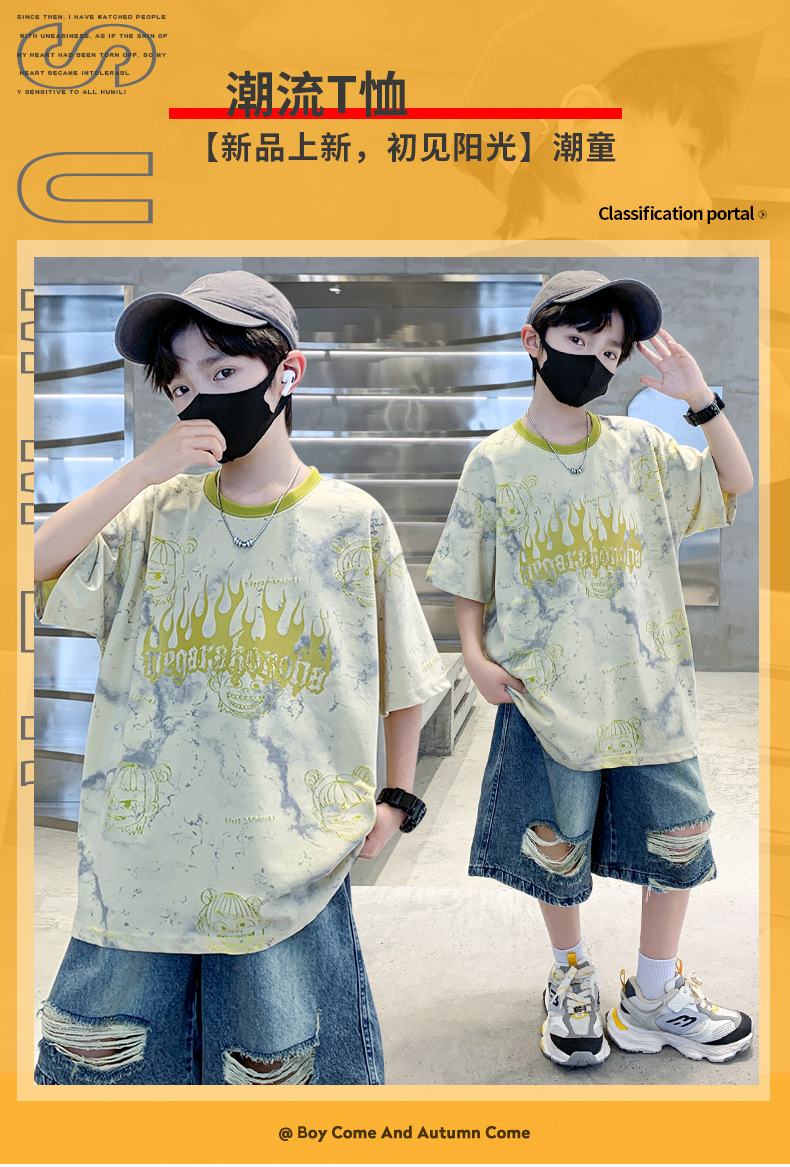 아동복 넥타이-염료 반소매 2025 신식 중대형 어린이 서양식 티셔츠 여름 어린이 느슨한 디자인 베이스 셔츠 8스토어 가기