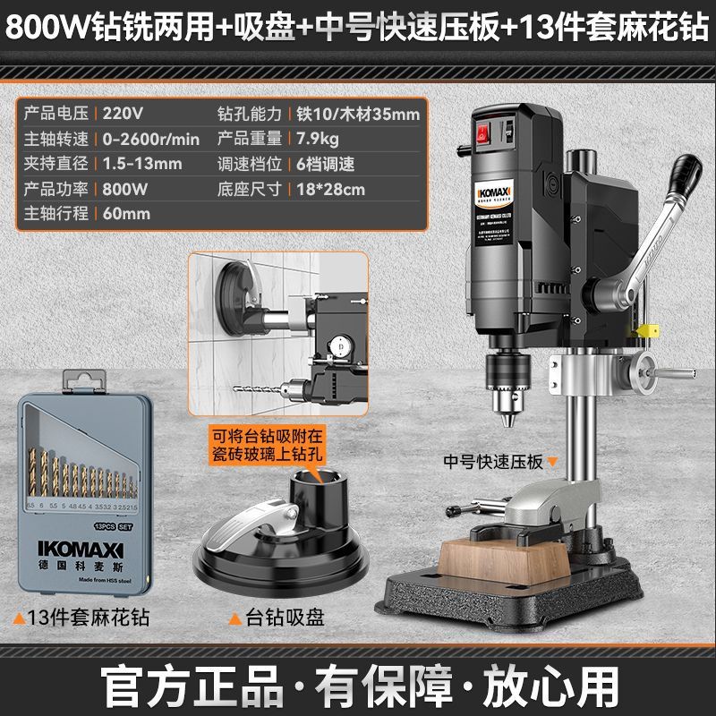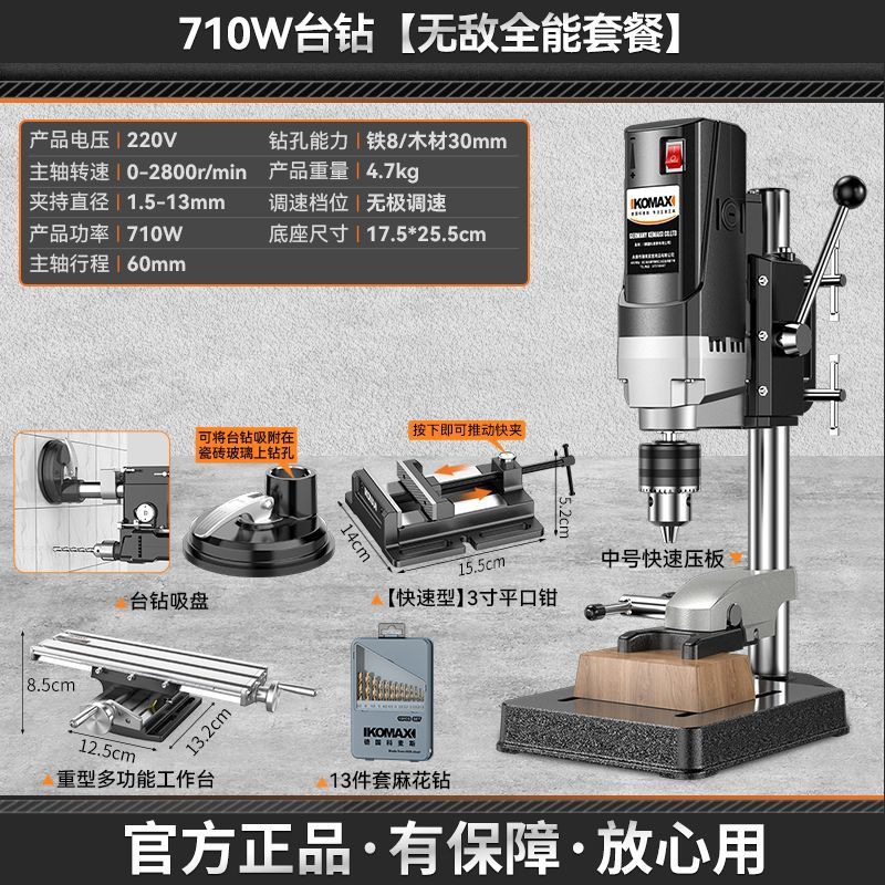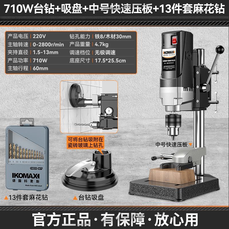 • 710W 벤치 드릴 + 흡입 컵 + 중형 퀵 프레스 플레이트 + 드릴