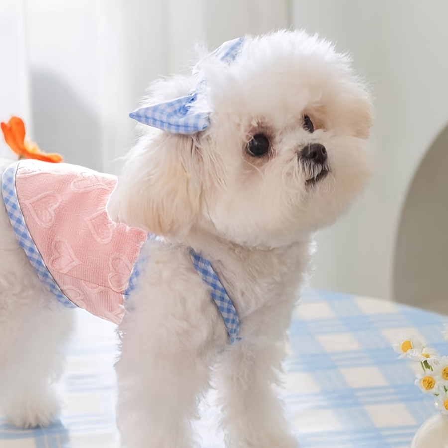 봄 여름 얇은 소재 반려동물 엠보싱 하트 끈 머리핀 세트 귀여운 강아지 옷 반팔 조끼 트렌디 브랜드