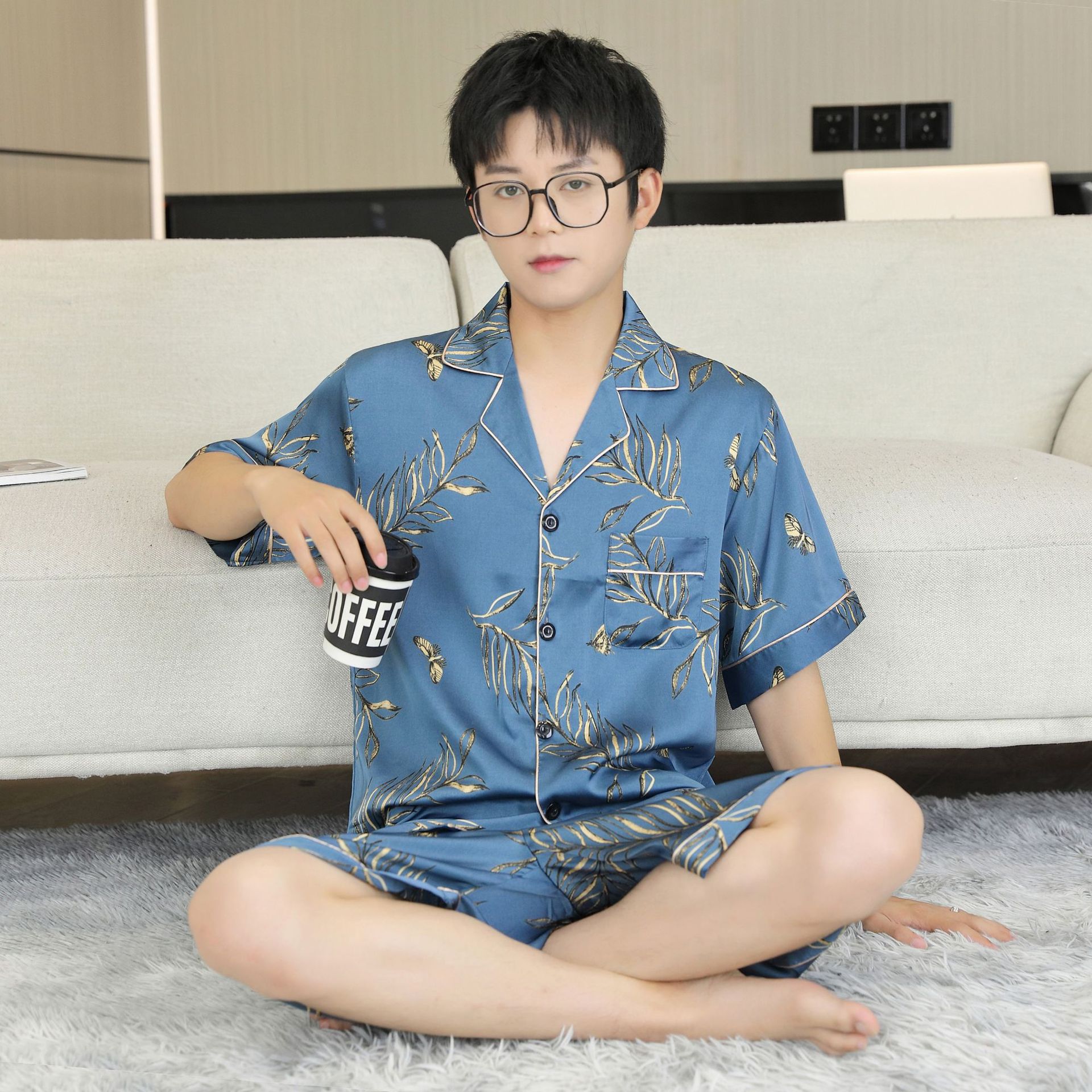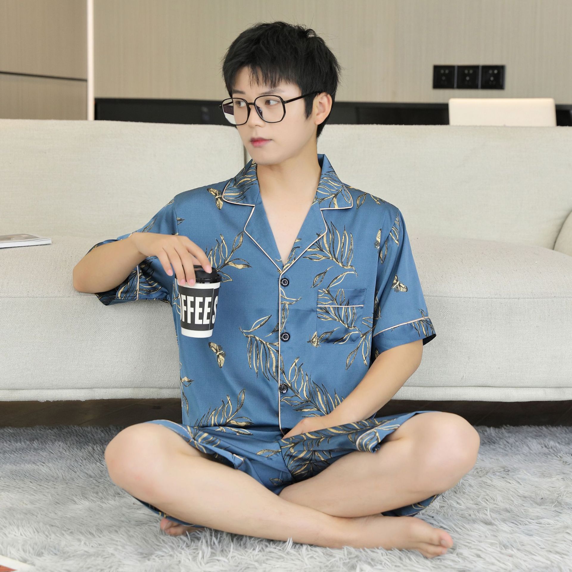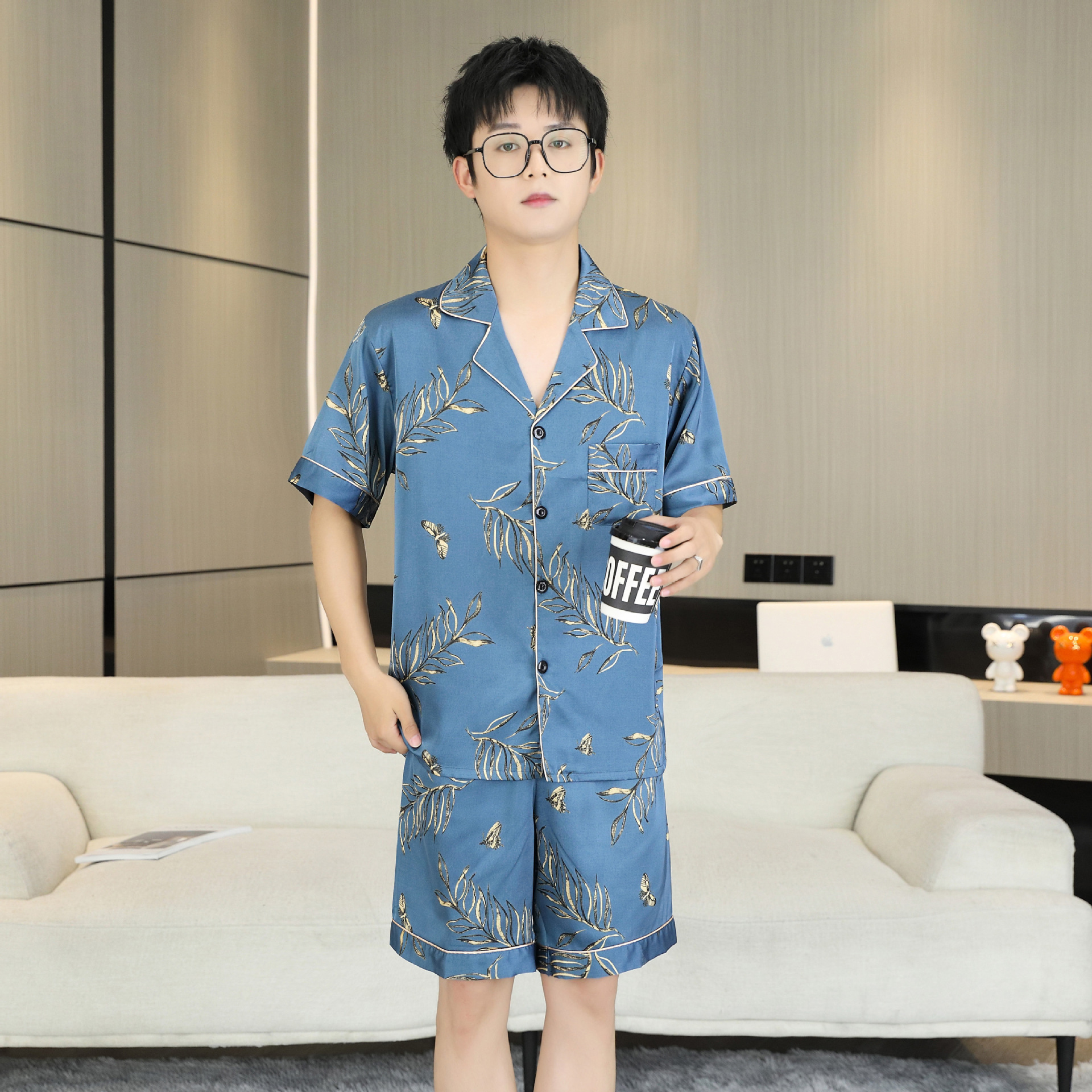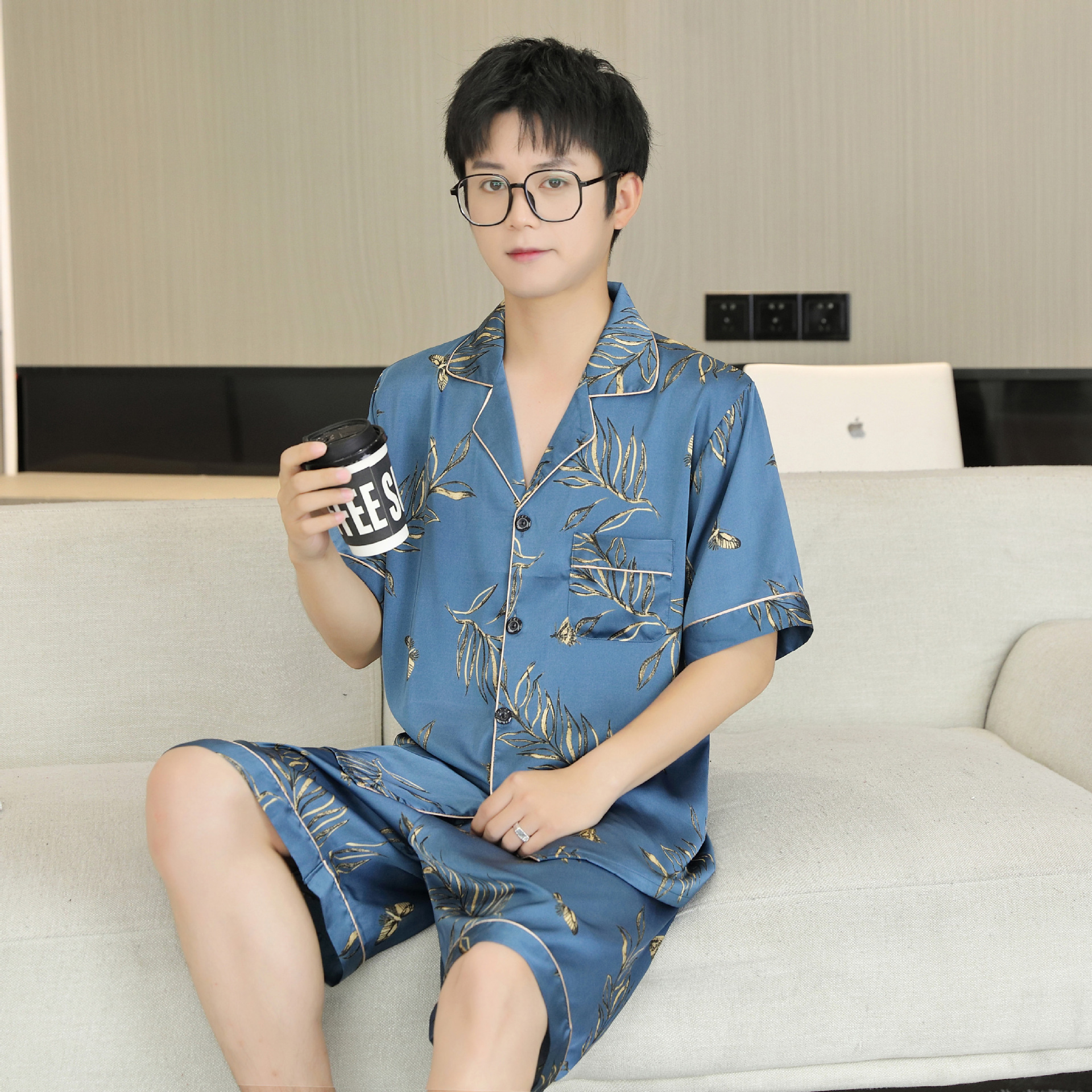 남성용 아이스 실크 잠옷, 여름용 얇은 반팔 반바지 투피스 세트, 가정복, 가디건, 큰 사이즈, 집에서나 밖에서 입을 수 있음