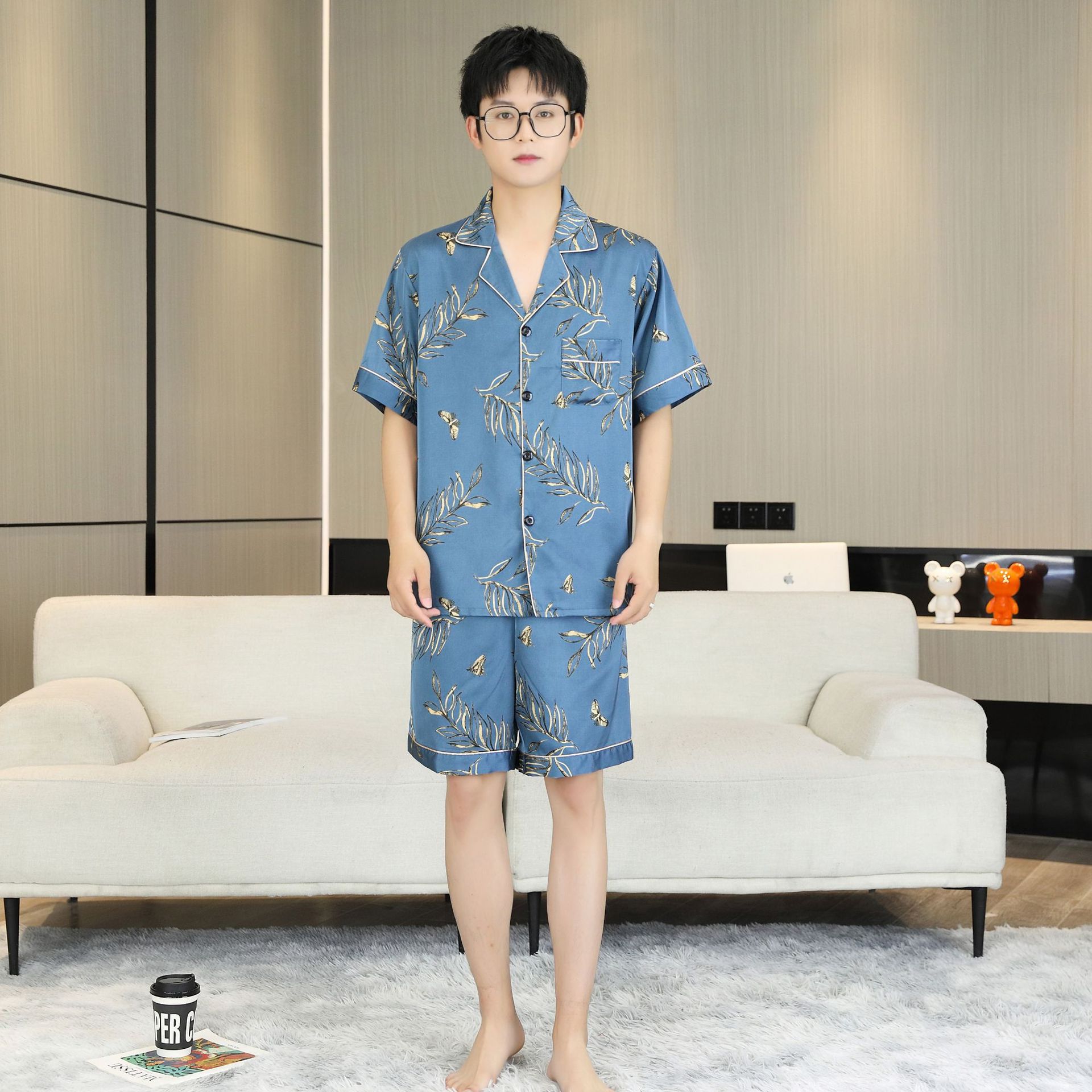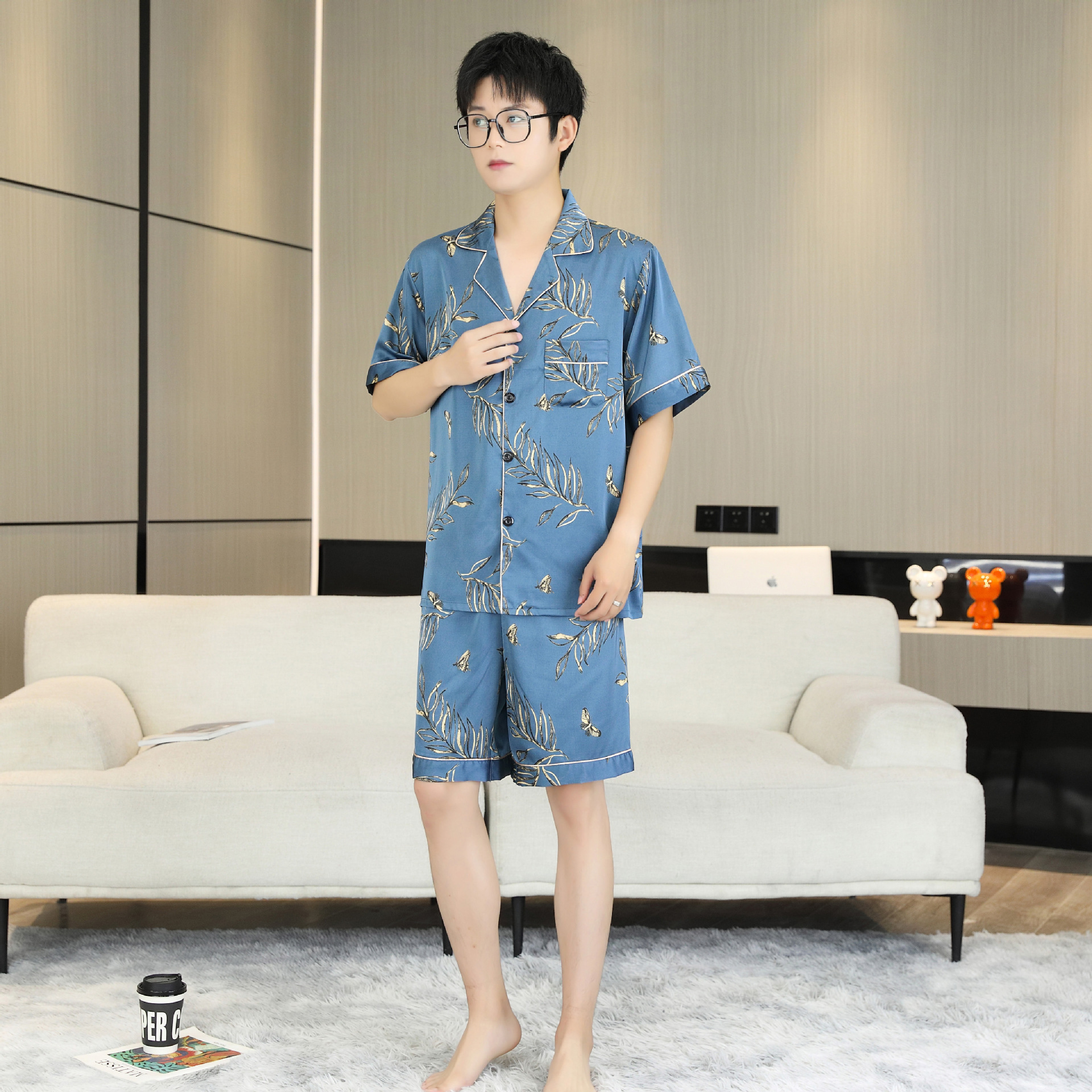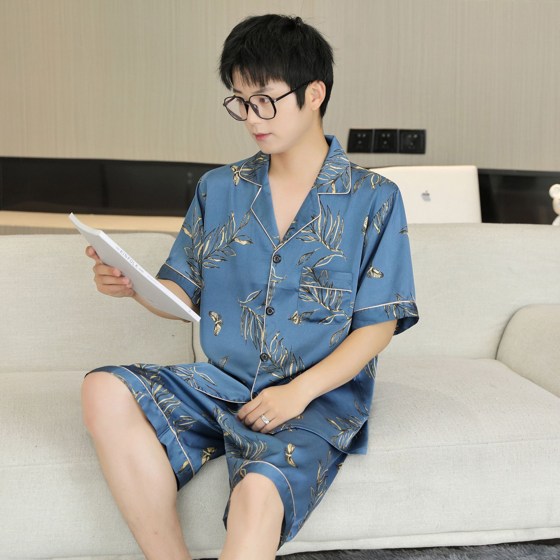 남성용 아이스 실크 잠옷, 여름용 얇은 반팔 반바지 투피스 세트, 가정복, 가디건, 큰 사이즈, 집에서나 밖에서 입을 수 있음
