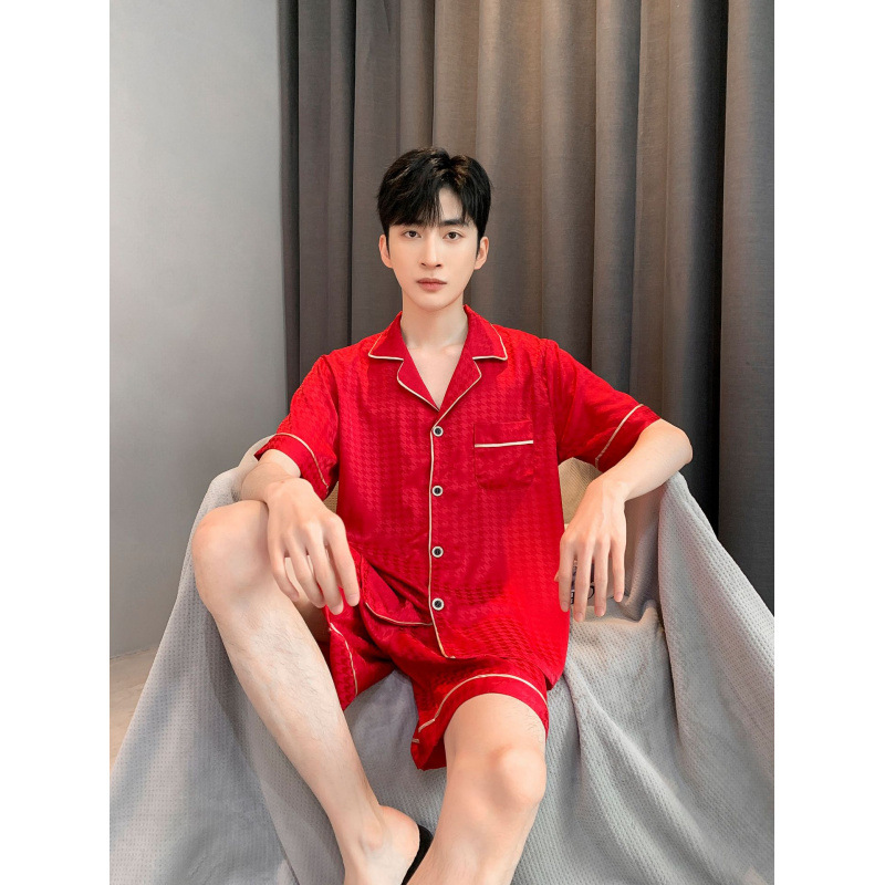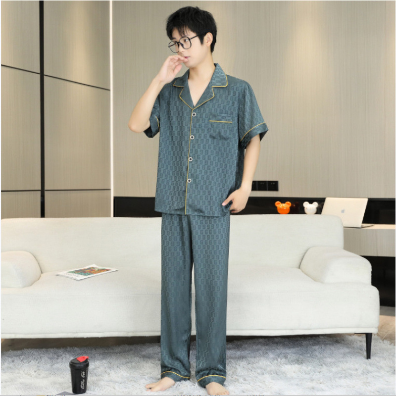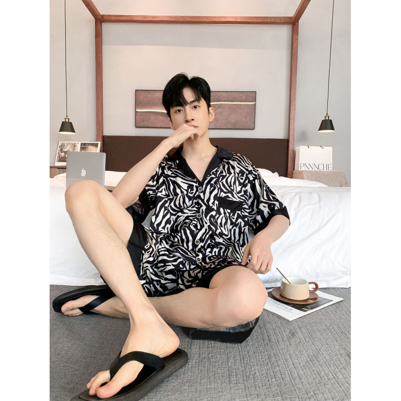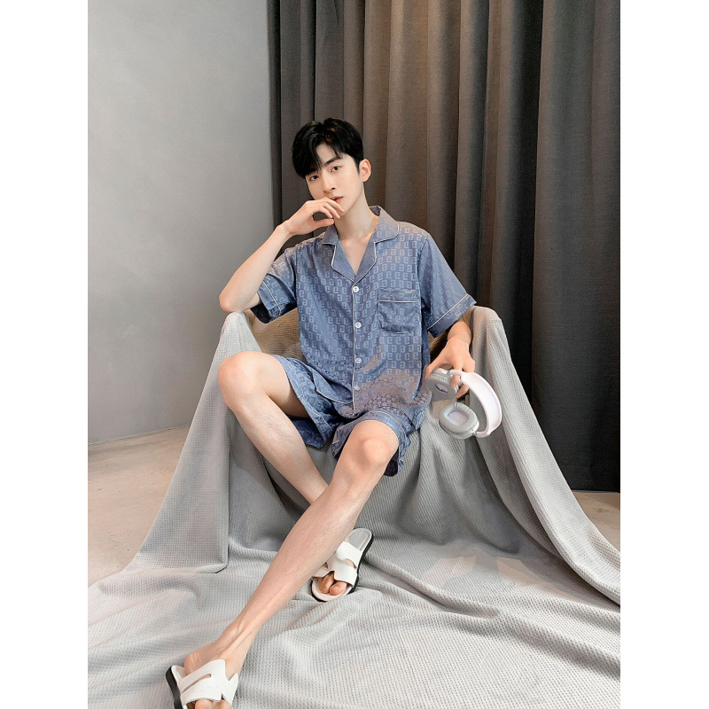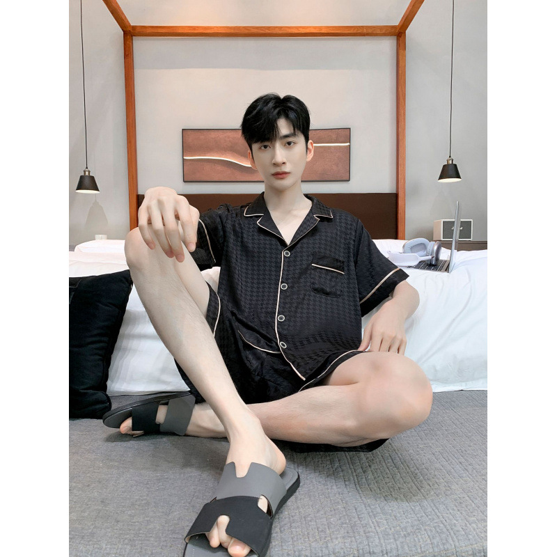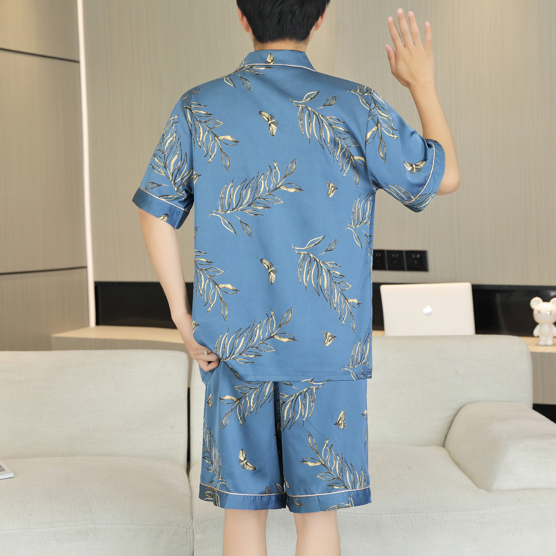 남성용 아이스 실크 잠옷, 여름용 얇은 반팔 반바지 투피스 세트, 가정복, 가디건, 큰 사이즈, 집에서나 밖에서 입을 수 있음