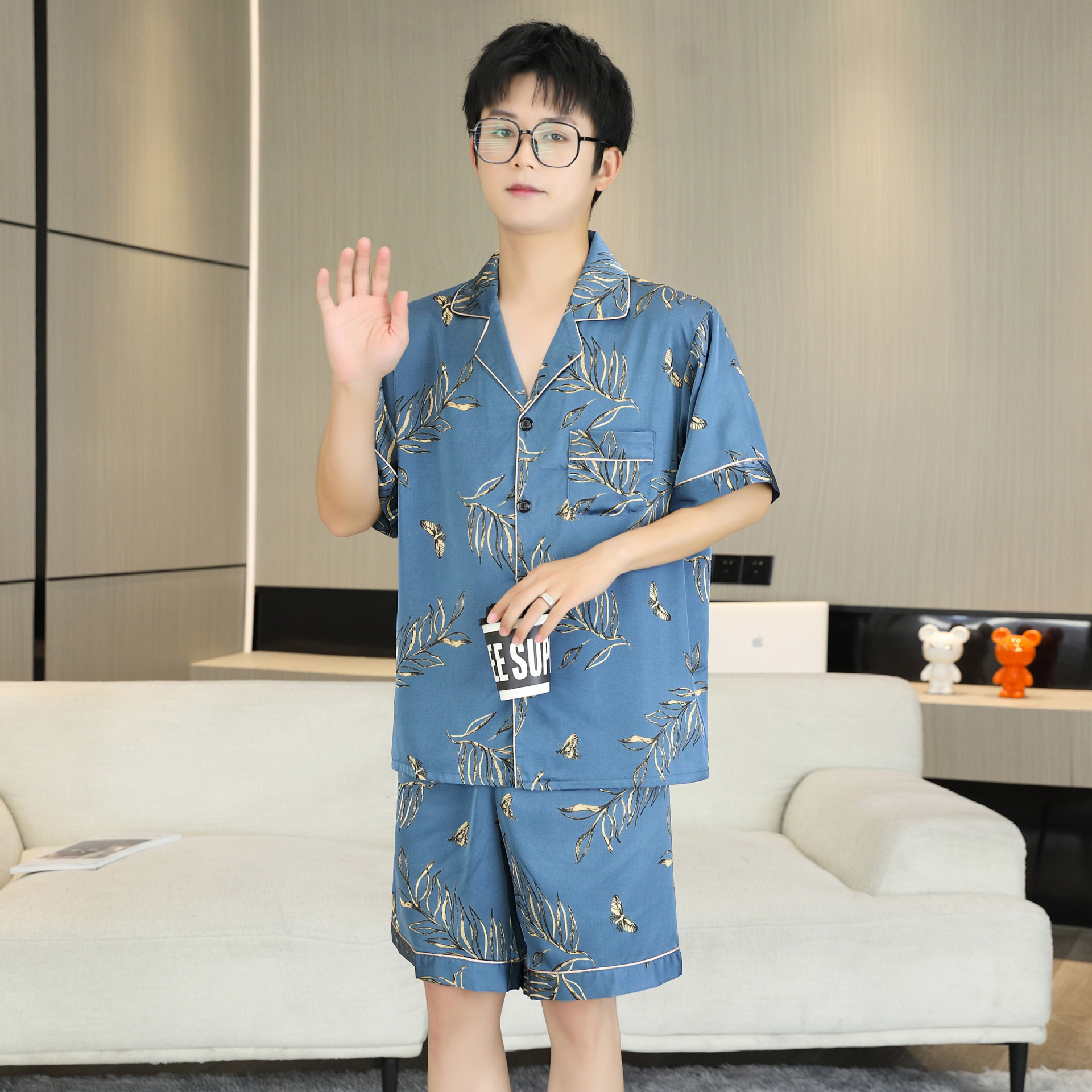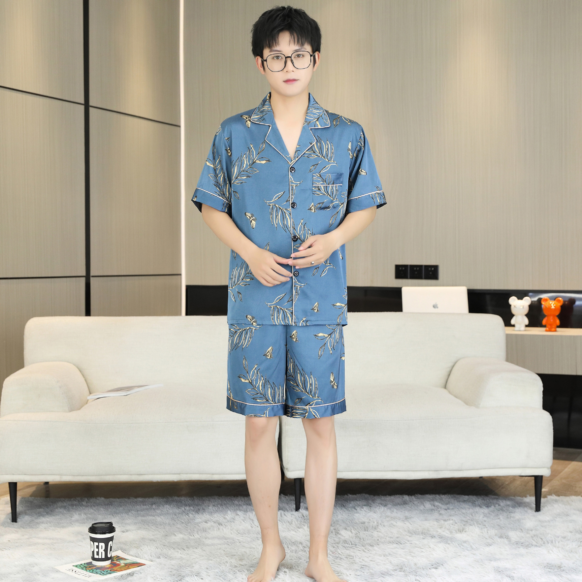 남성용 아이스 실크 잠옷, 여름용 얇은 반팔 반바지 투피스 세트, 가정복, 가디건, 큰 사이즈, 집에서나 밖에서 입을 수 있음스토어 가기