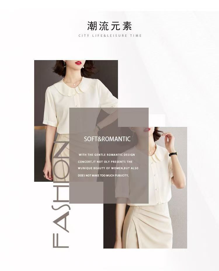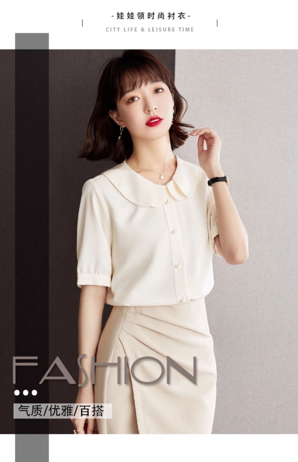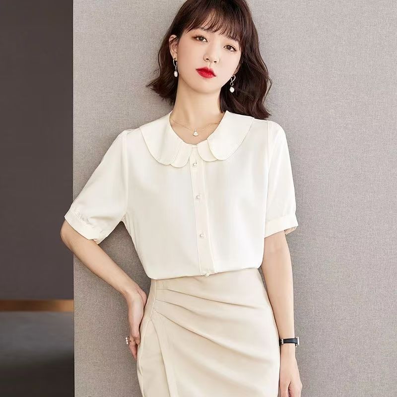 여성을위한 인형 칼라 반팔 쉬폰 셔츠 2025 여름 신작 스타 같은 스타일 패션 달콤한 솔리드 컬러 슬림 셔츠스토어 가기