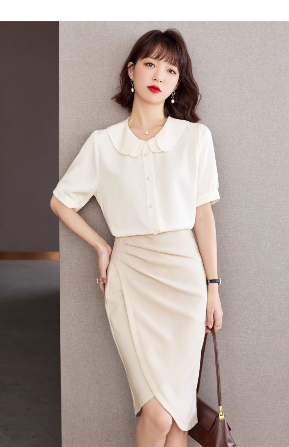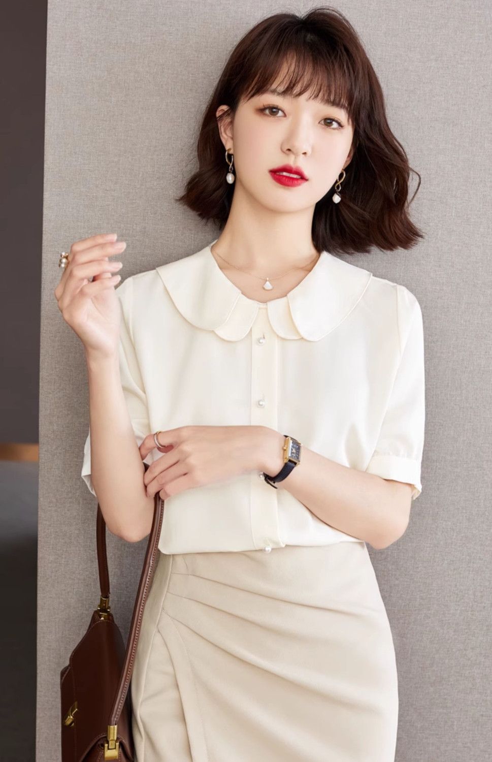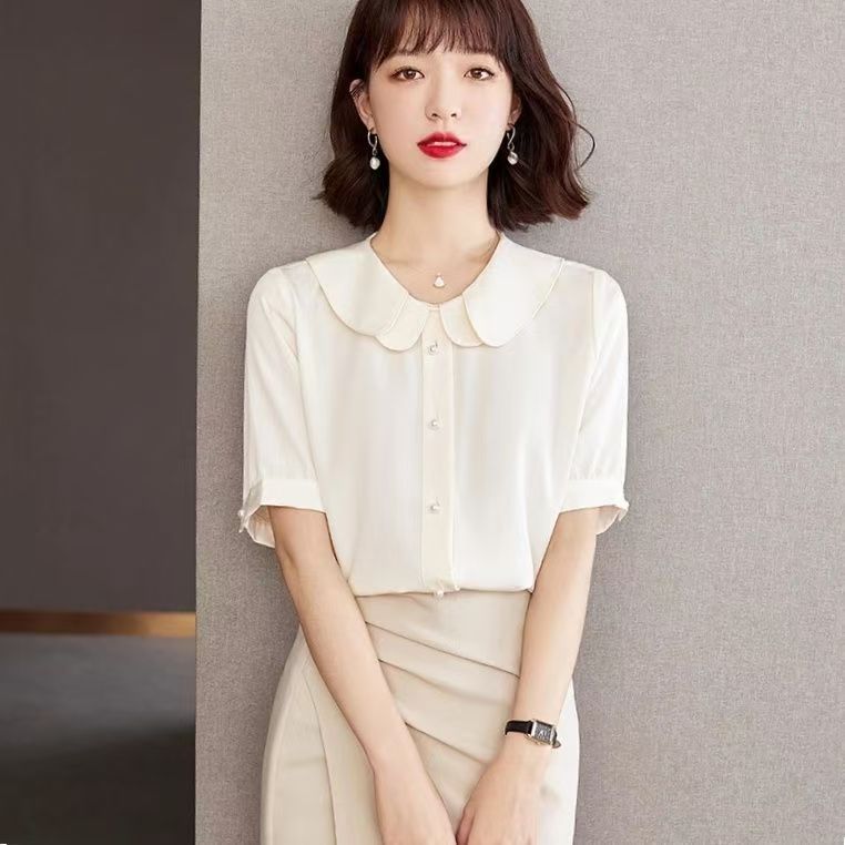 여성을위한 인형 칼라 반팔 쉬폰 셔츠 2025 여름 신작 스타 같은 스타일 패션 달콤한 솔리드 컬러 슬림 셔츠